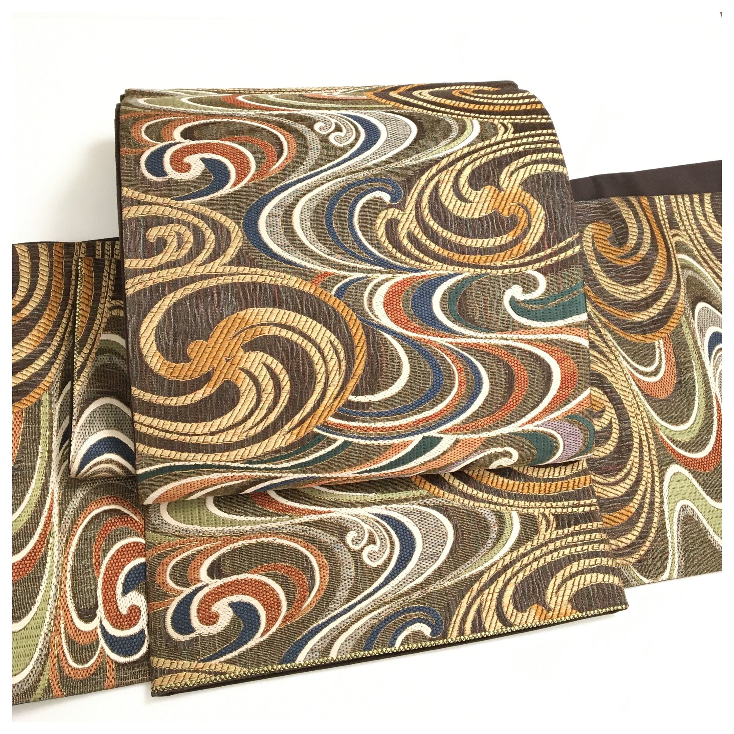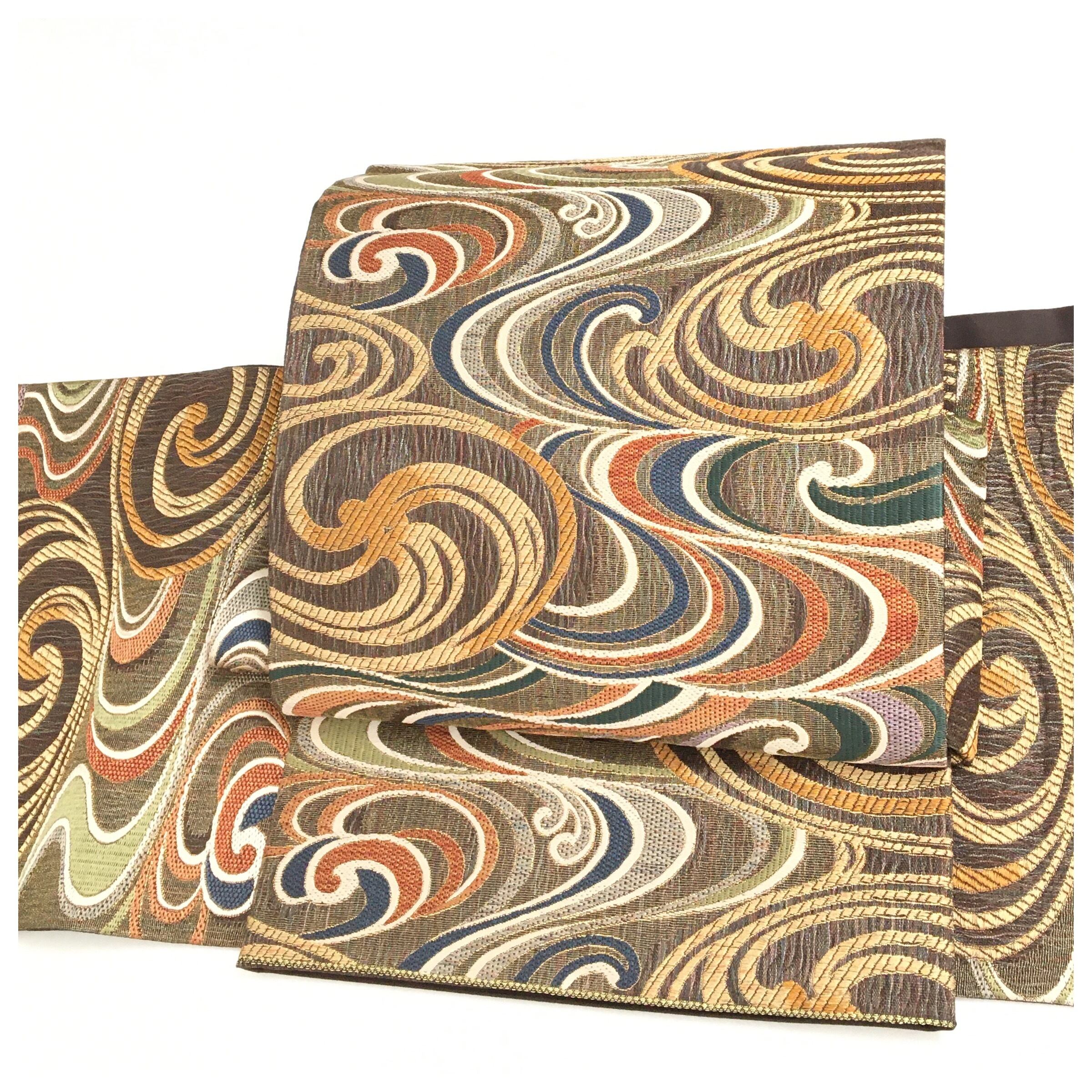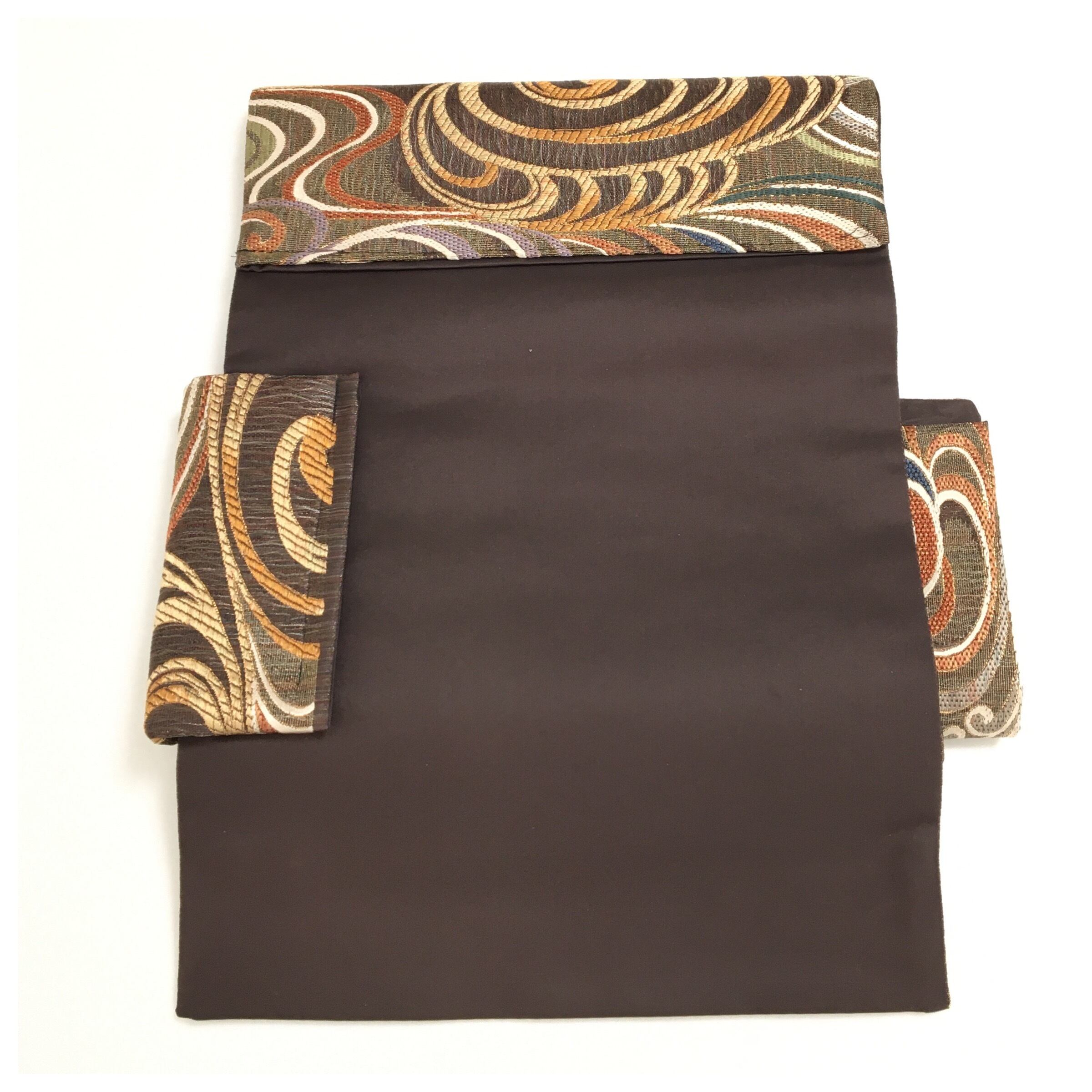 美品 未使用 正絹 楽帯 高級呉服 袋帯 焦げ茶 渦模様 二部式 二重太鼓 作り帯 です。