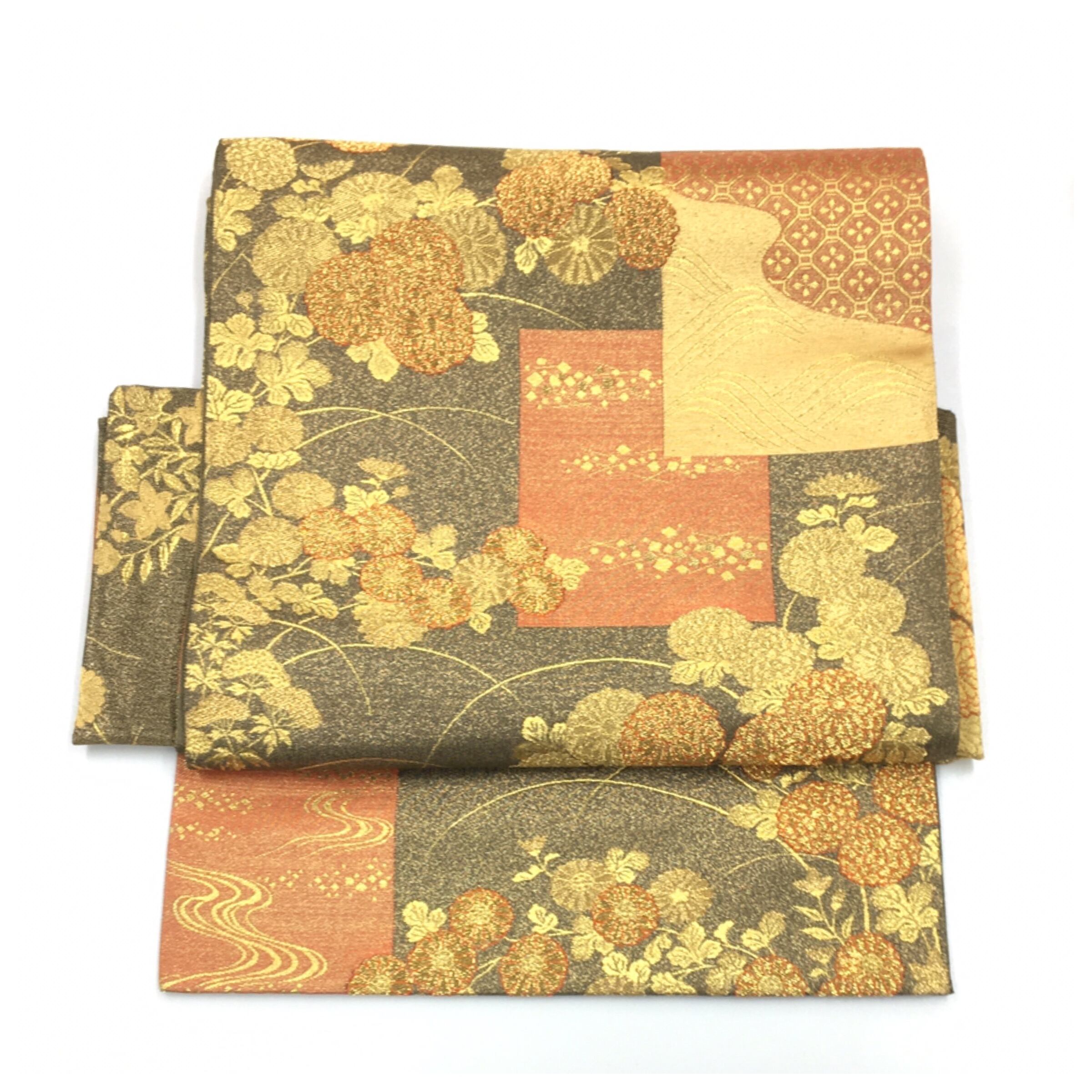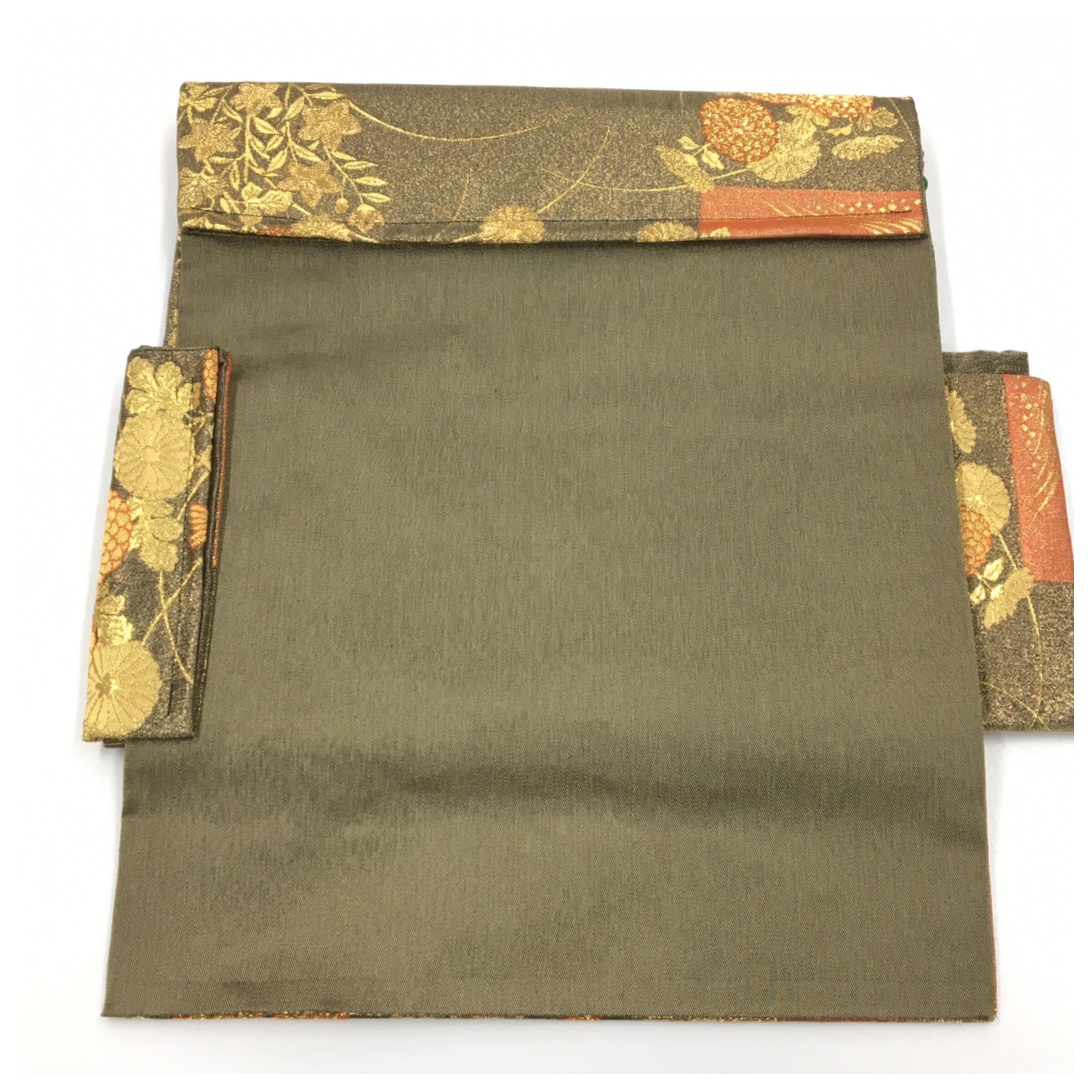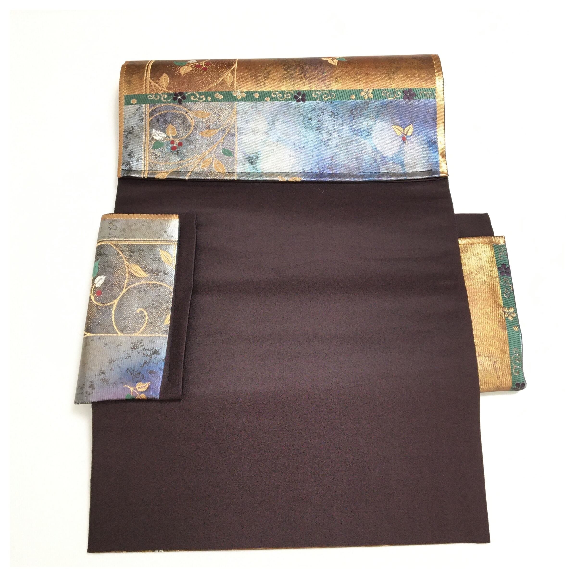美品 未使用 正絹 楽帯 袋帯 金茶 蔦模様 二部式 二重太鼓 作り帯 です。
