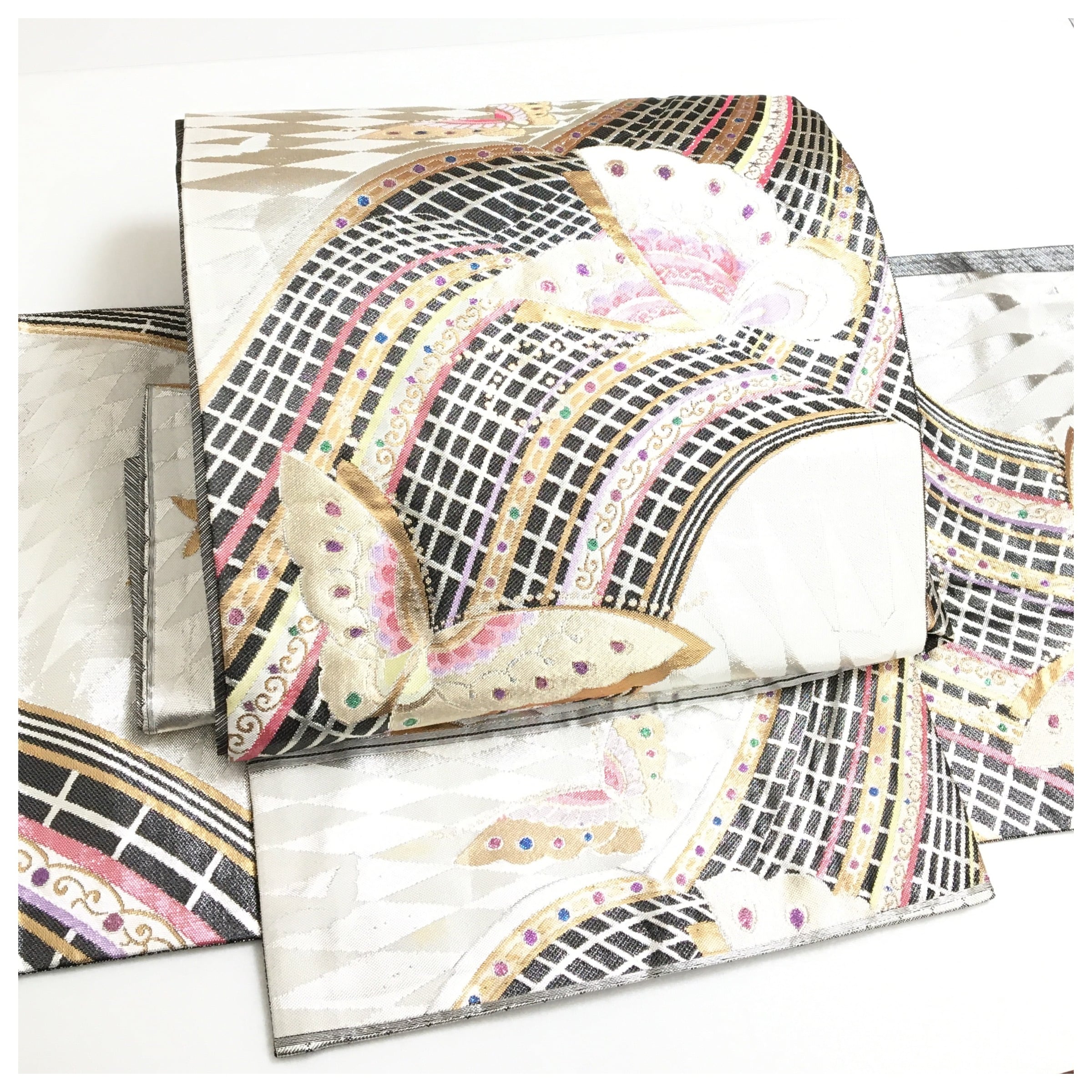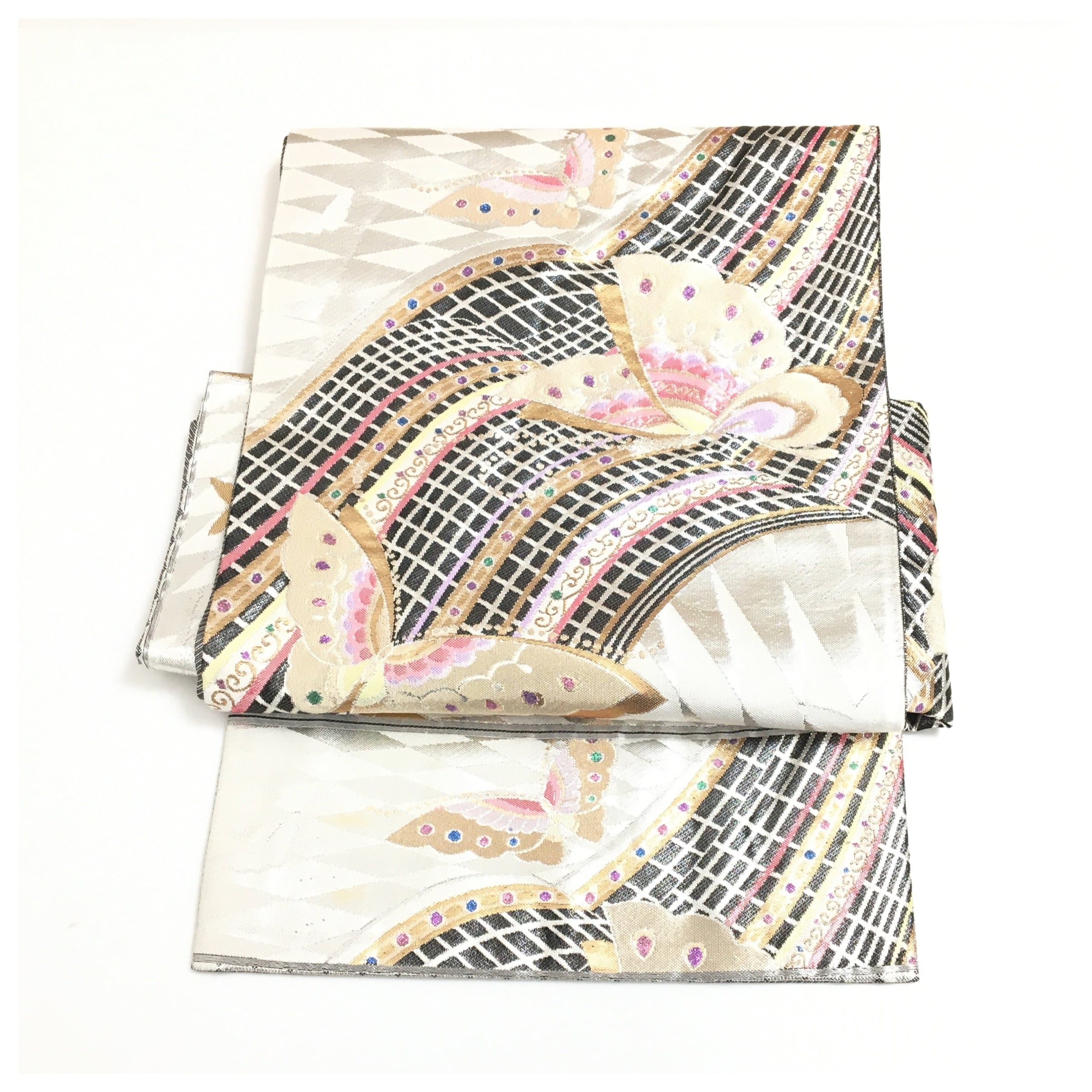 正絹 楽帯 袋帯 蝶々 シルバーブラック 二部式 二重太鼓 作り帯 です。