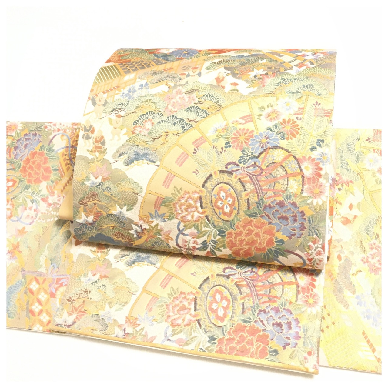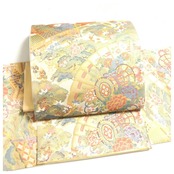 美品 正絹 付け帯 楽帯 クリーム 鼓 扇 二部式 二重太鼓 作り帯 です。
