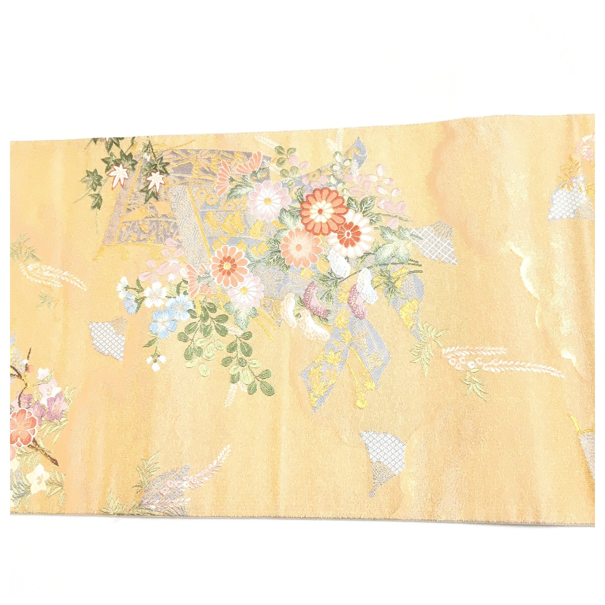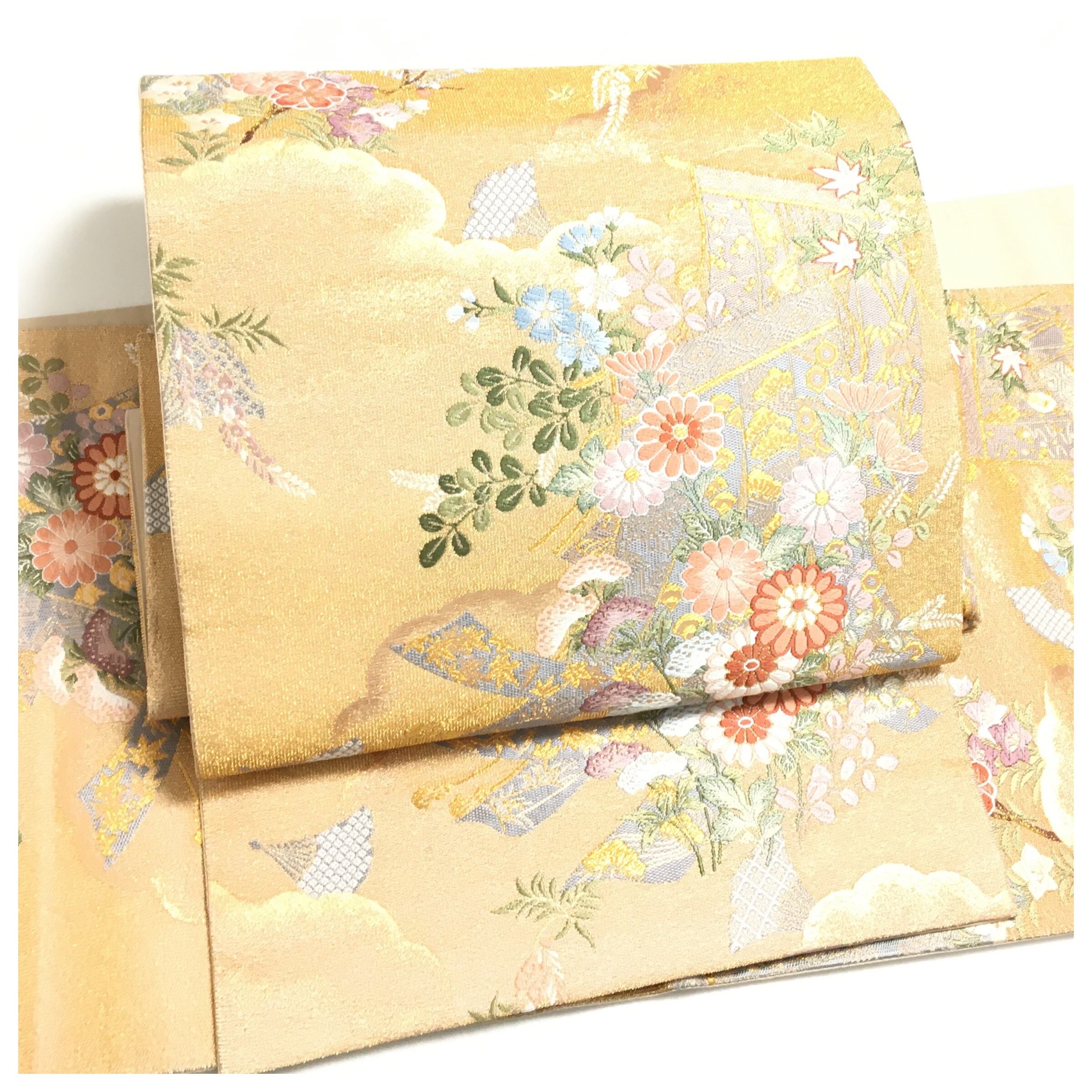 美品 正絹 付け帯 楽帯 ベージュゴールド 華 二部式 二重太鼓 作り帯 です。