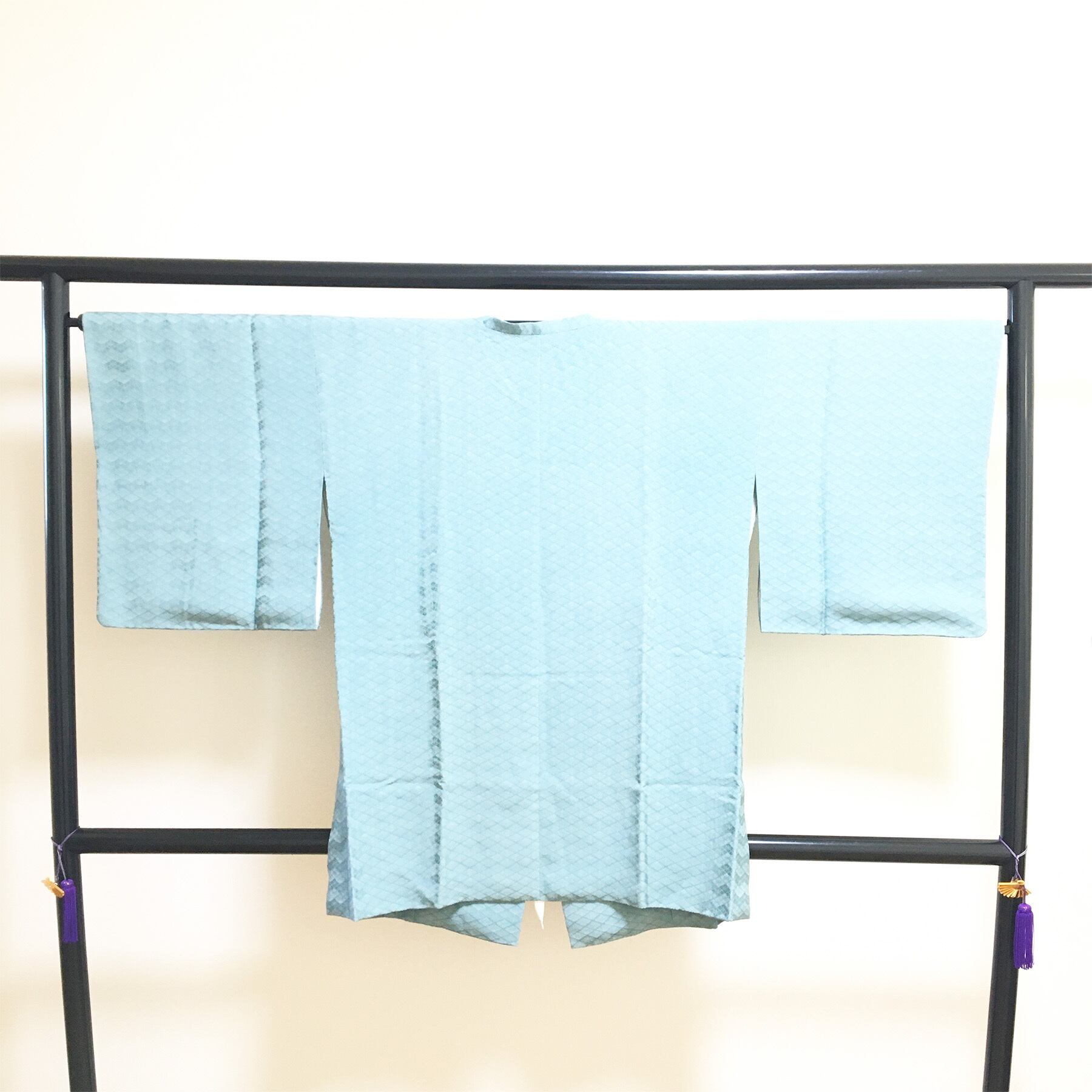 明るいグリーン色の色無地で地紋に菱をデザインした道行コートです。