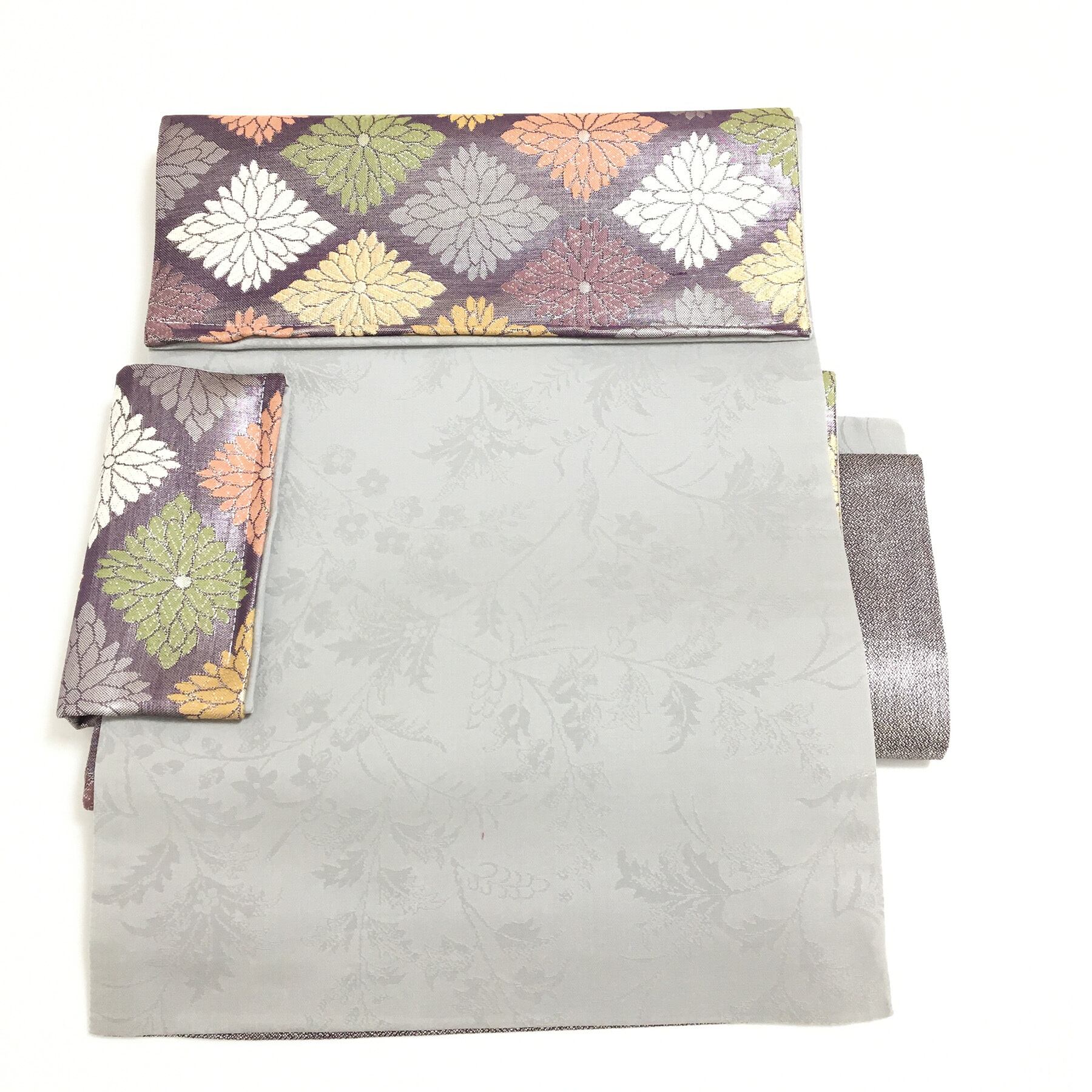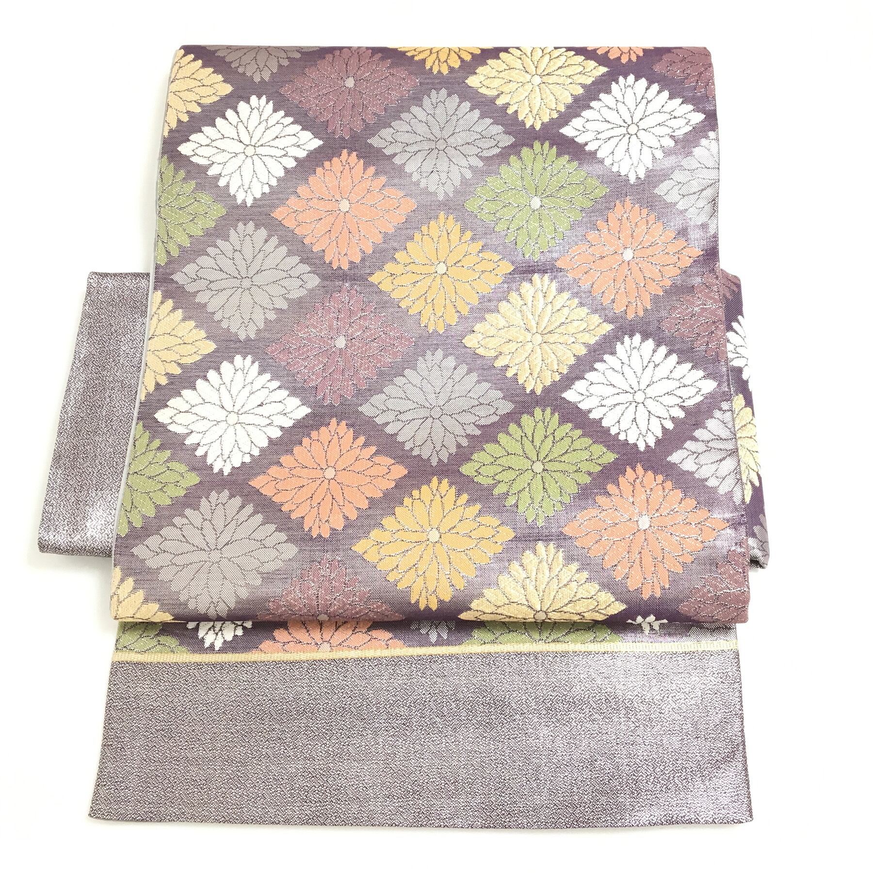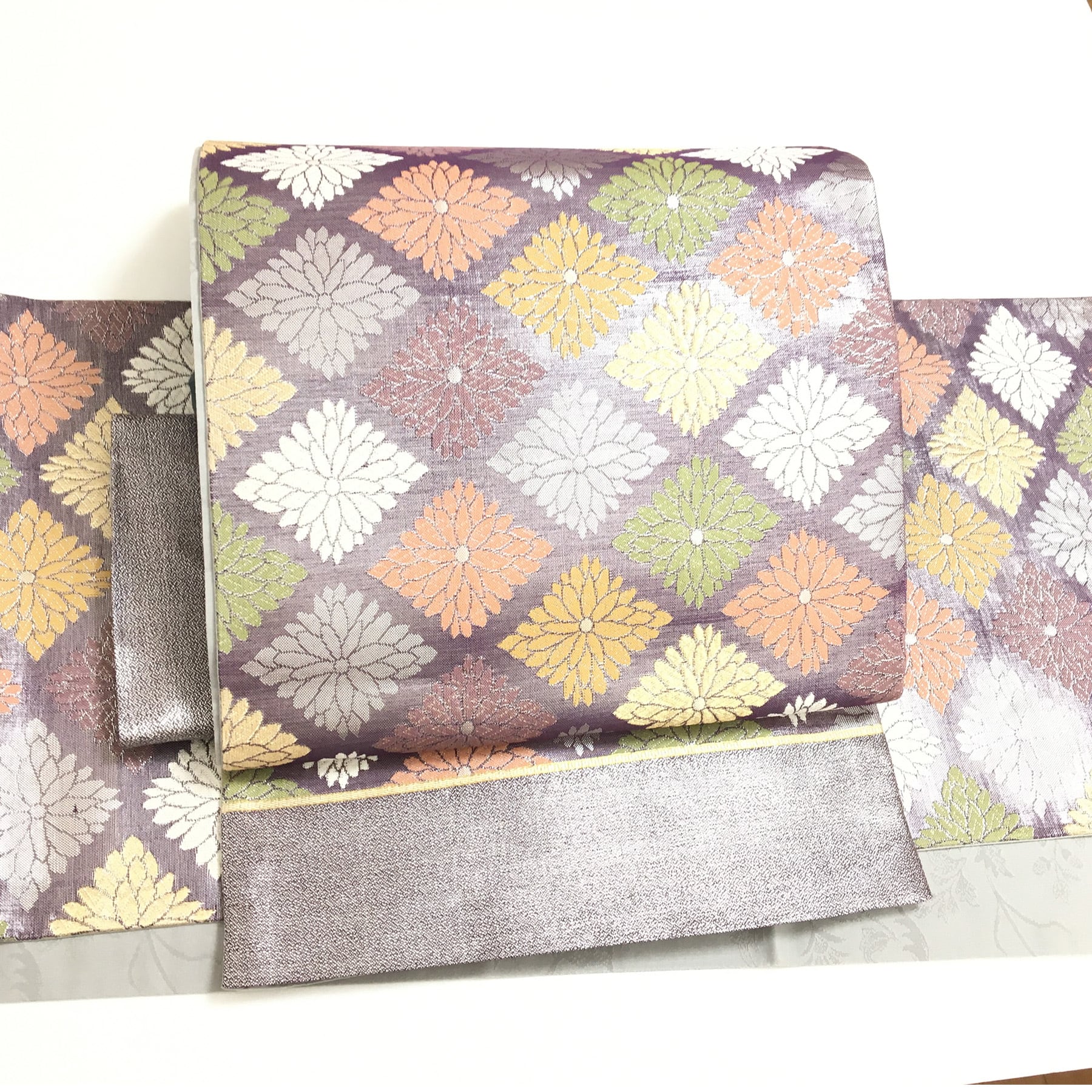 正絹 付け帯 楽帯 紫 菊 菱紋 二部式 二重太鼓 作り帯 です。