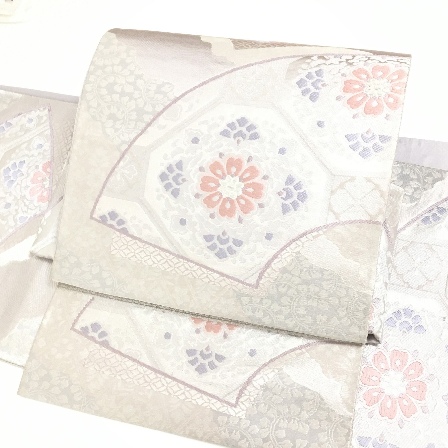 正絹 付け帯 楽帯 シルバー 扇面 華模様 二部式 二重太鼓 作り帯 です。