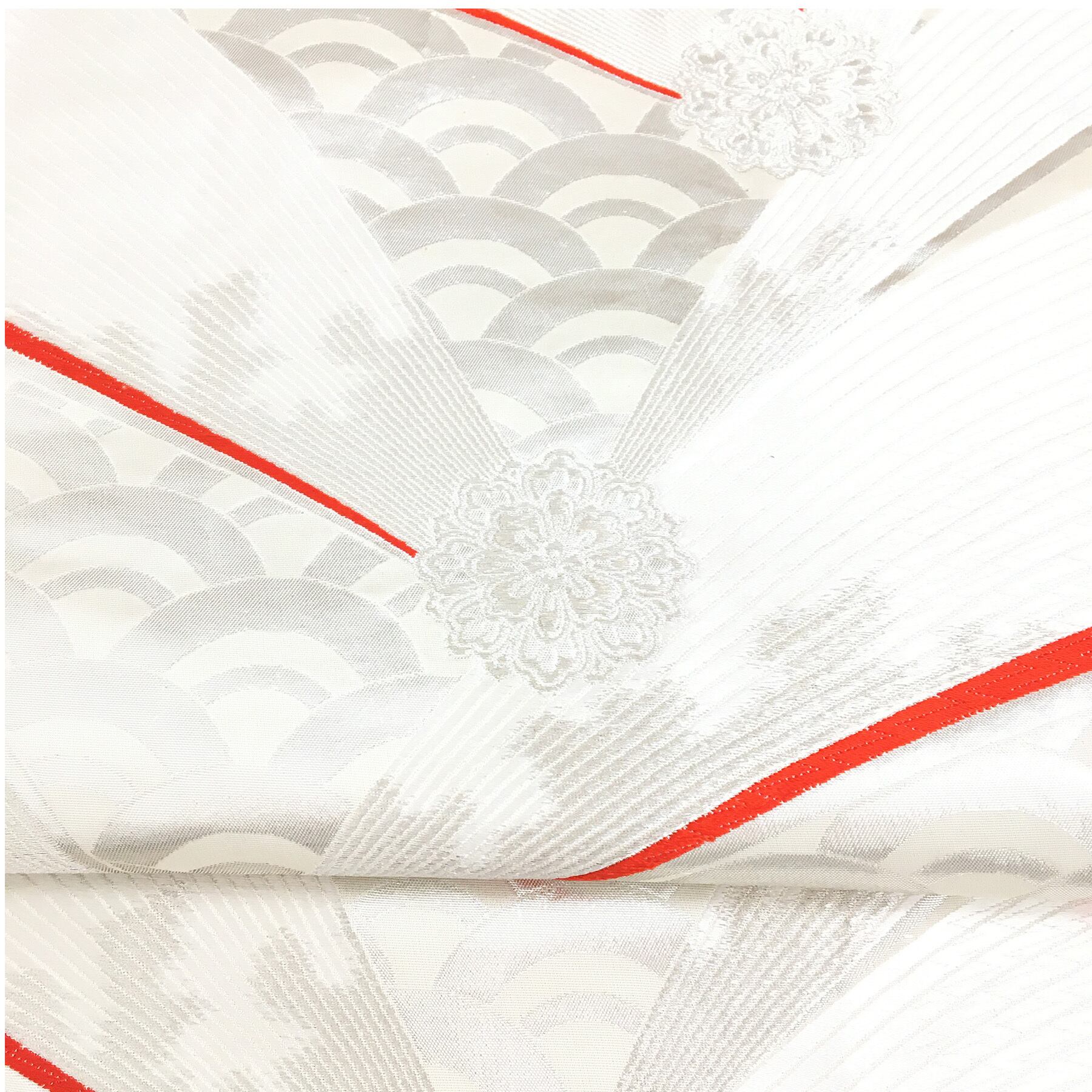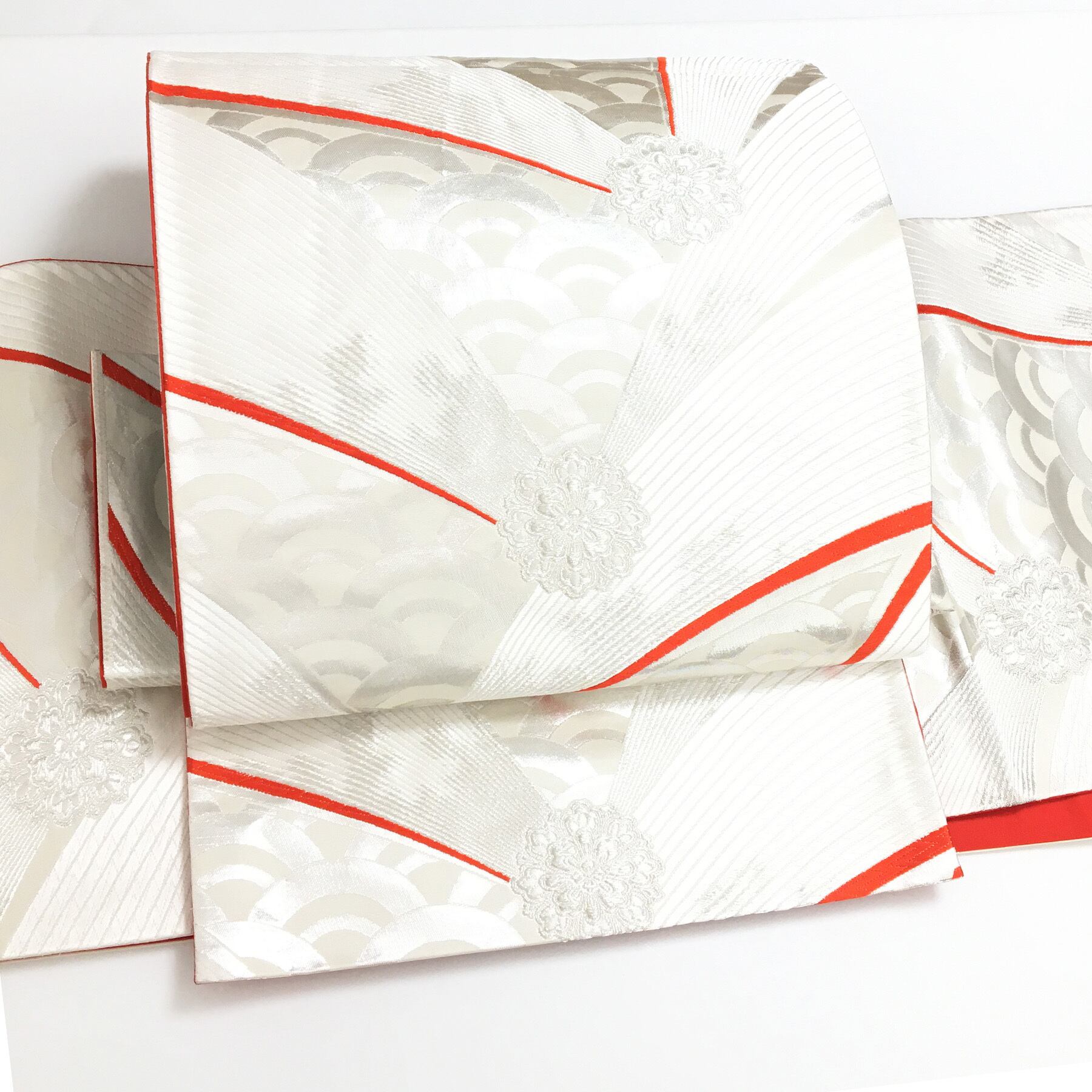 正絹 付け帯 楽帯 シルバーx赤 華柄 二部式 二重太鼓 作り帯 です。