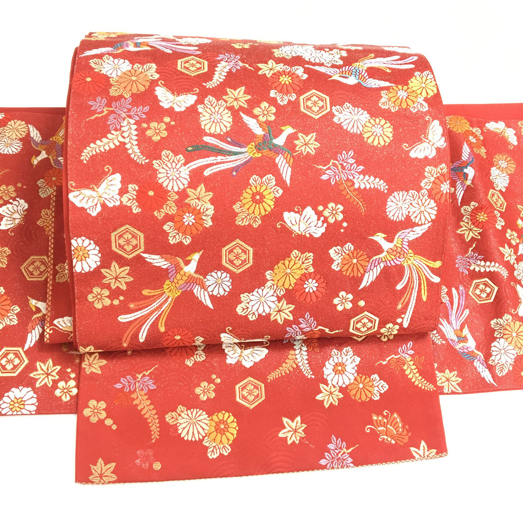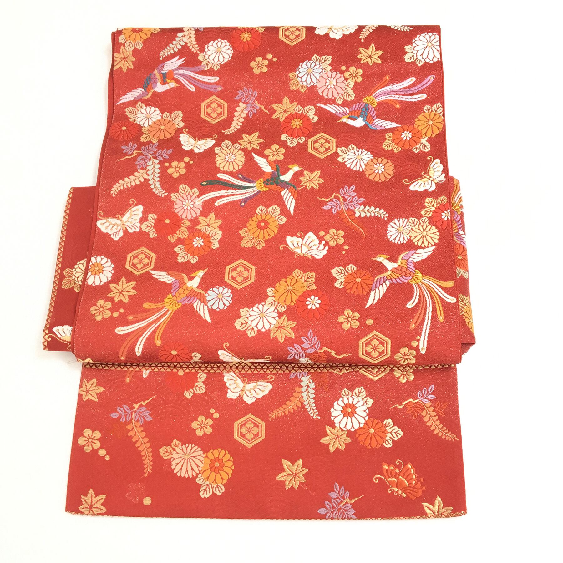 美品 正絹 付け帯 楽帯 赤 華喰い鳥 刺繍模様 二部式 二重太鼓 作り帯 です。