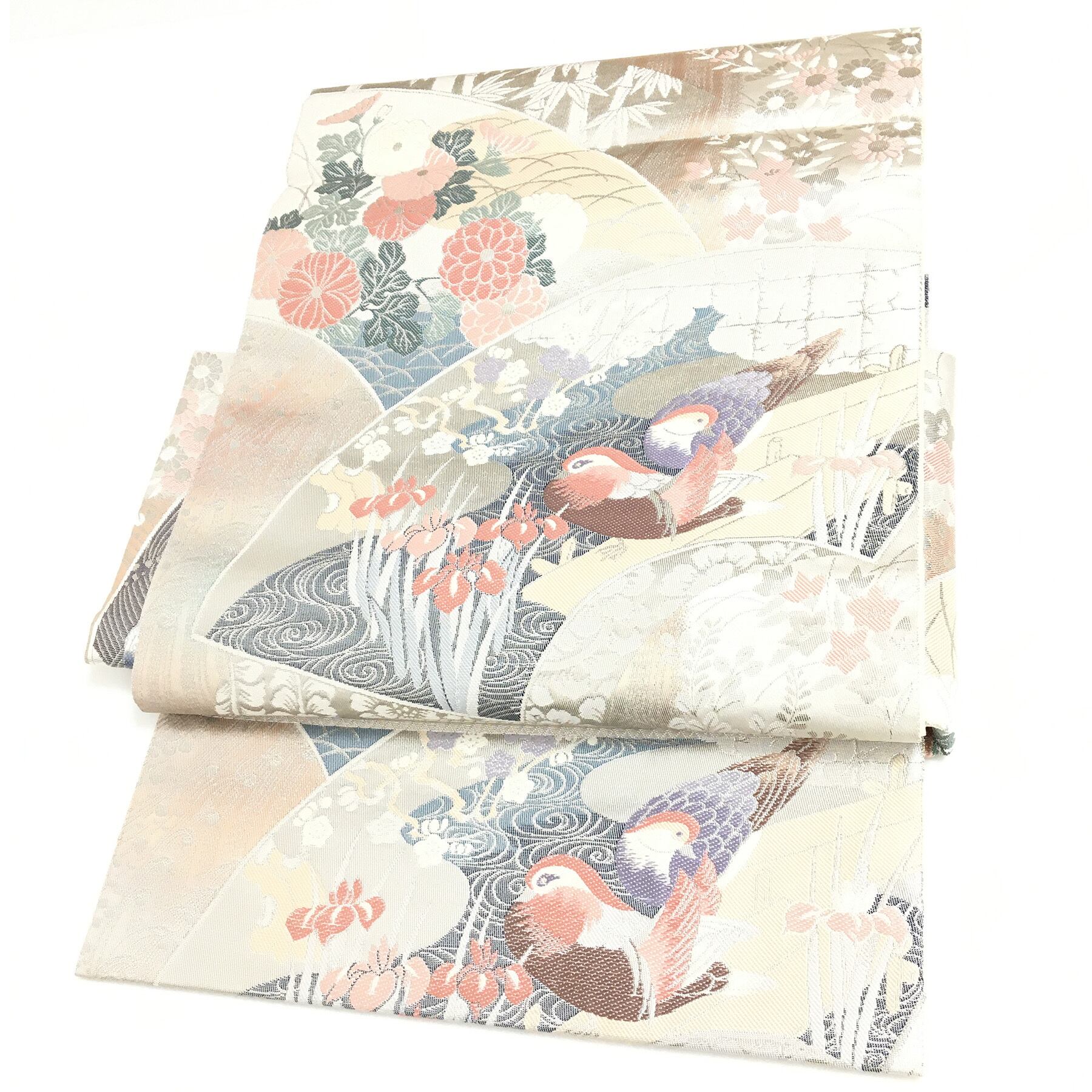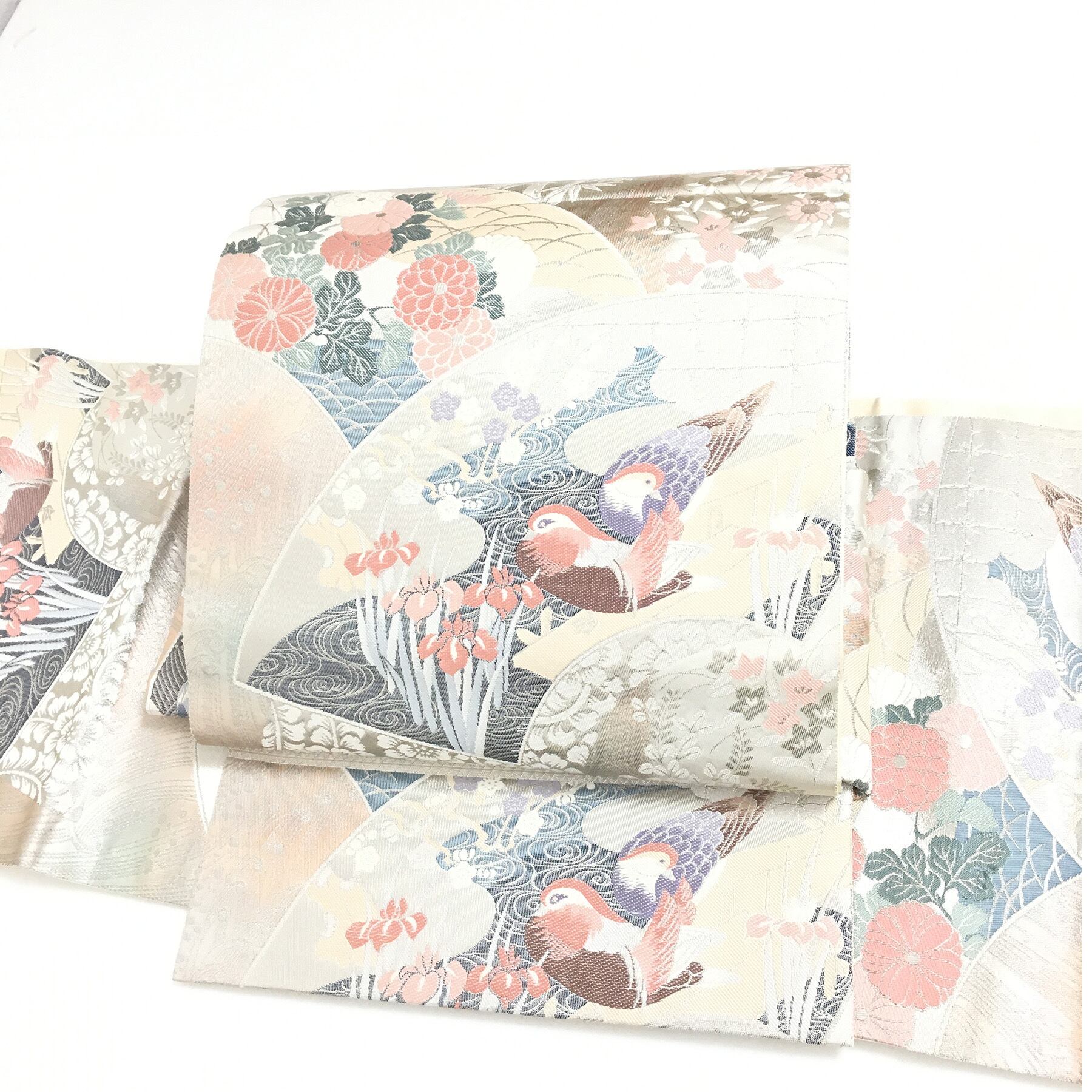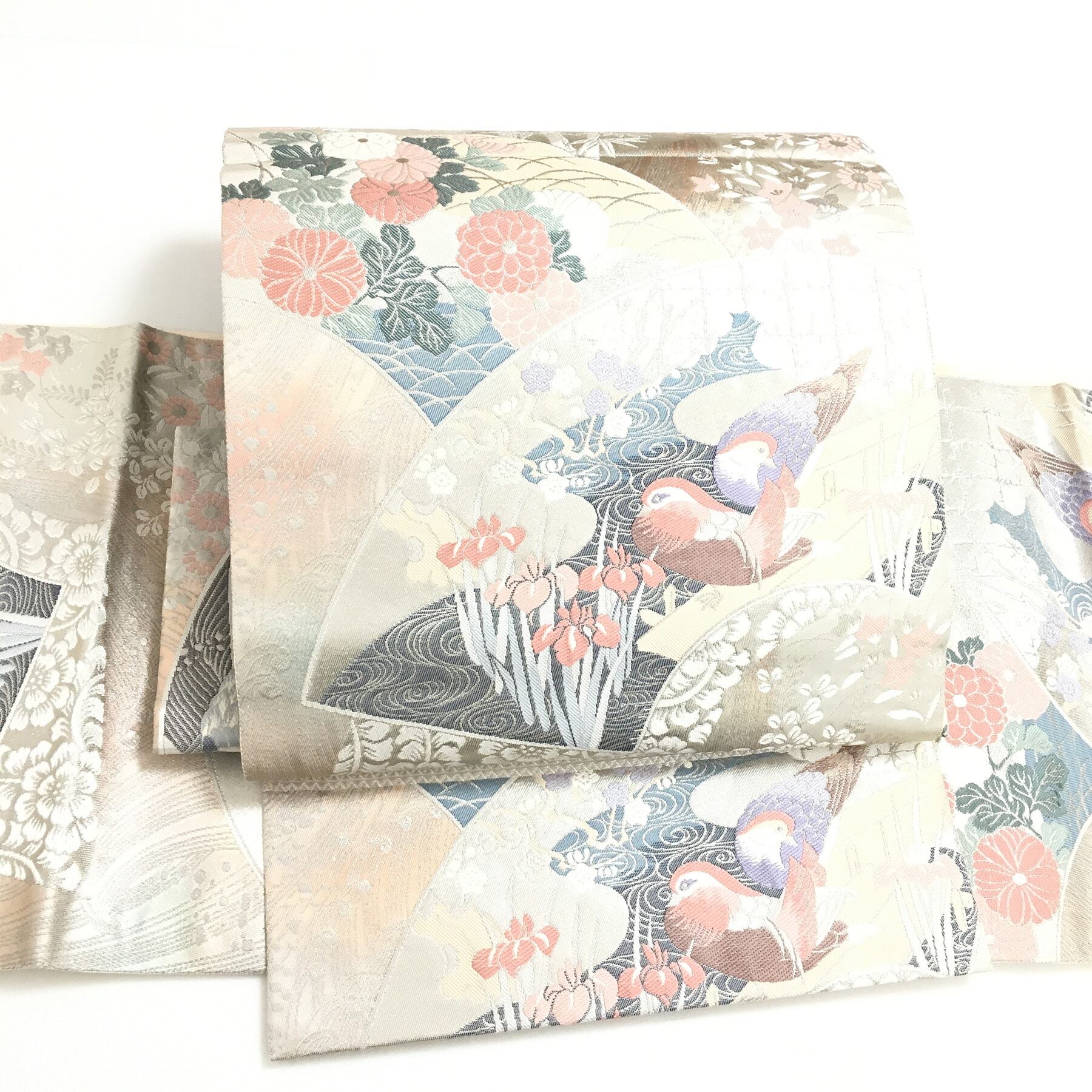 美品 正絹 付け帯 楽帯 シルバー 鴛鴦 二部式 二重太鼓 作り帯 です。