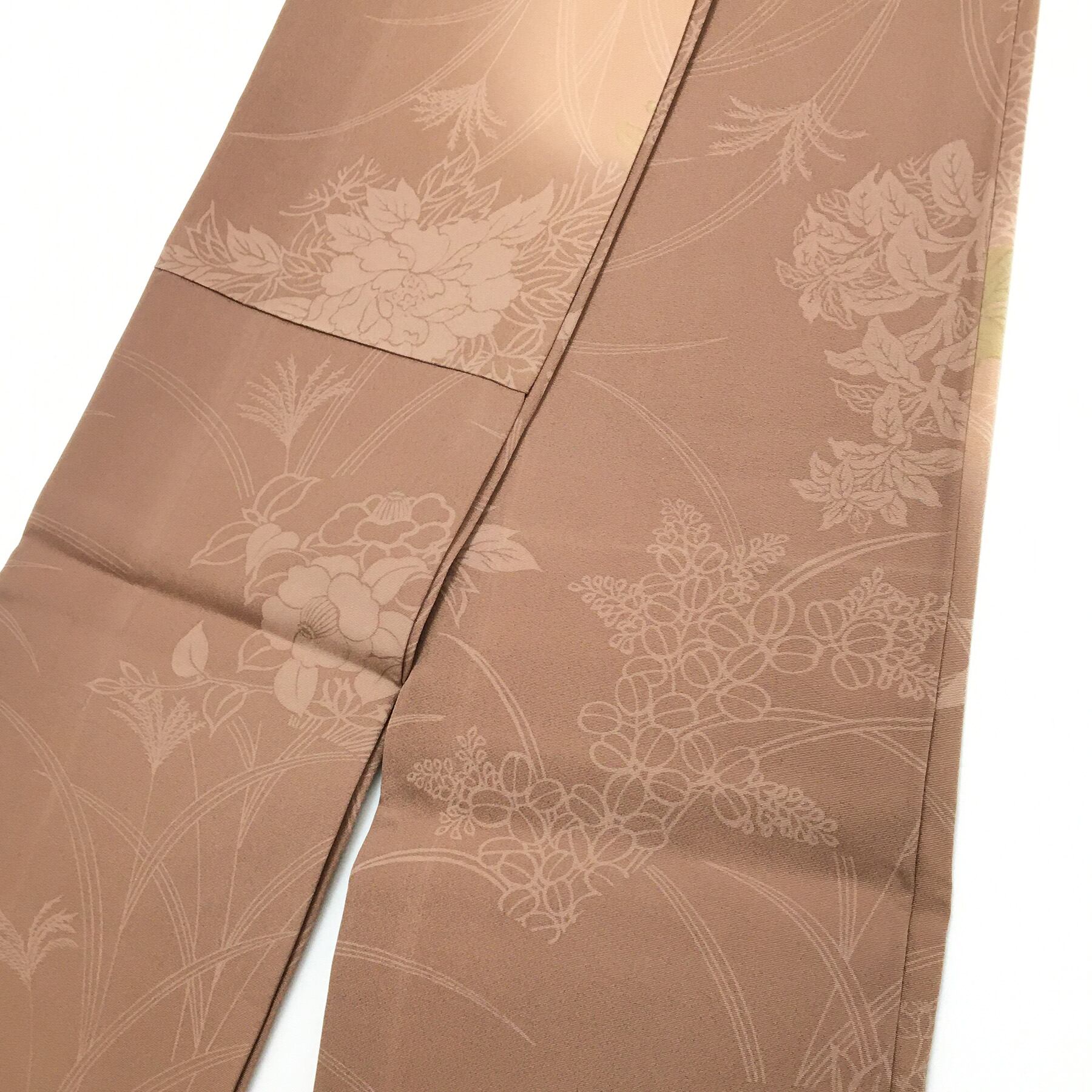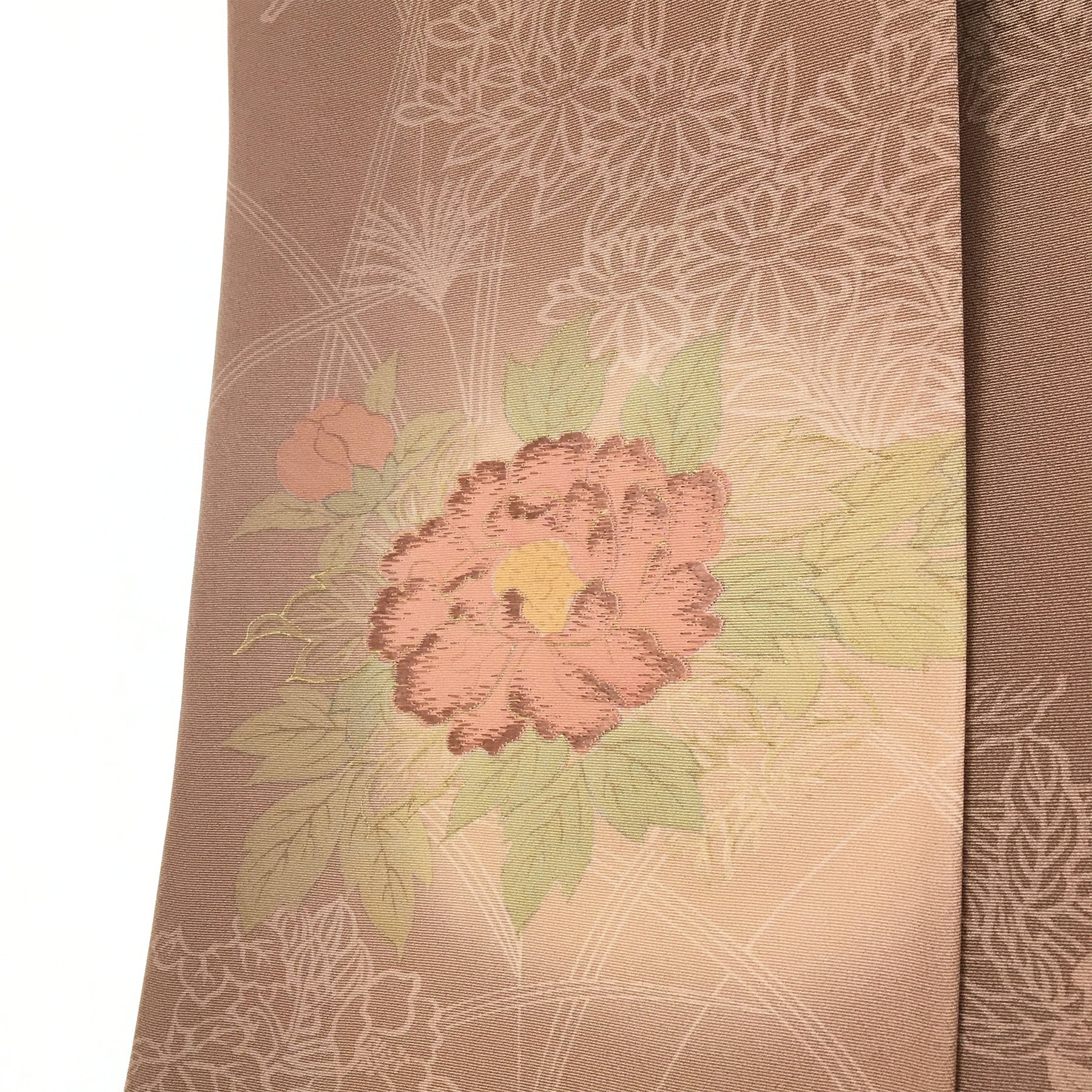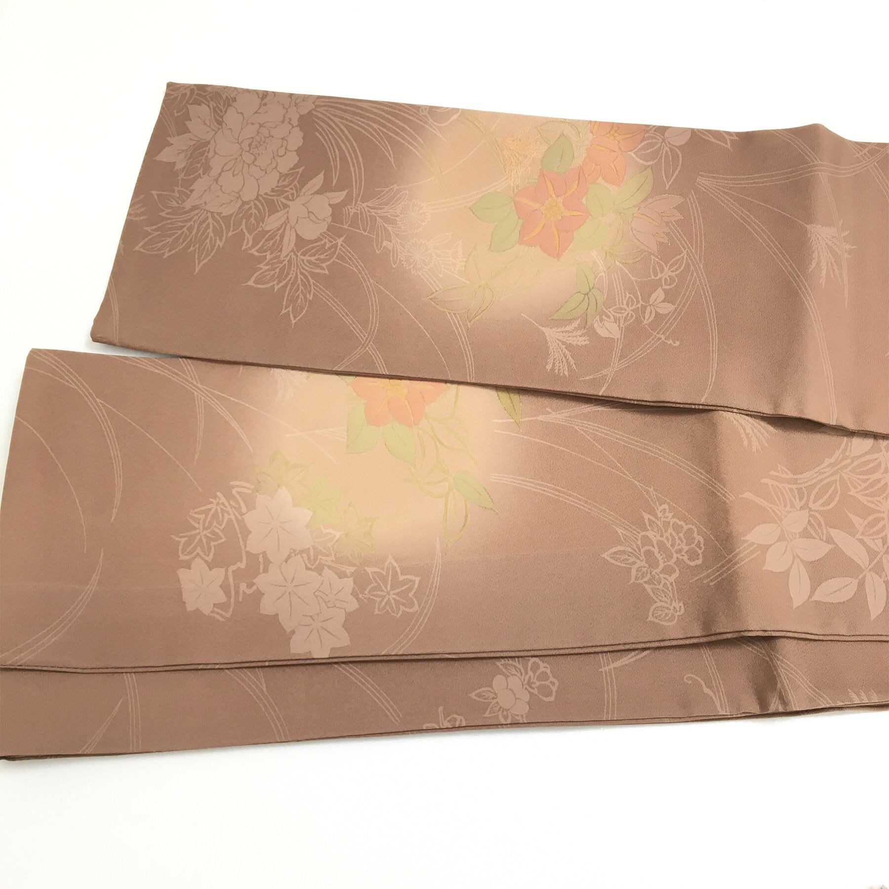 正絹 半幅帯 茶 花模様 部分柄 長尺427