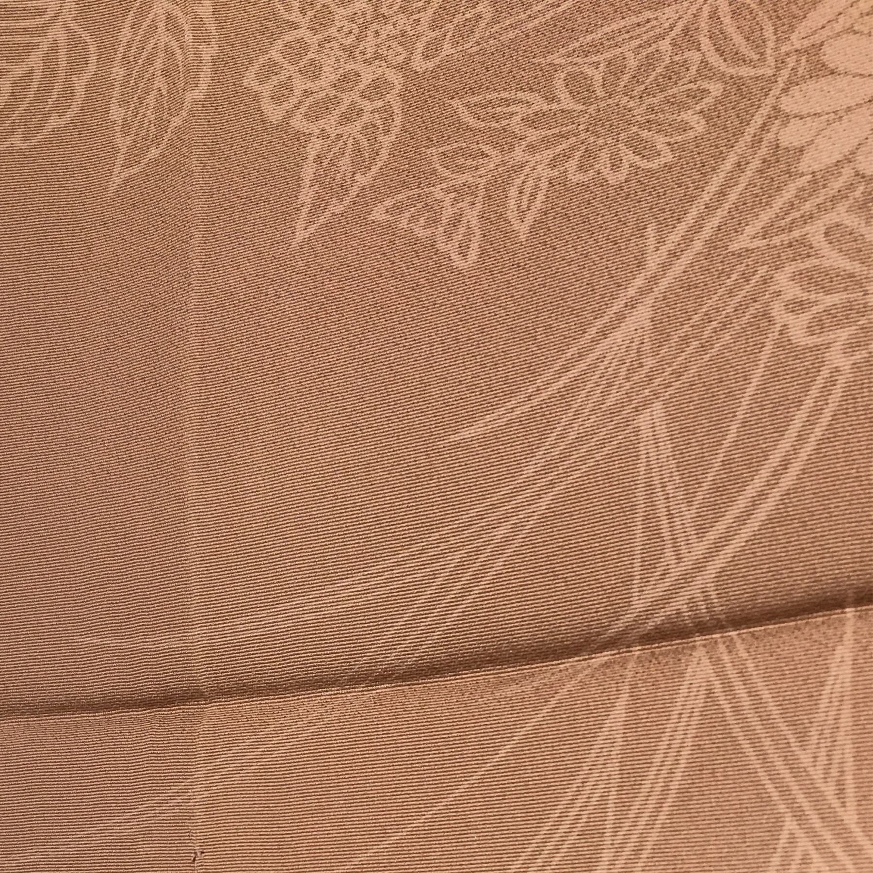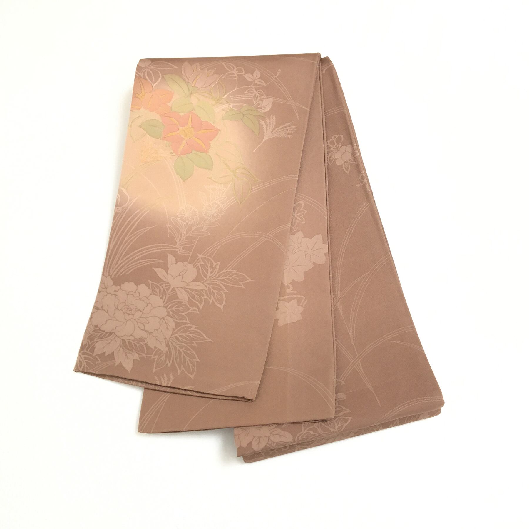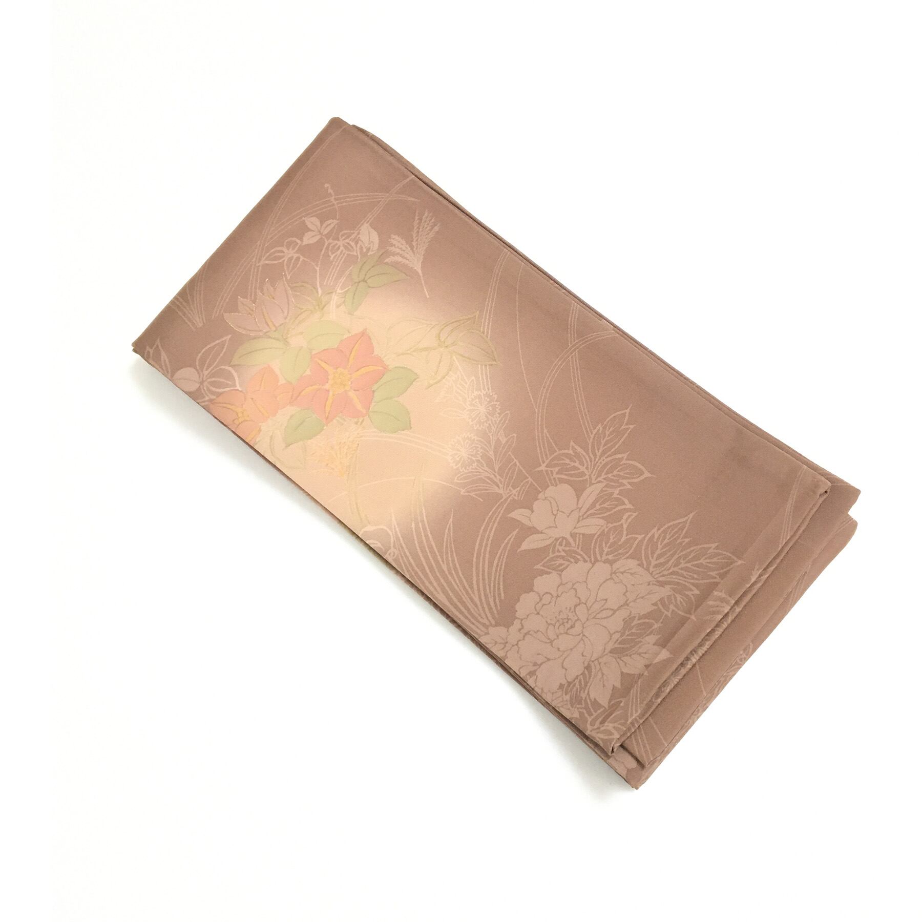 正絹 半幅帯 茶 花模様 部分柄 長尺427