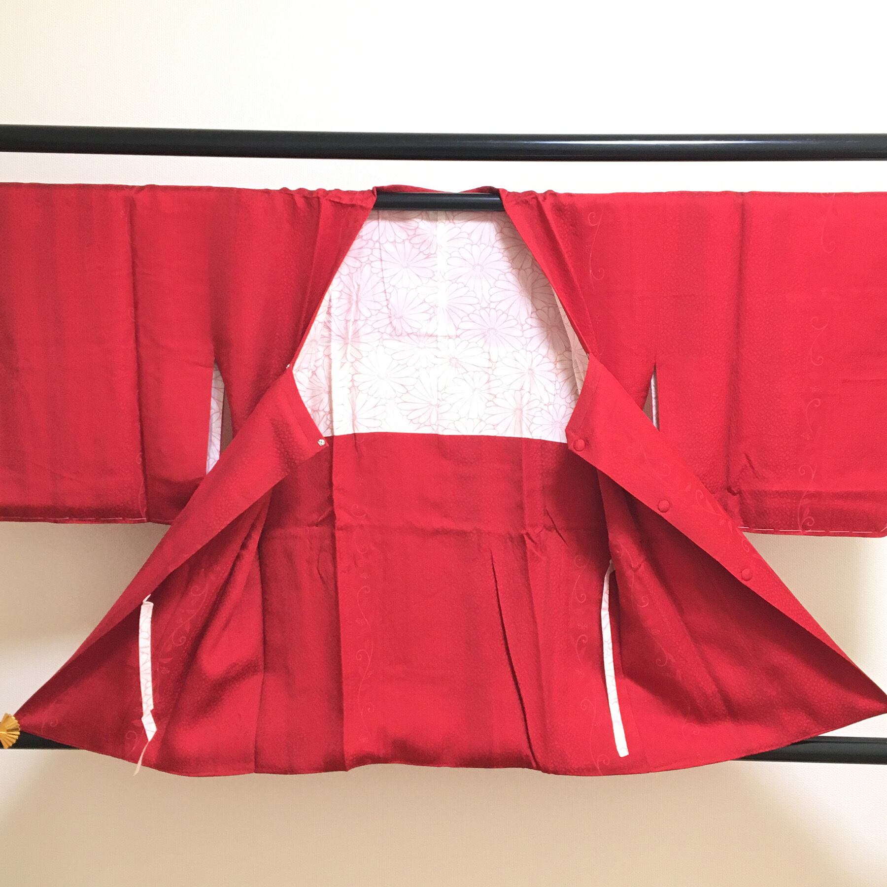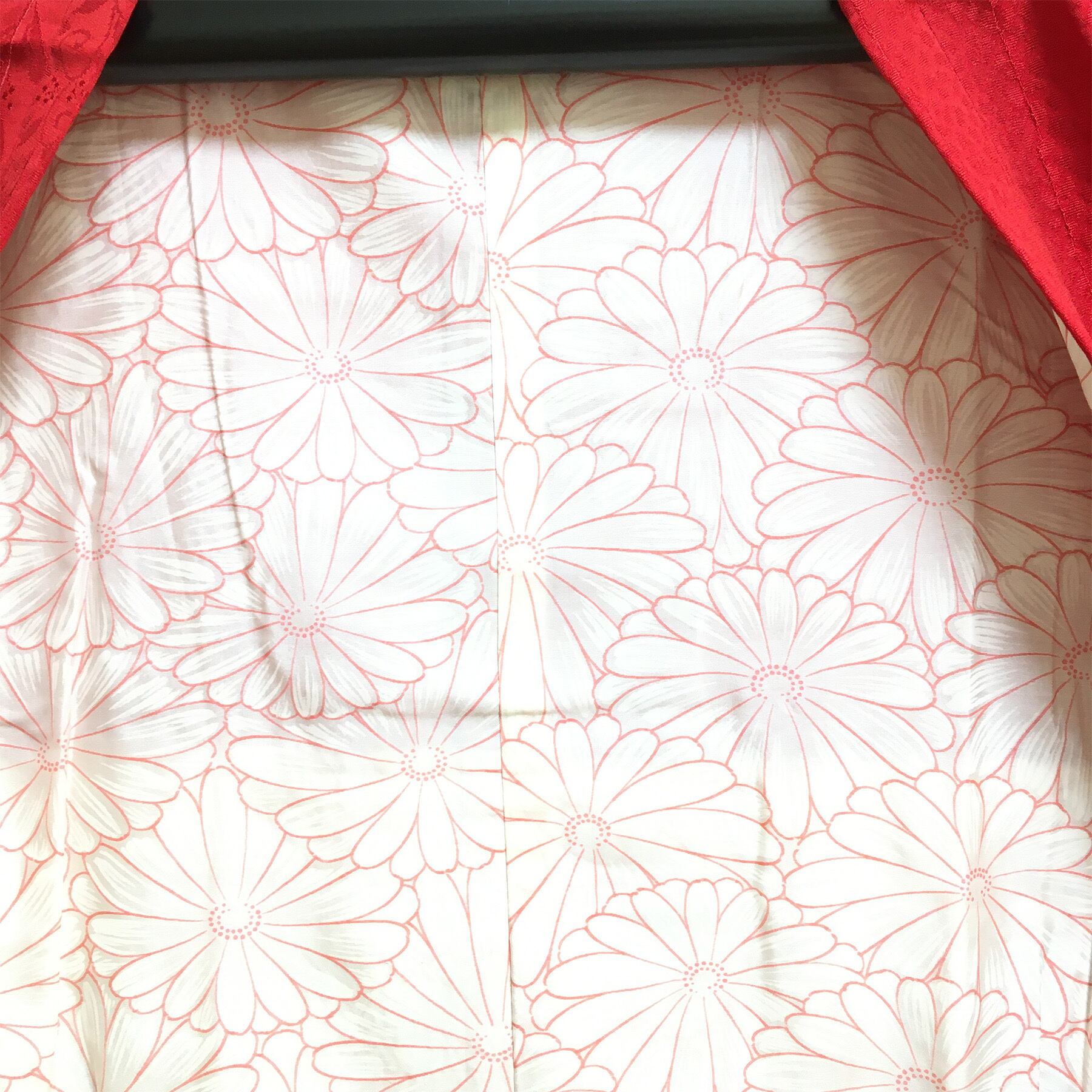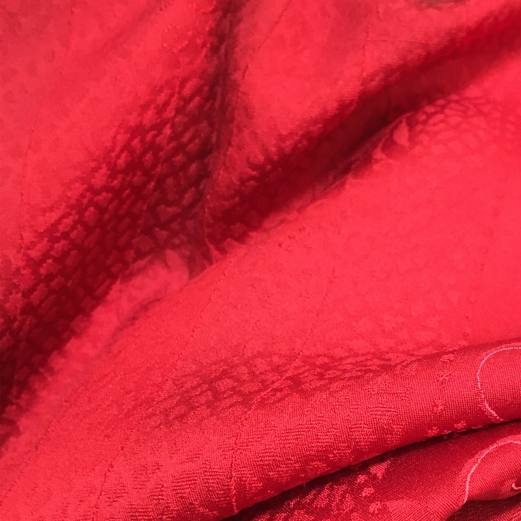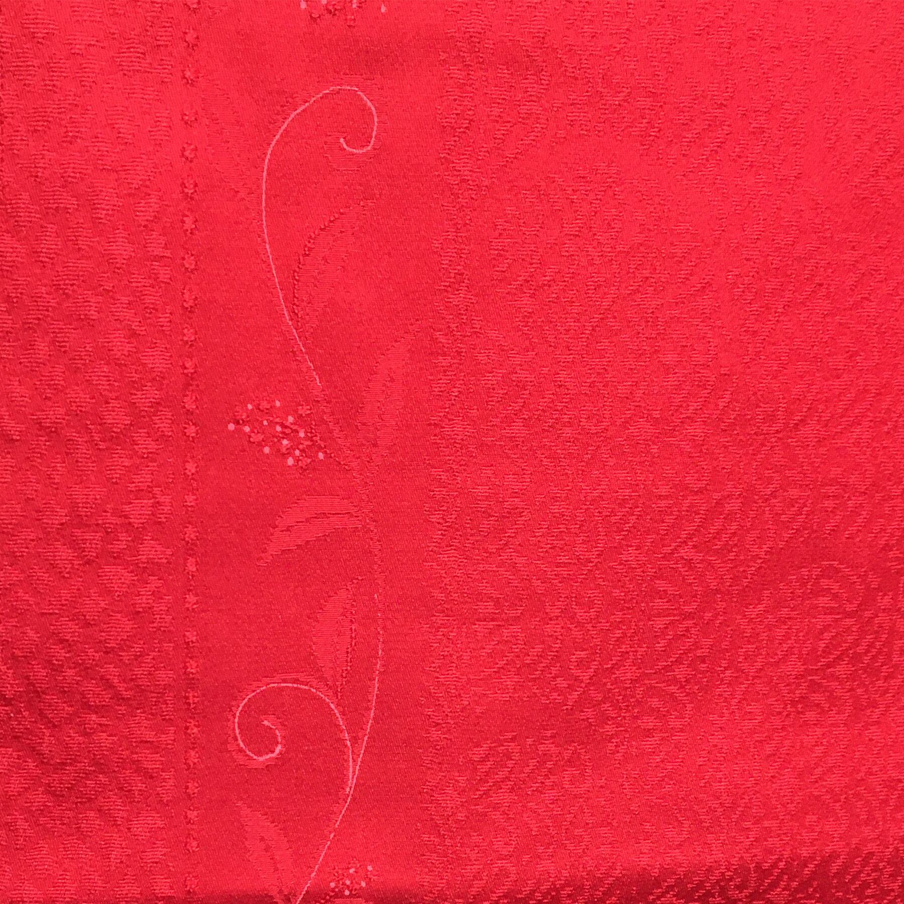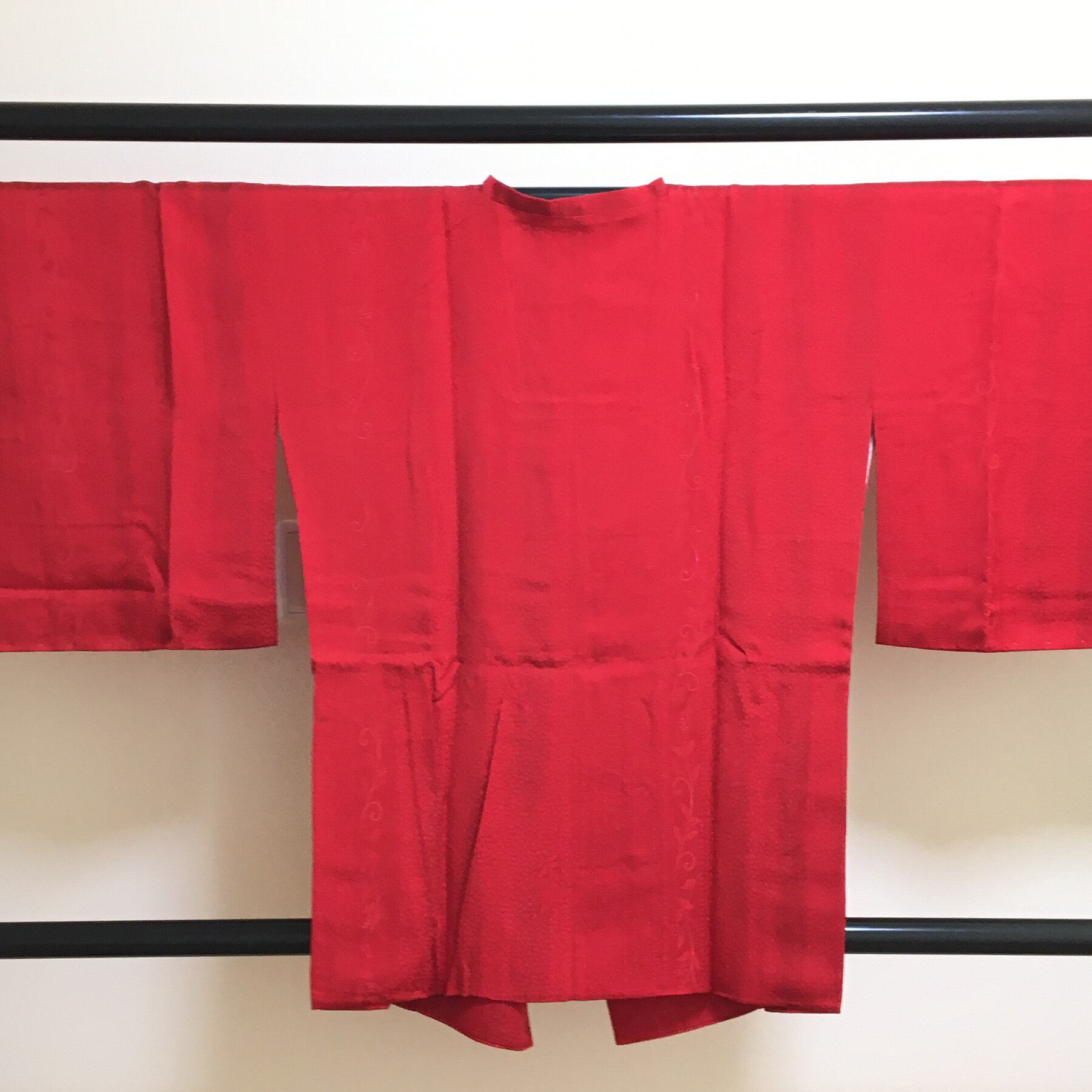 明るく発色のよい赤色に地紋柄をデザインした道行コートです。