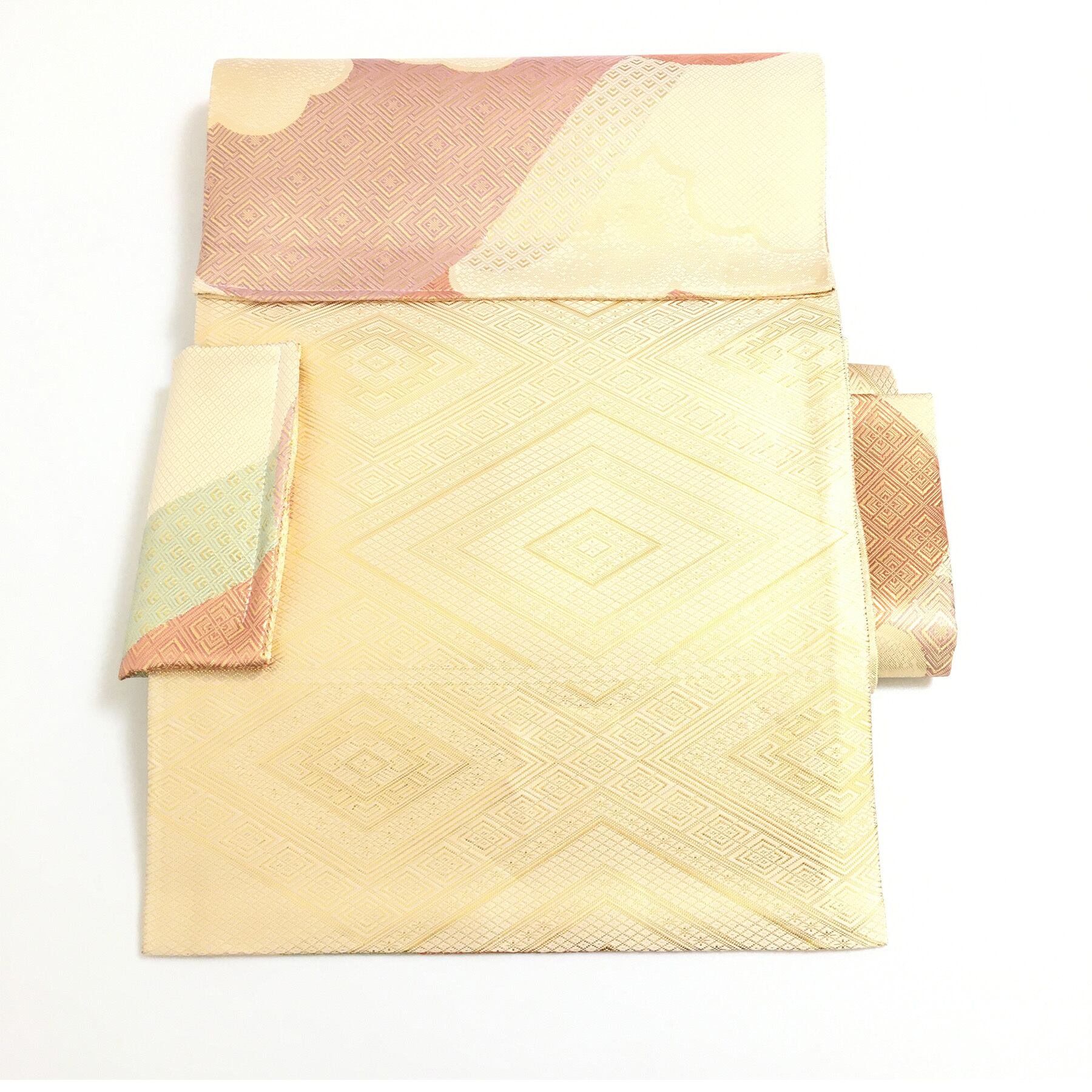 美品 正絹 楽帯 袋帯 佐賀錦 ゴールド 金彩 吉祥和紋 二重太鼓 作り帯 です。