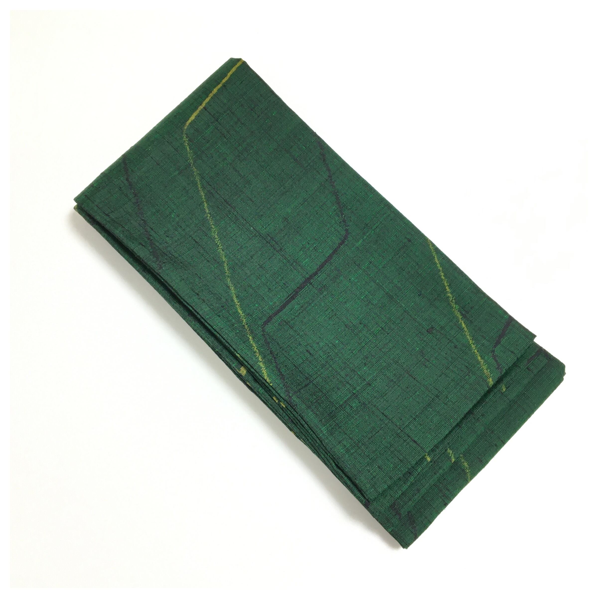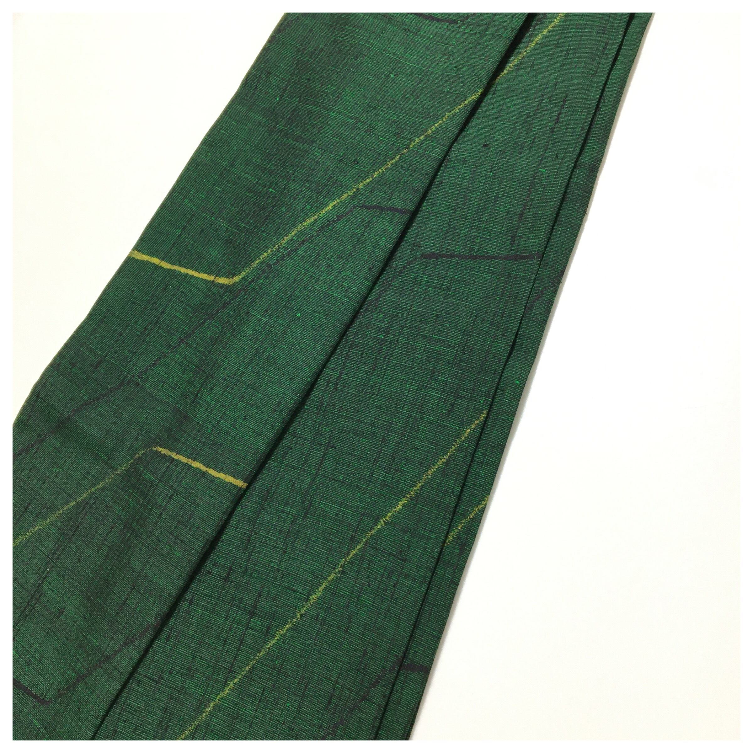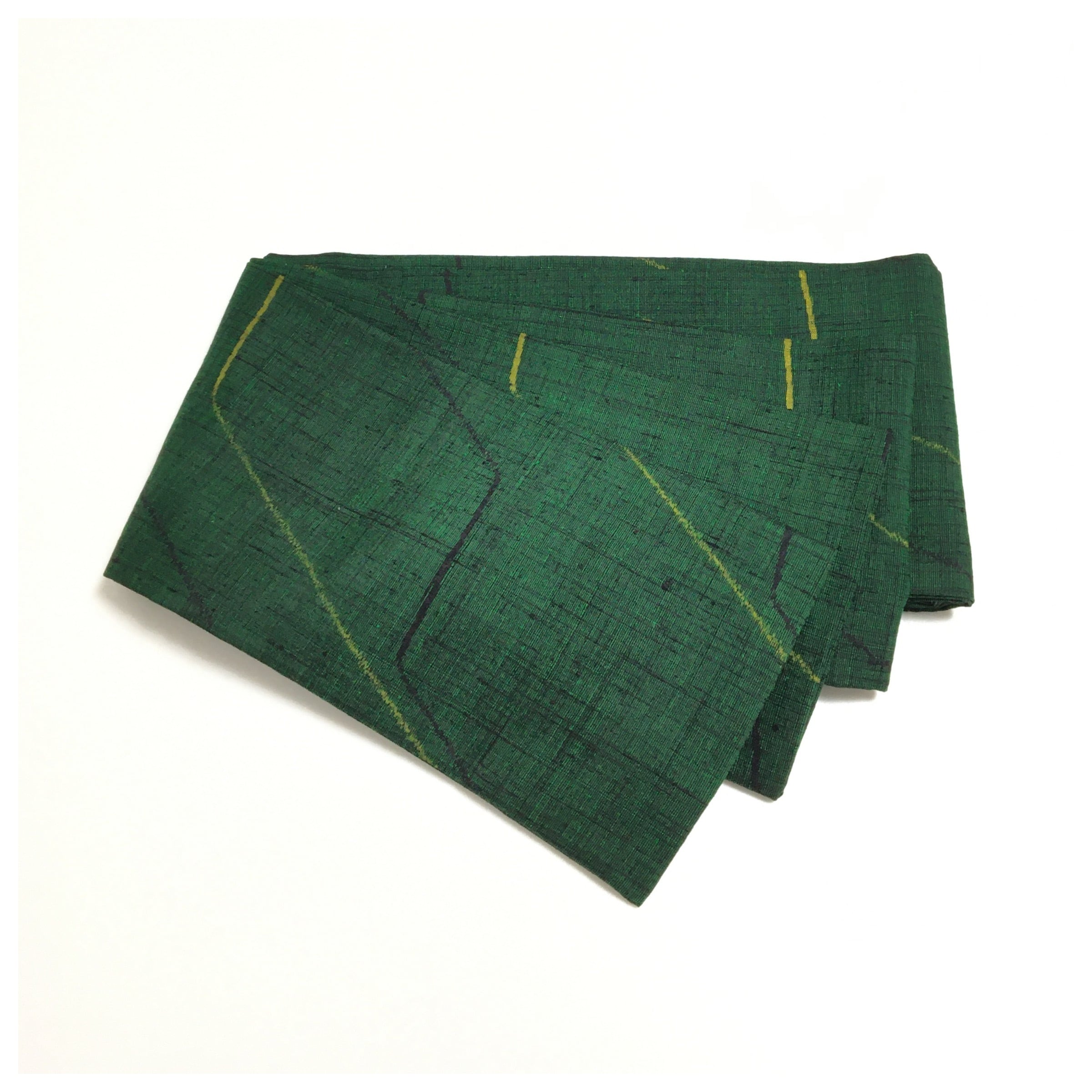 美品 正絹 紬 グリーン 幾何学模様 半幅帯 個性派 長尺424 中古品 です。