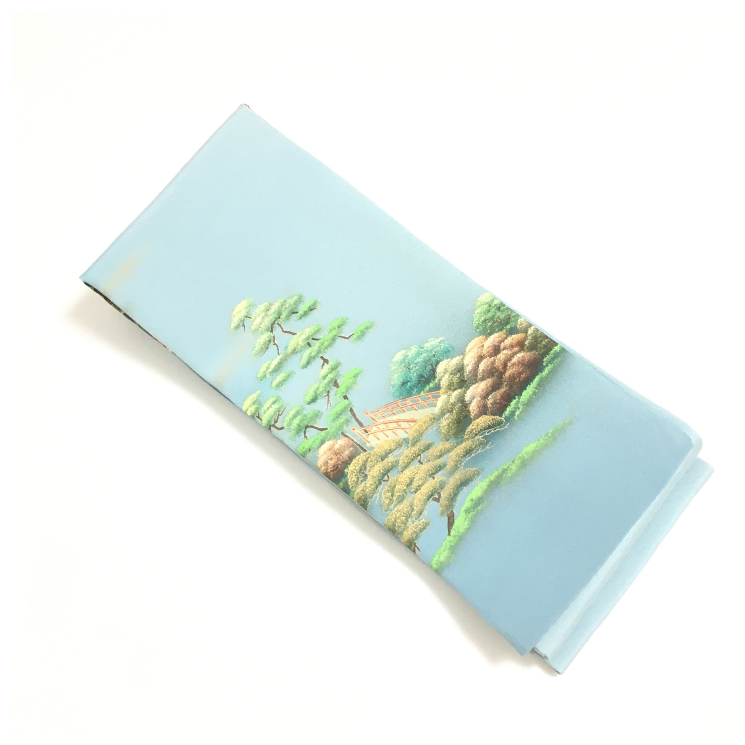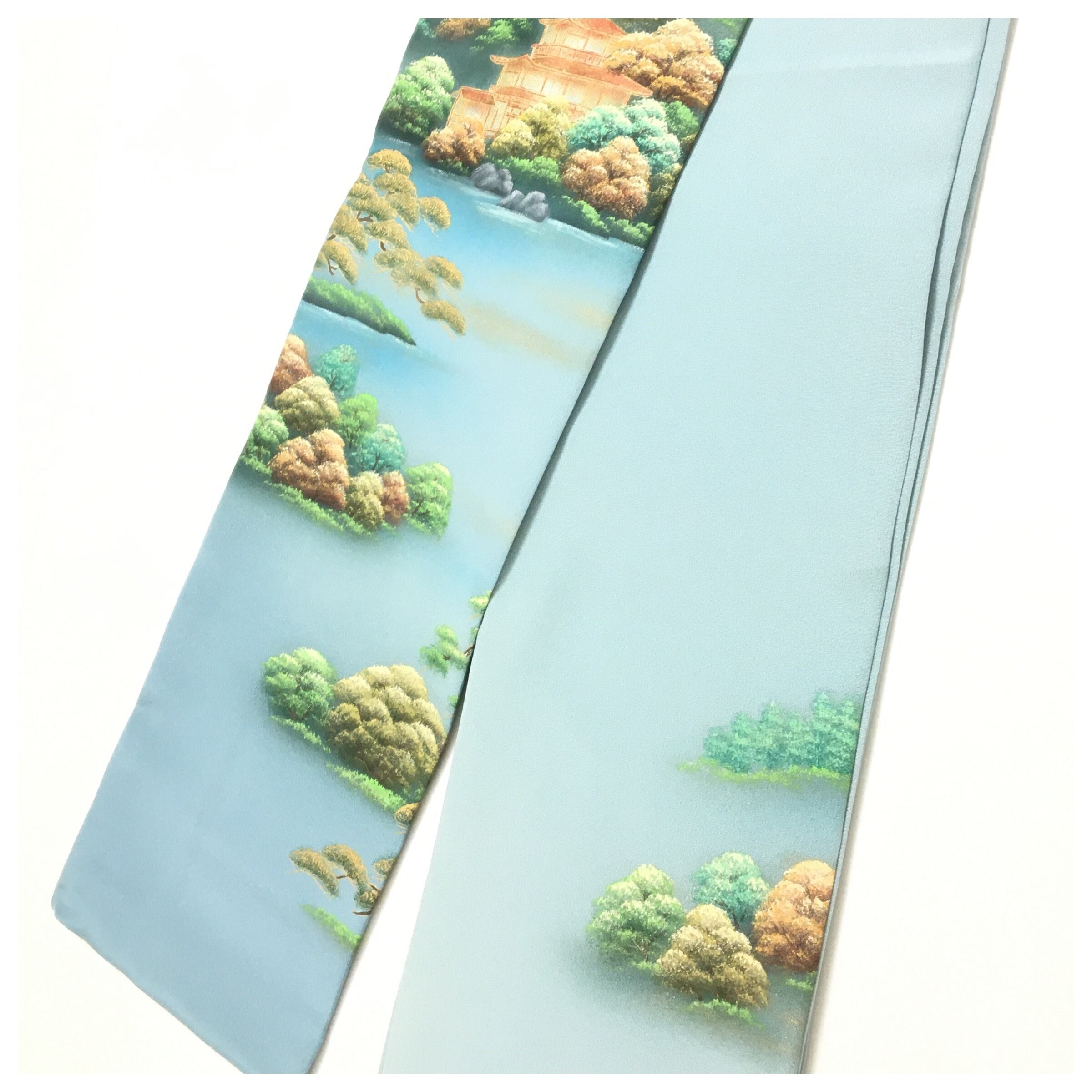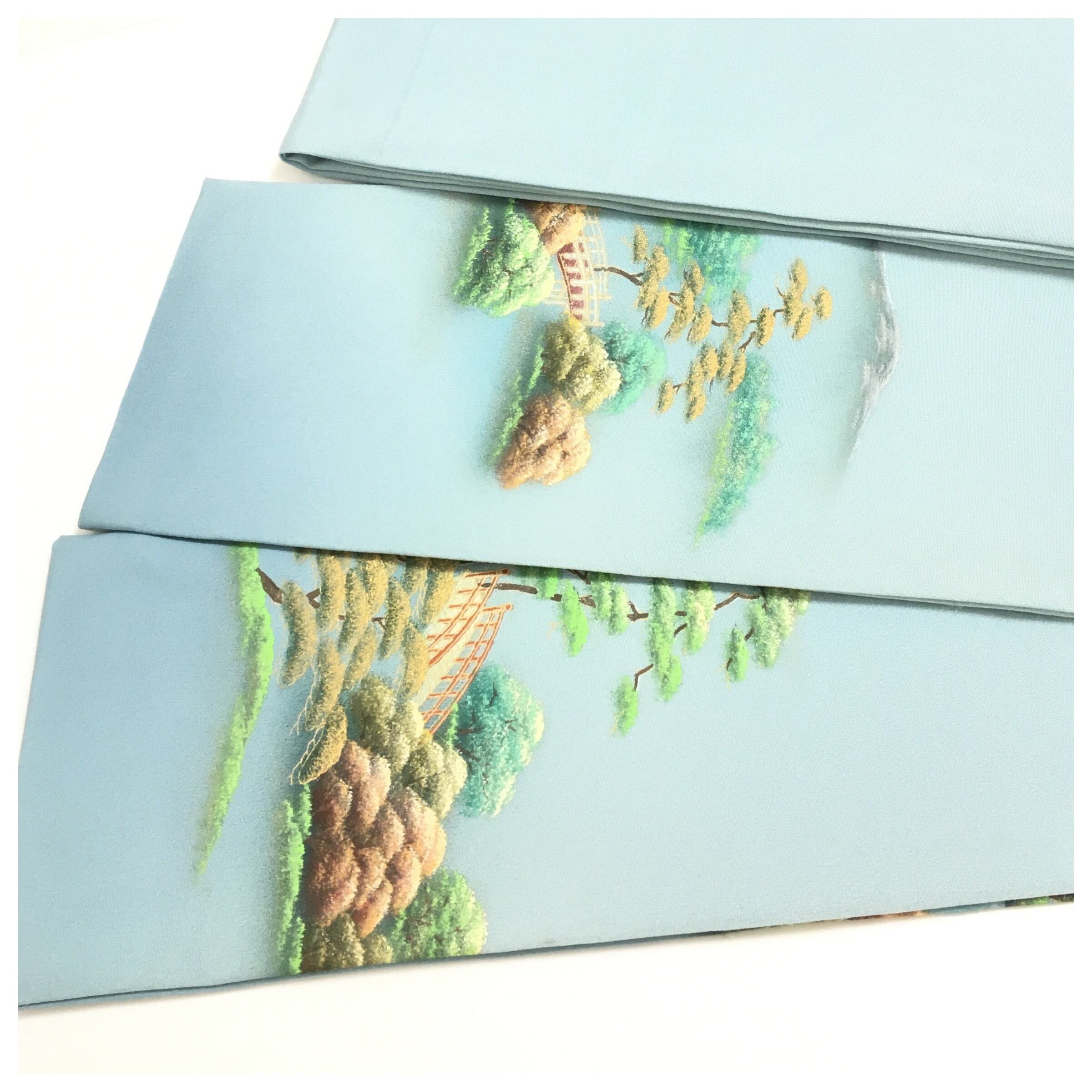 美品 上質 正絹 半幅帯 水色 風景柄 部分柄 長尺455cm