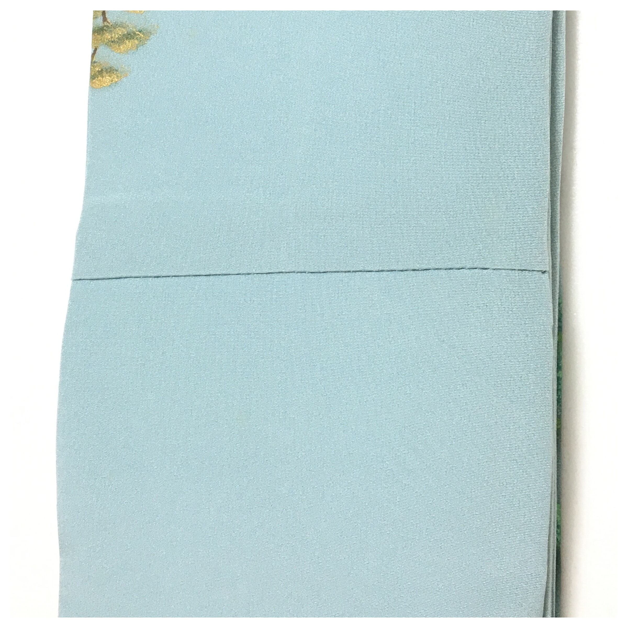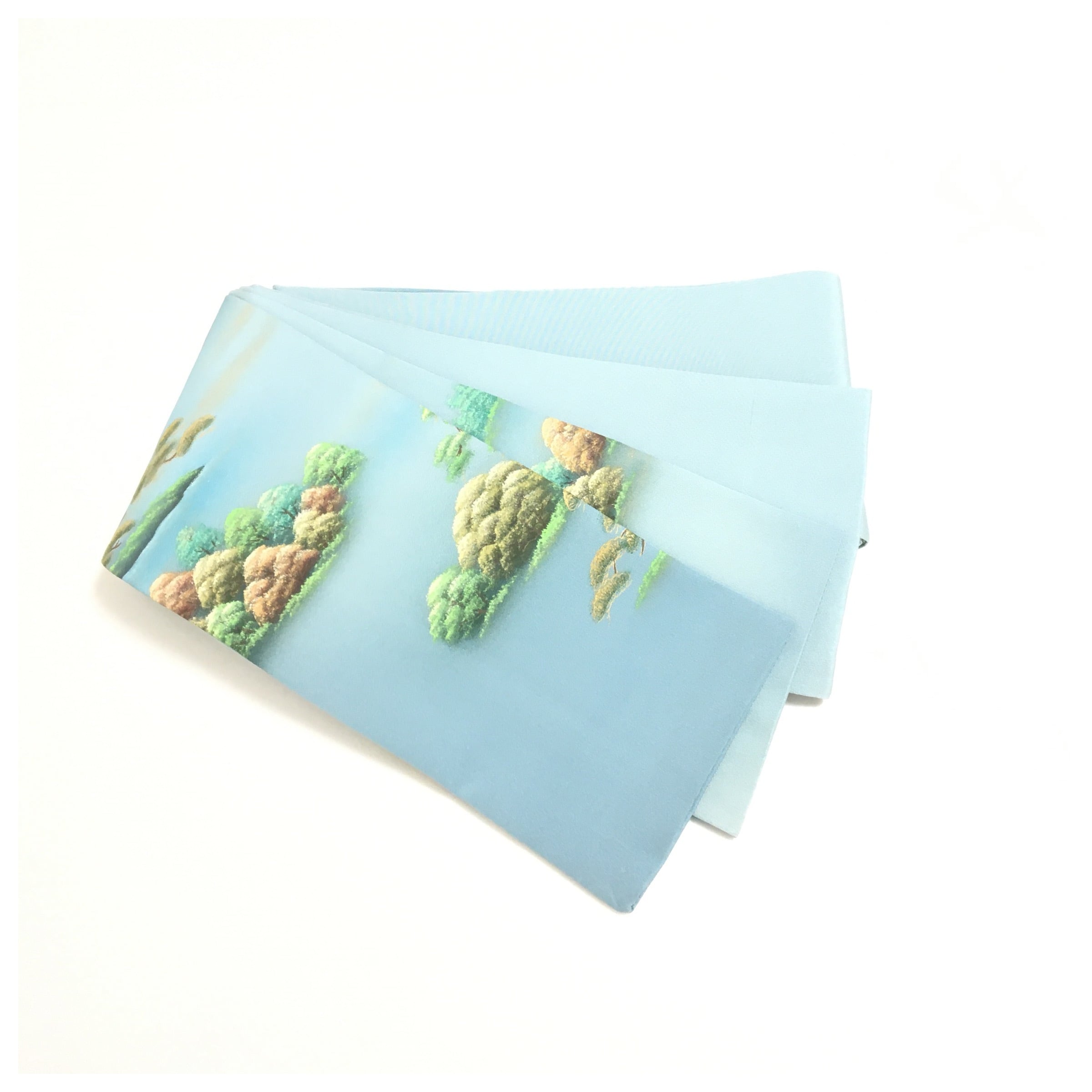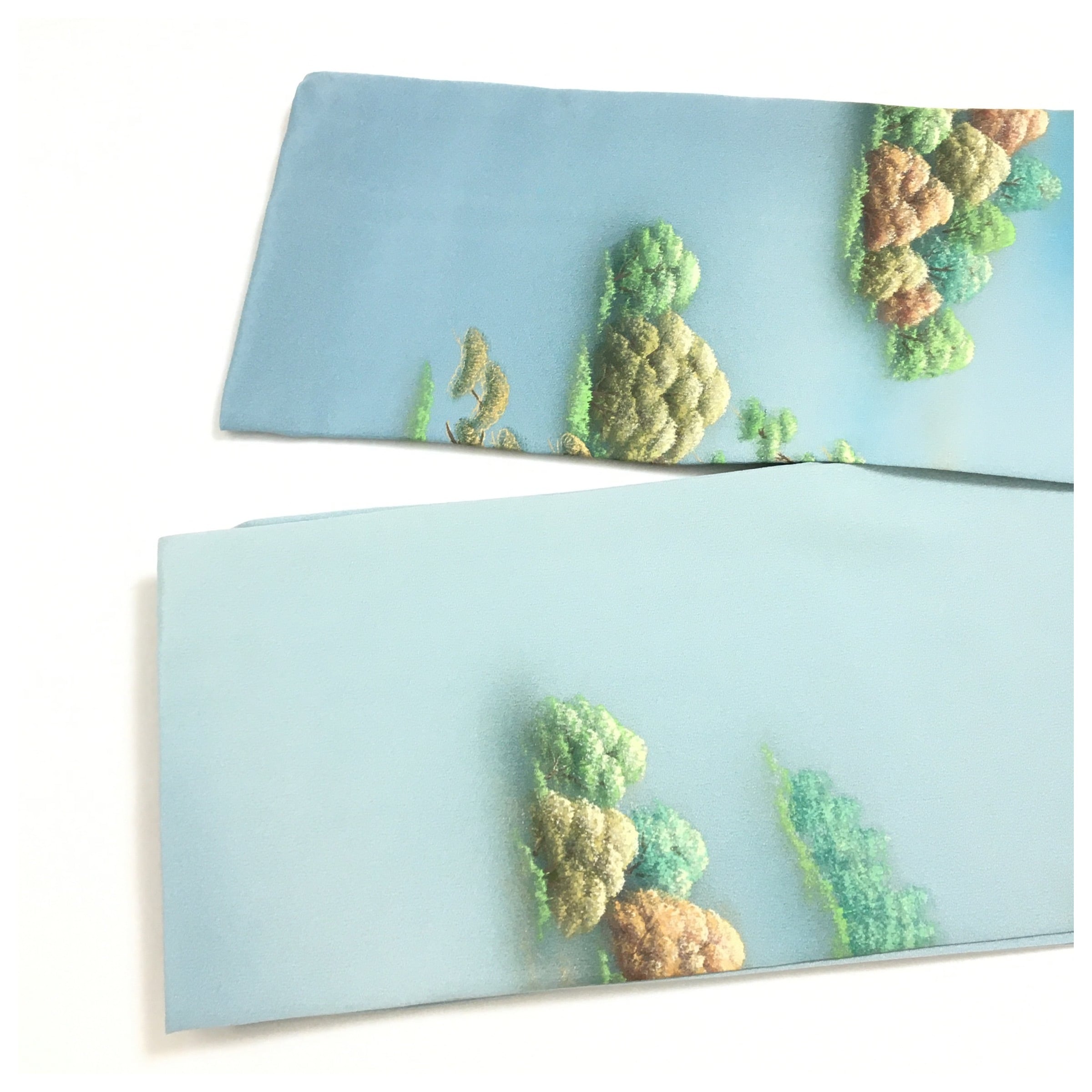 美品 上質 正絹 半幅帯 水色 風景柄 部分柄 長尺455cm