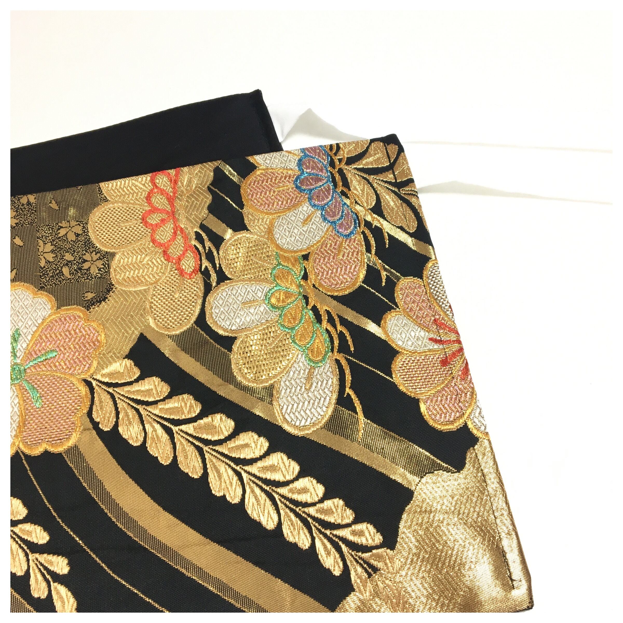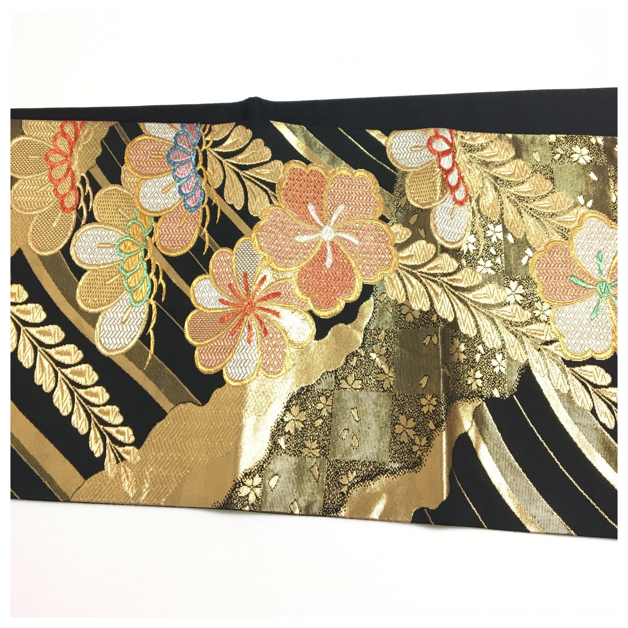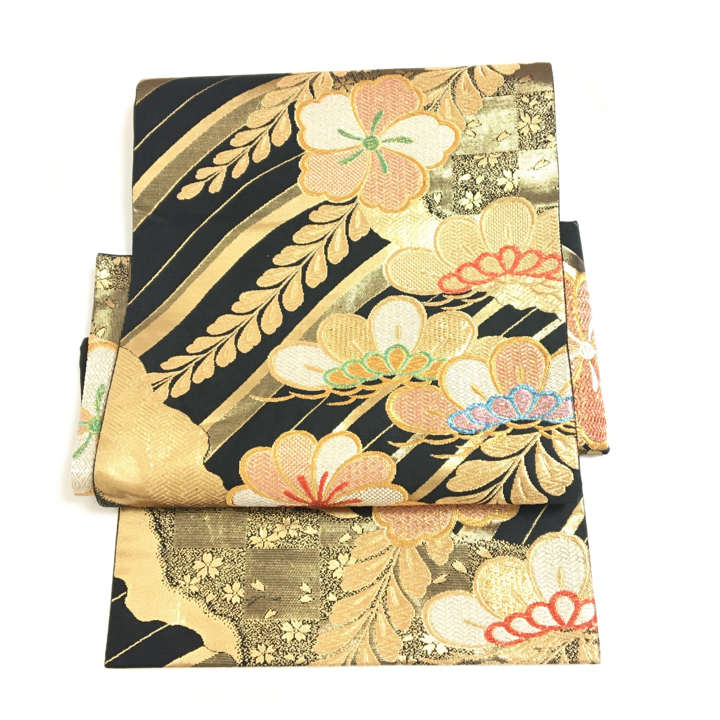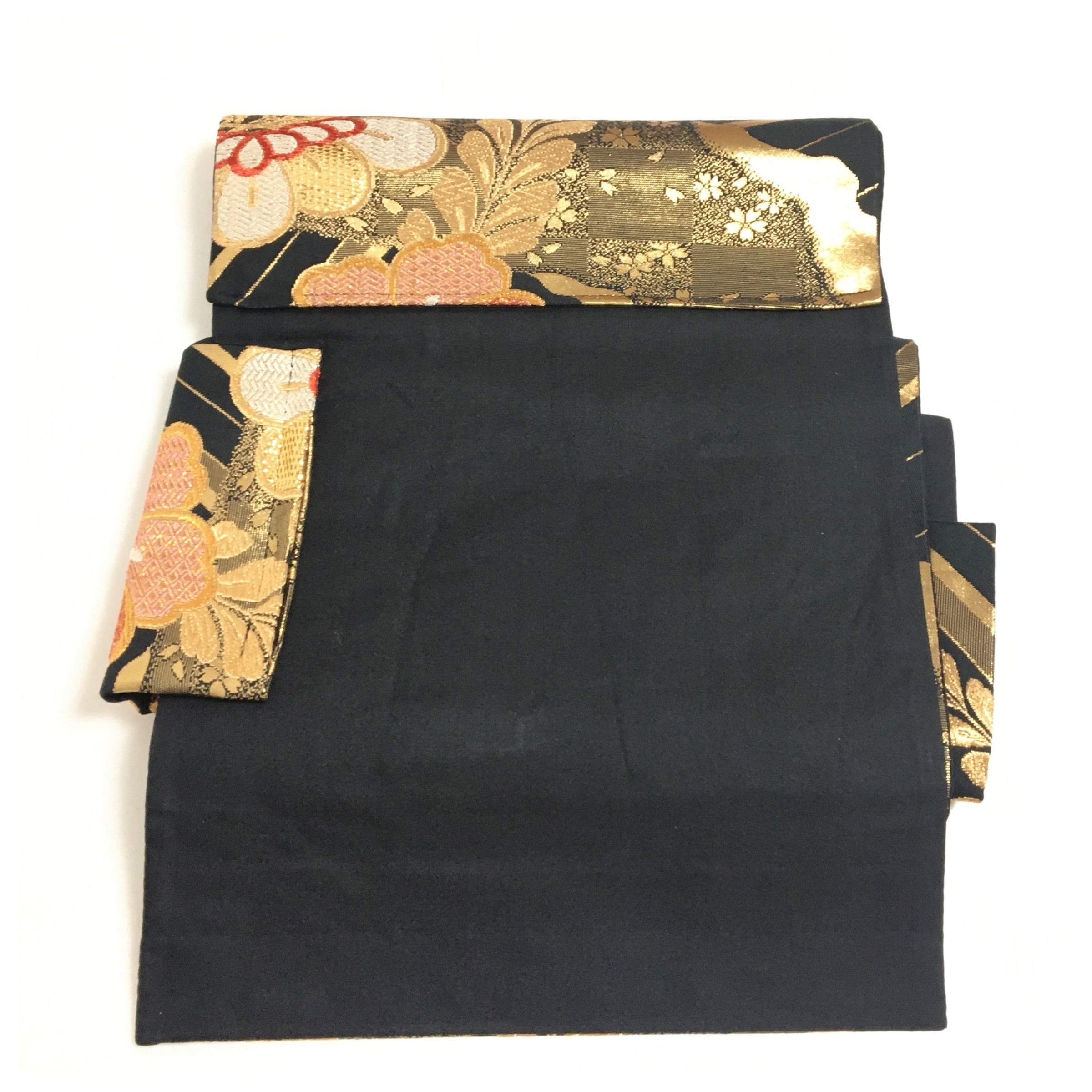 美品 正絹 付け帯 楽帯 黒地 松 ねじり梅 二部式 二重太鼓 作り帯 です。