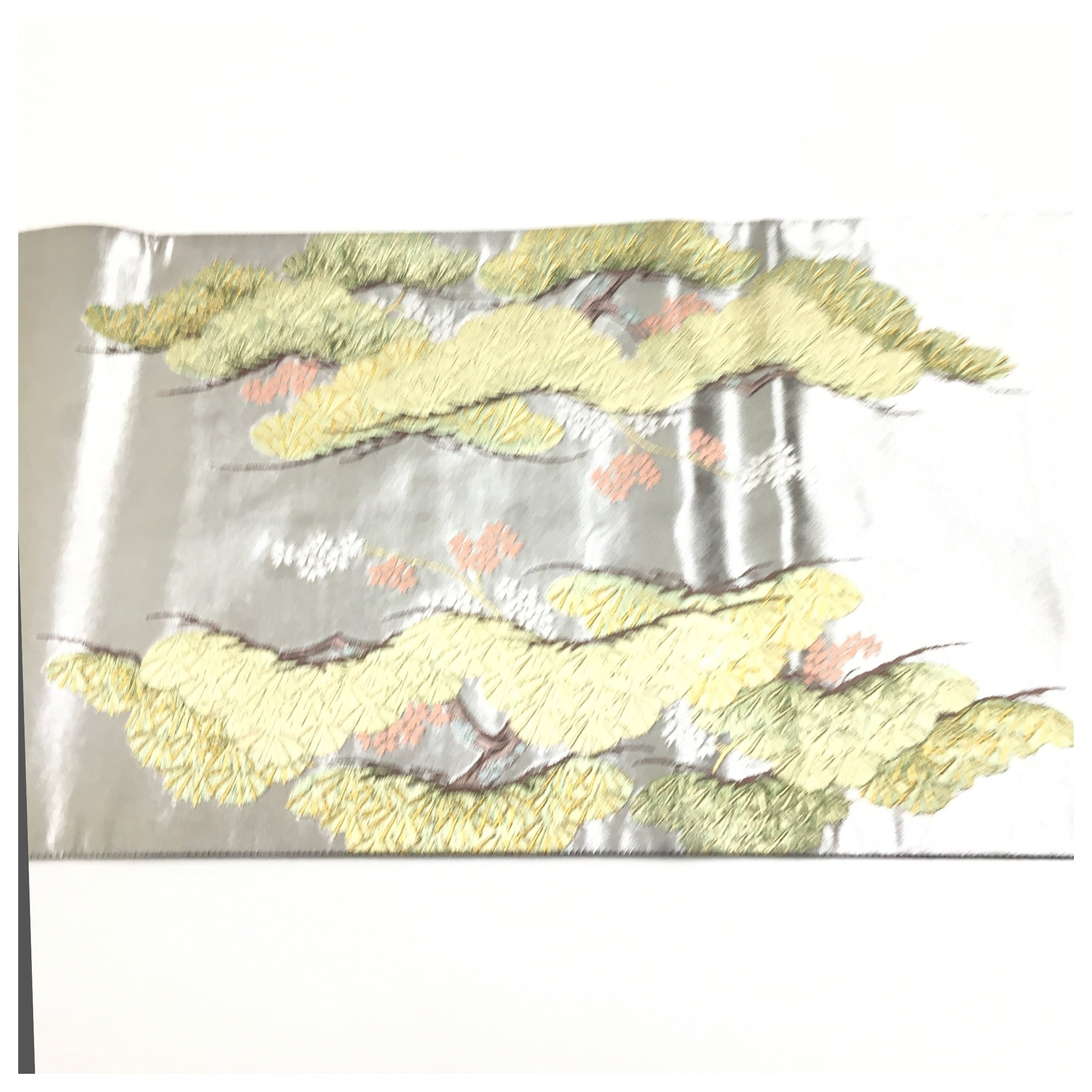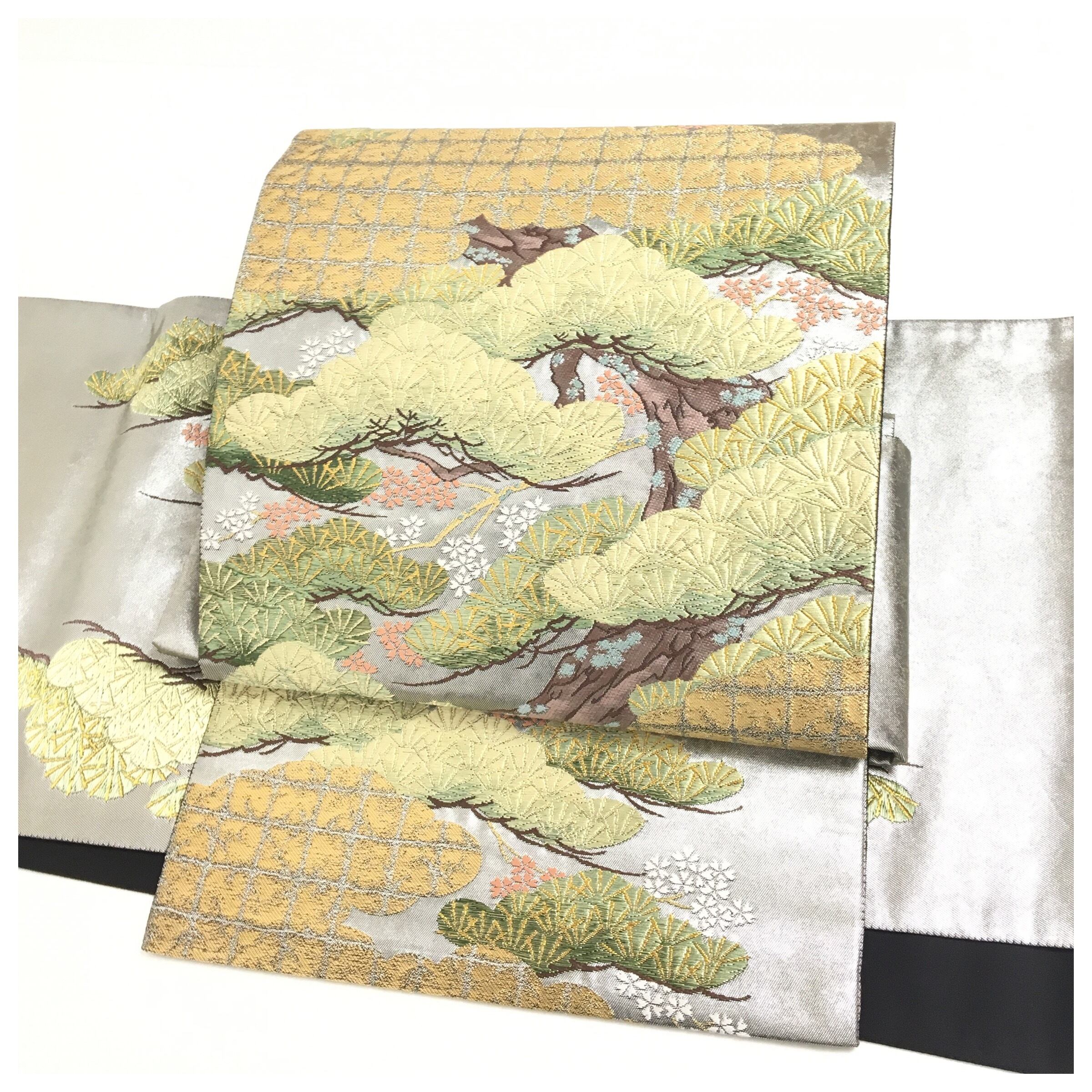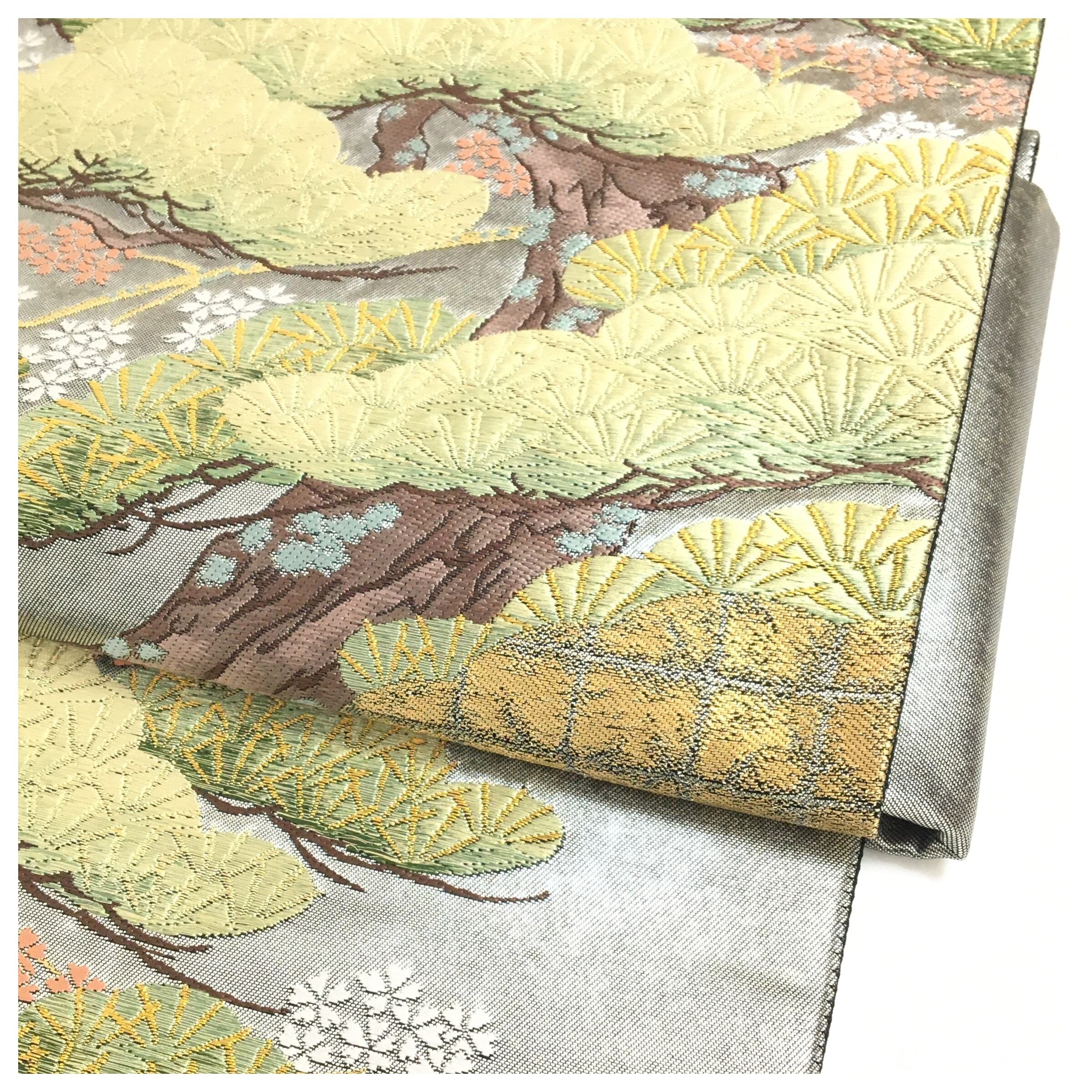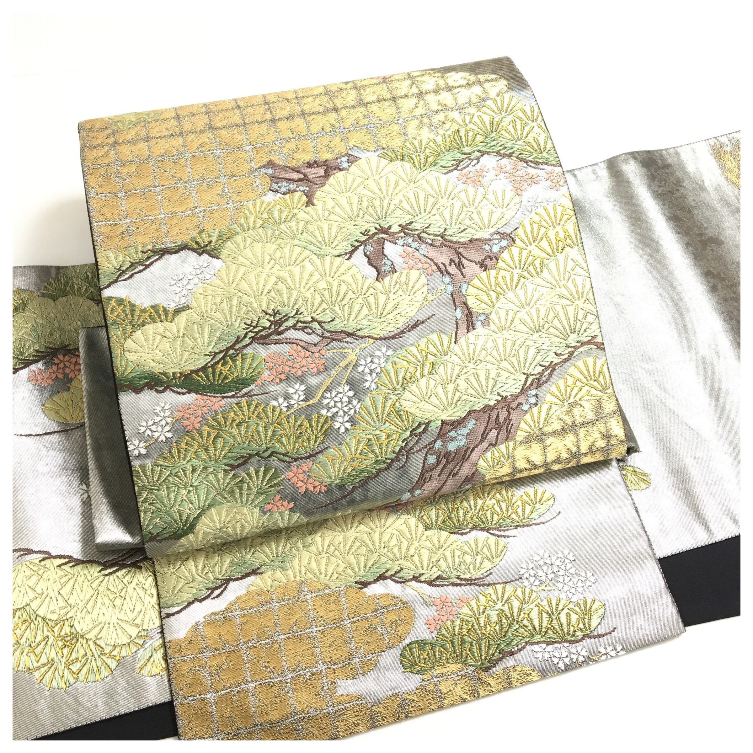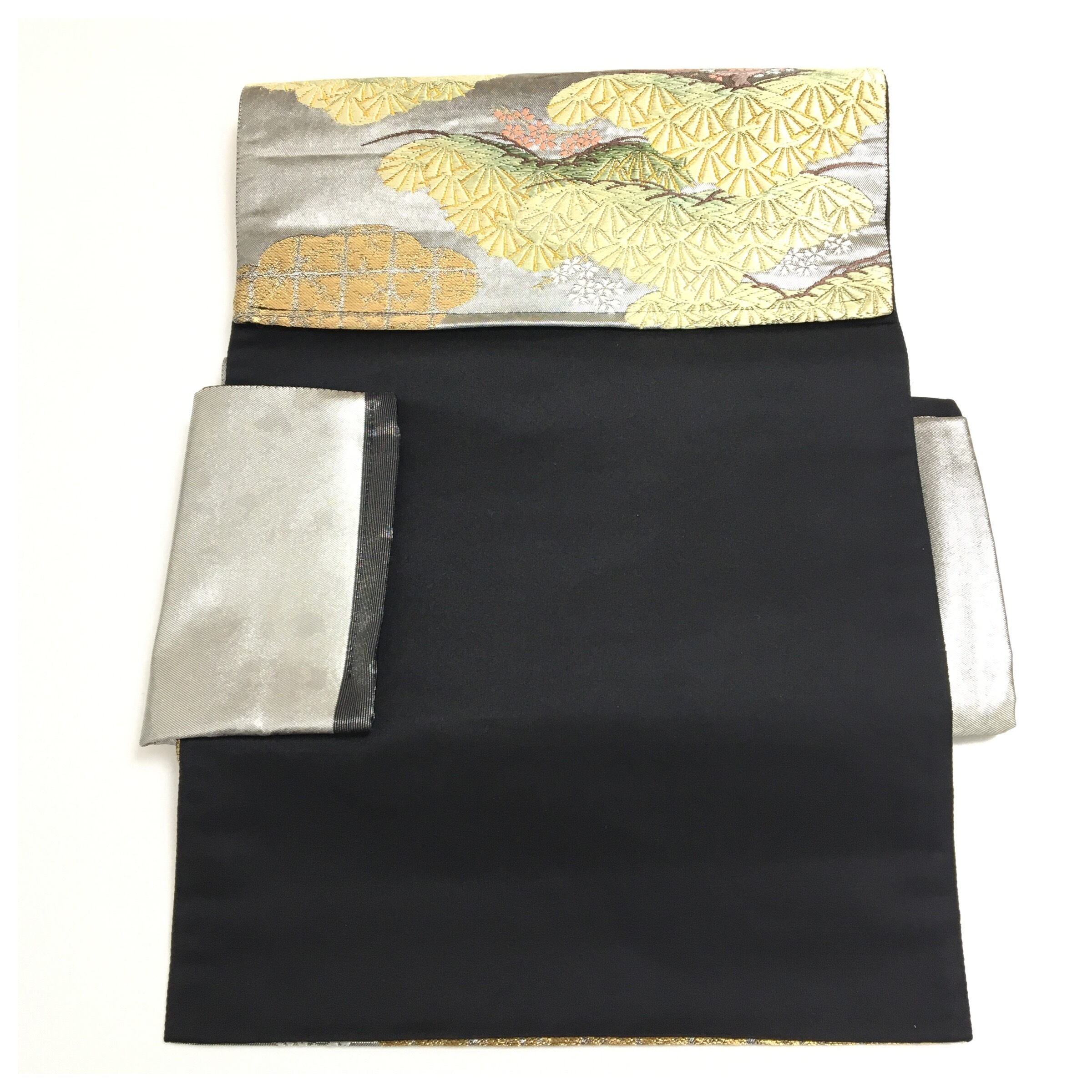 美品 正絹 ブラックシルバー 松模様 二部式 二重太鼓 作り帯 です。