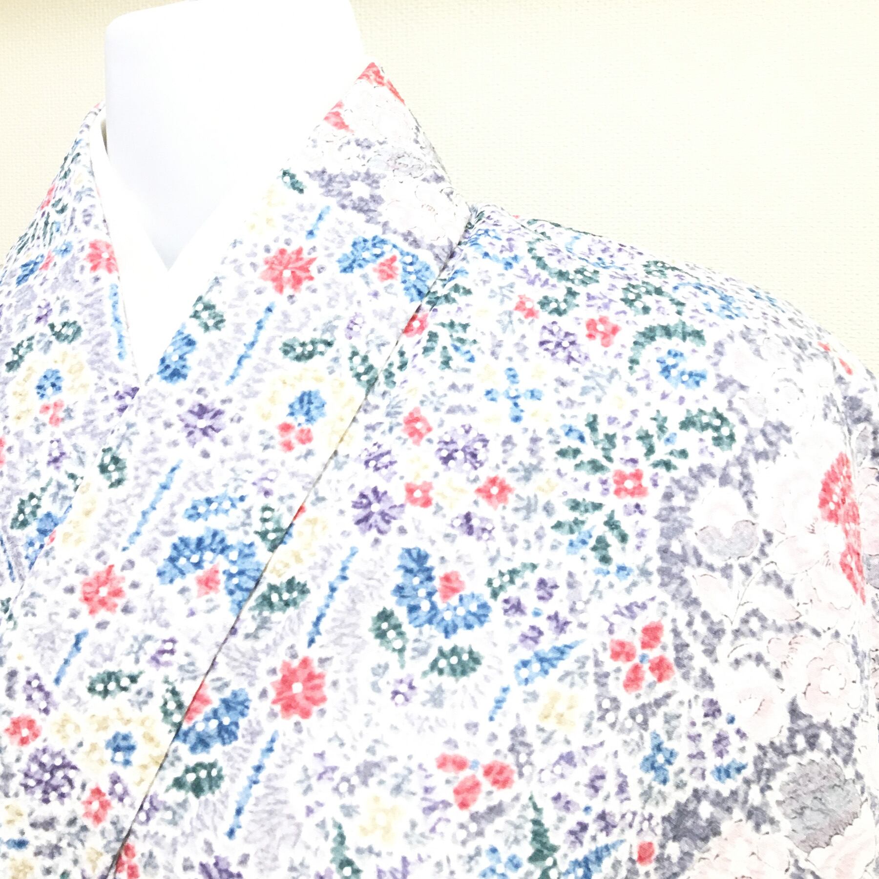 質の良い化繊素材の柔らかい手触りで華やかなデザインが目を惹く小紋です。