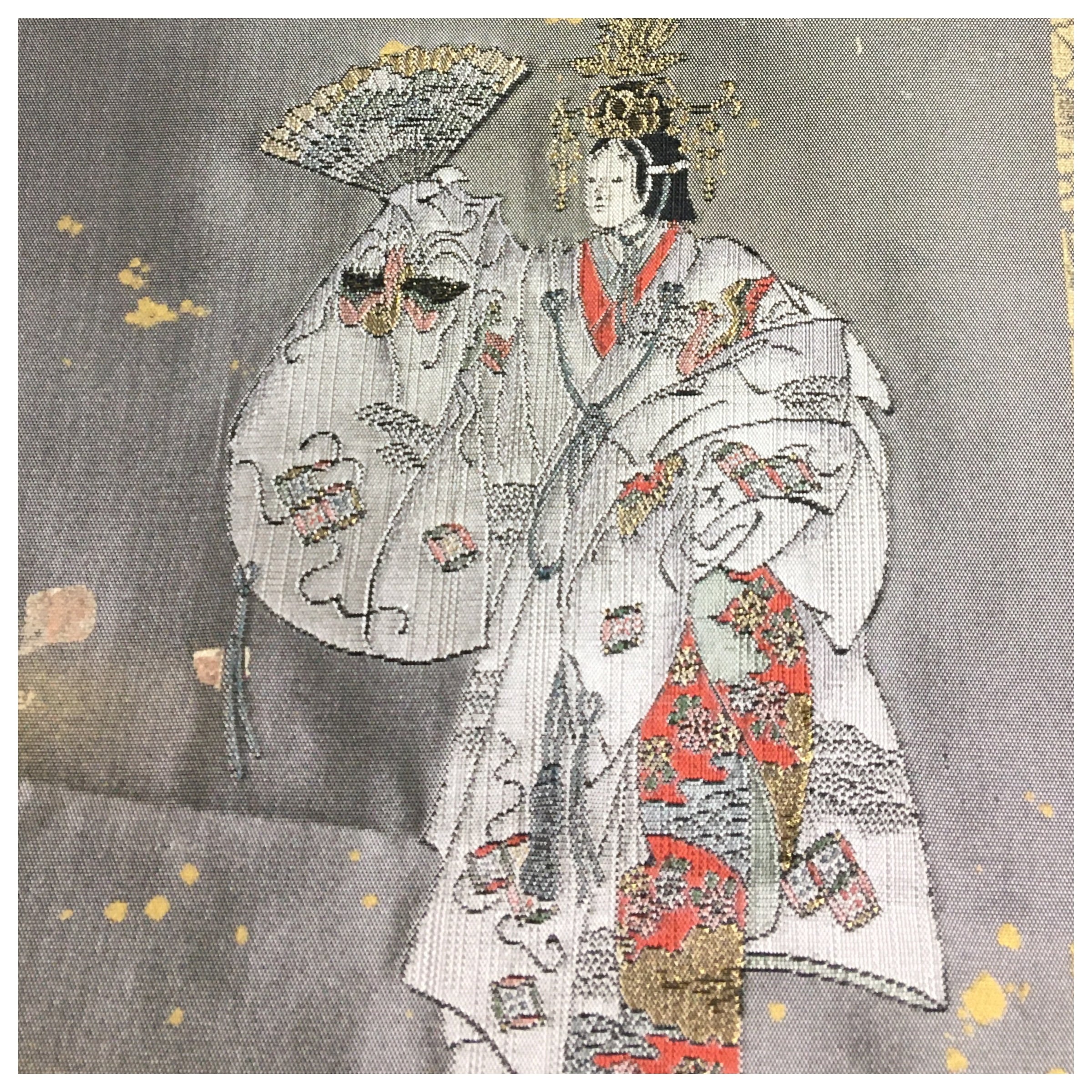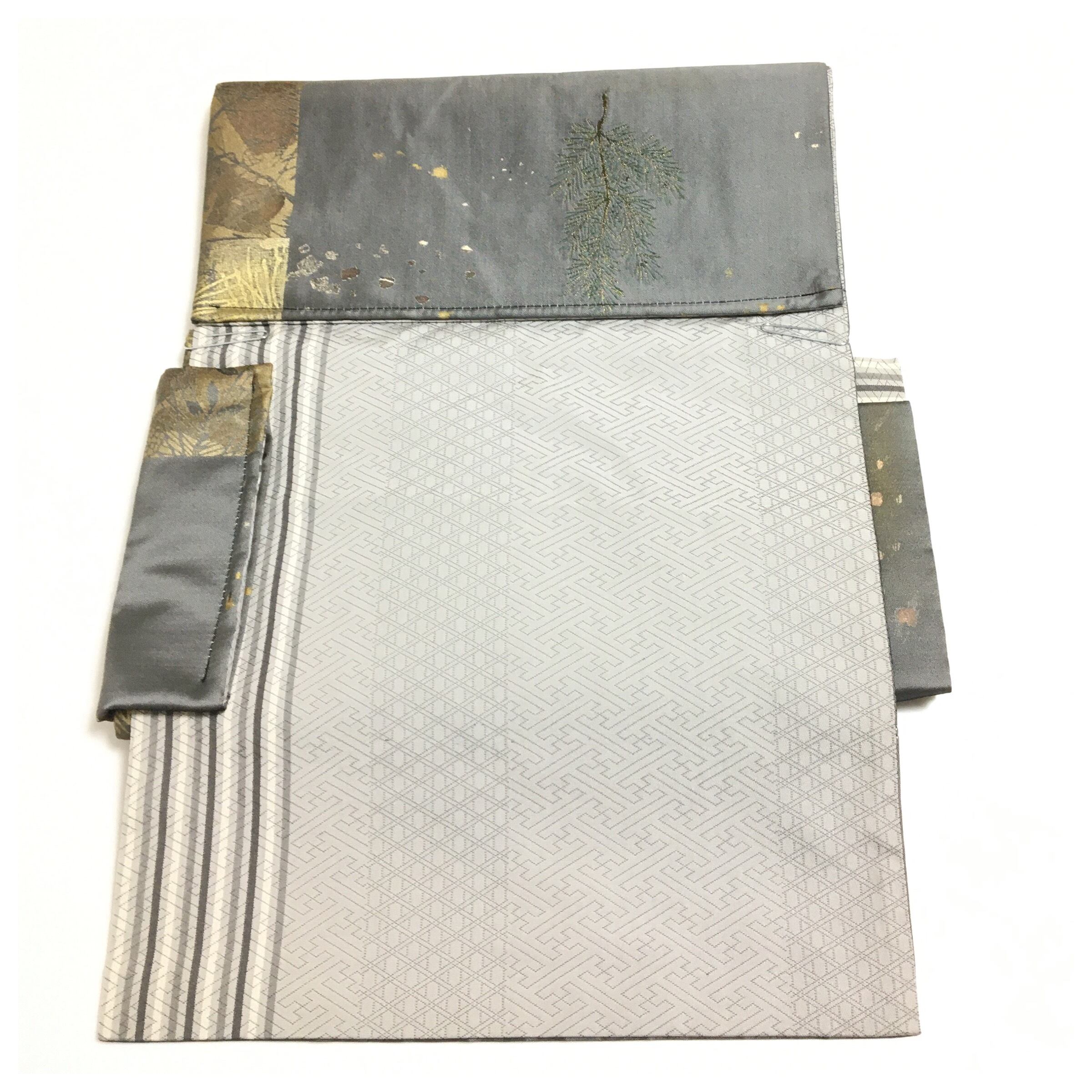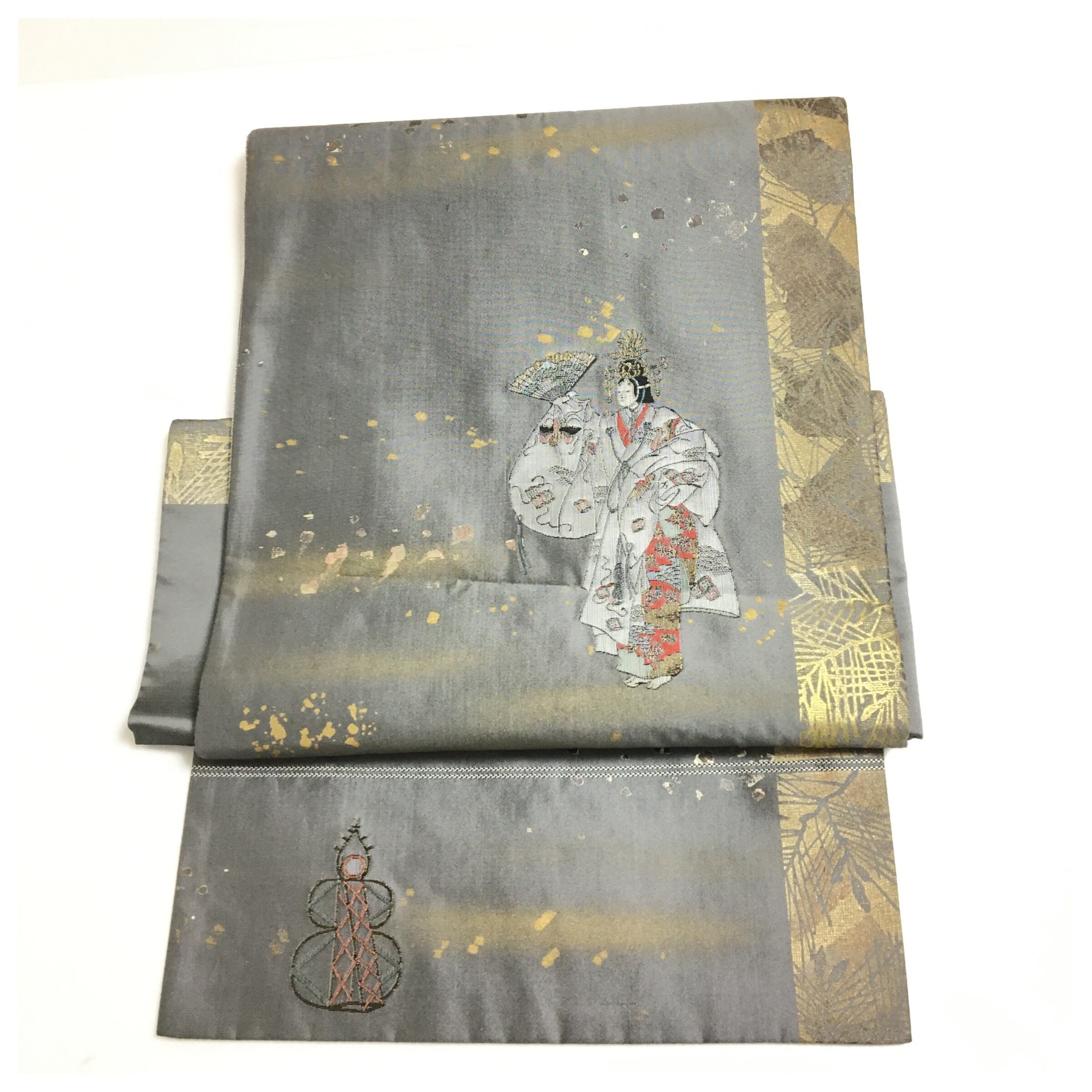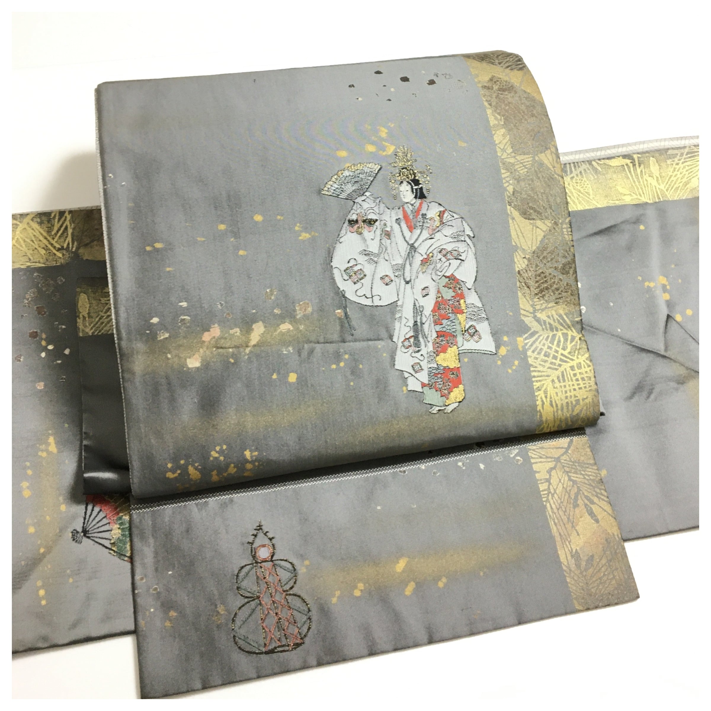 正絹 付け帯 楽帯 能柄 グレー 二部式 二重太鼓 作り帯 です。