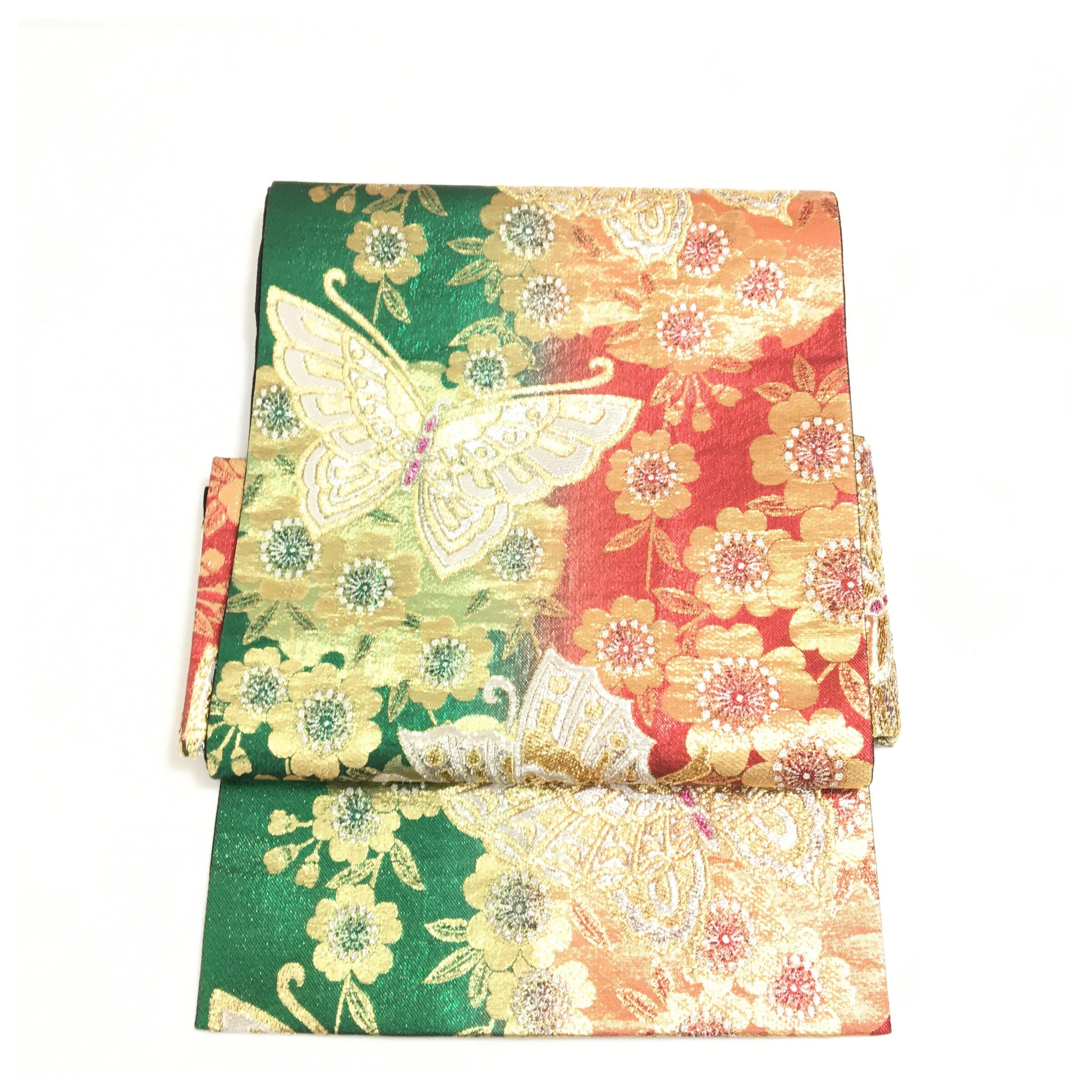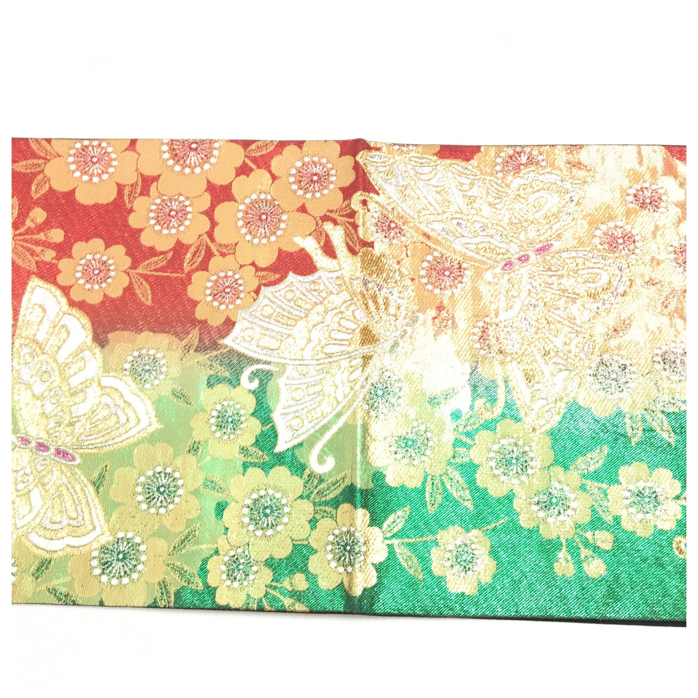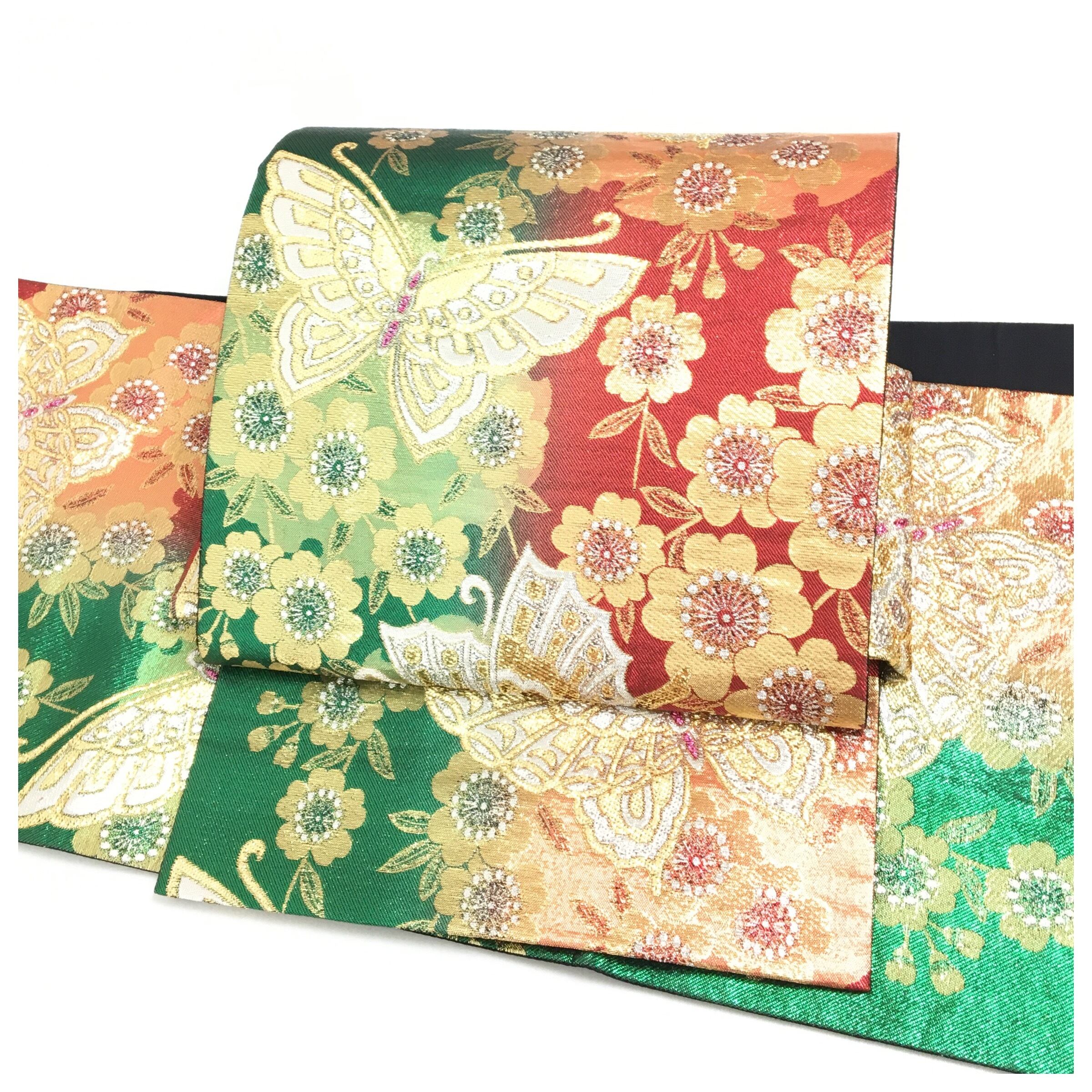 正絹 付け帯 蝶々 赤 緑 二部式 二重太鼓 作り帯 です。