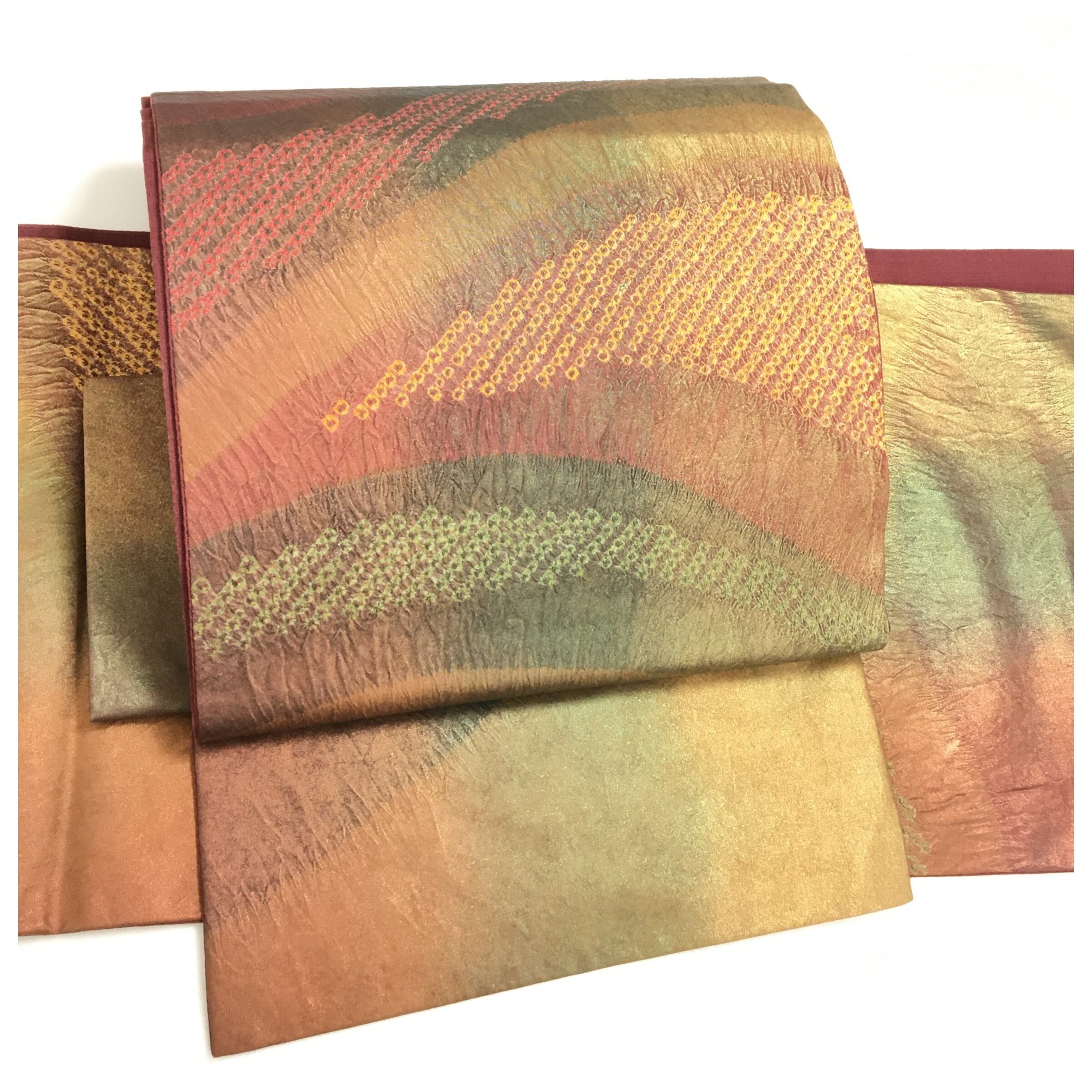 美品 正絹 楽帯 袋帯 茶 鹿の子柄 二部式 二重太鼓 作り帯 です。