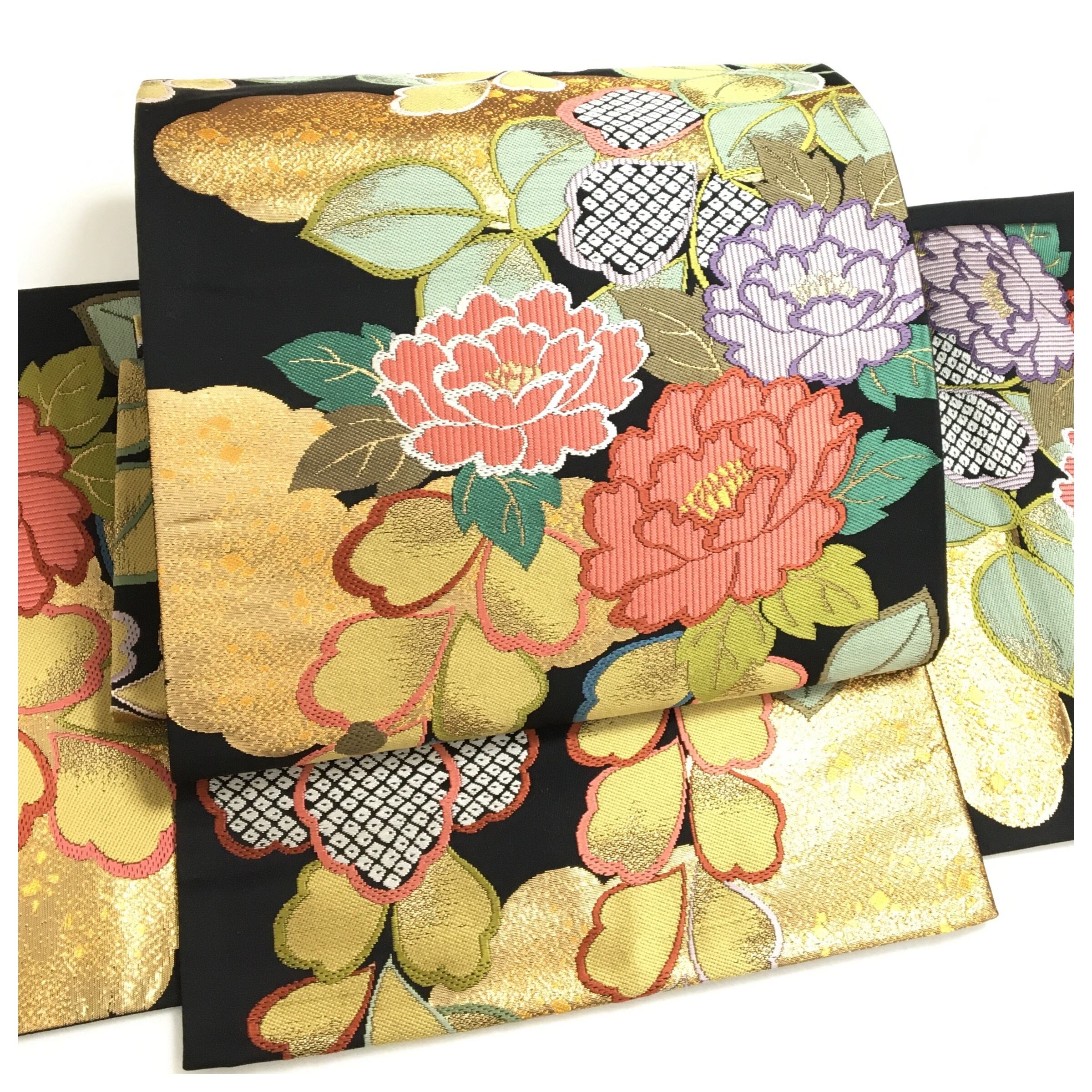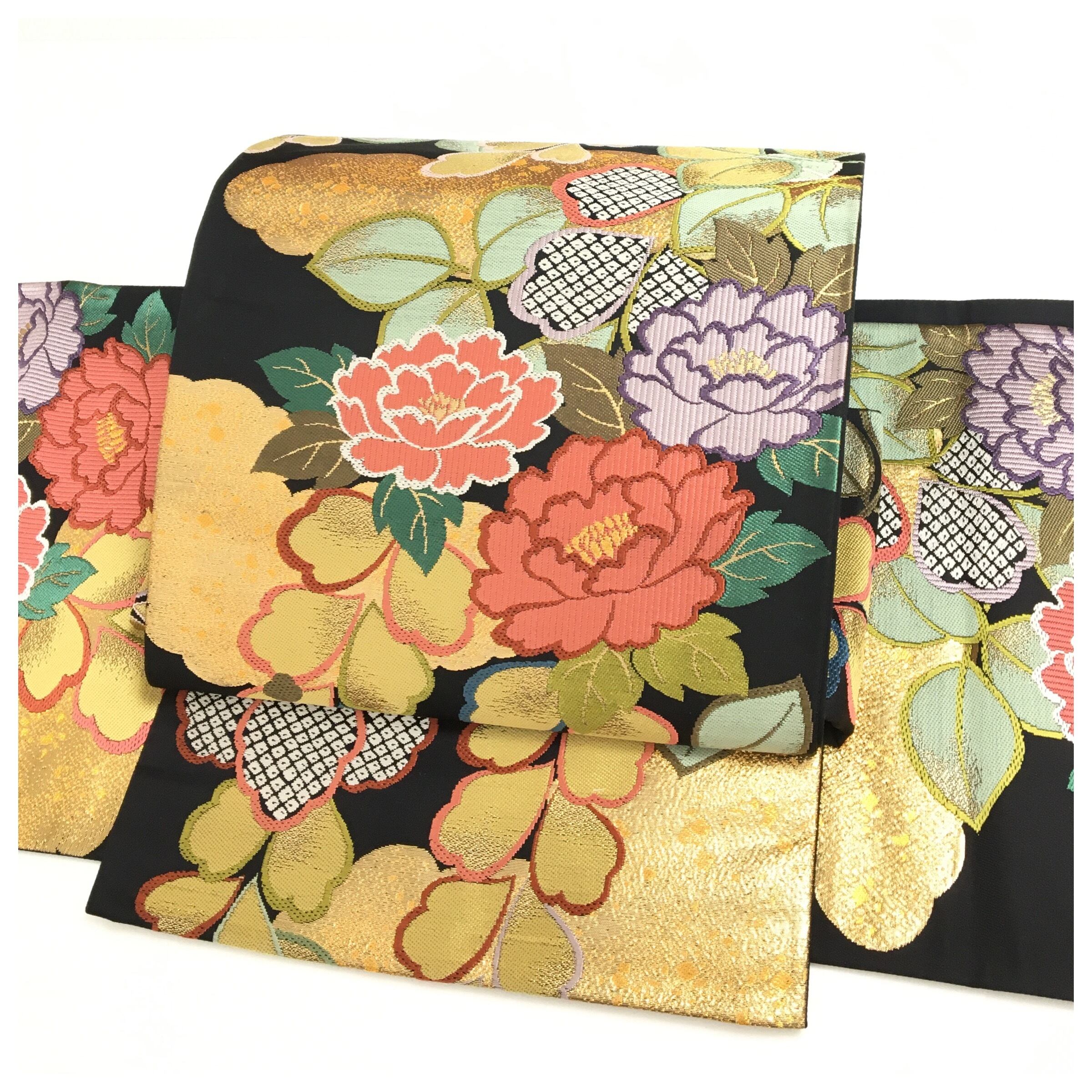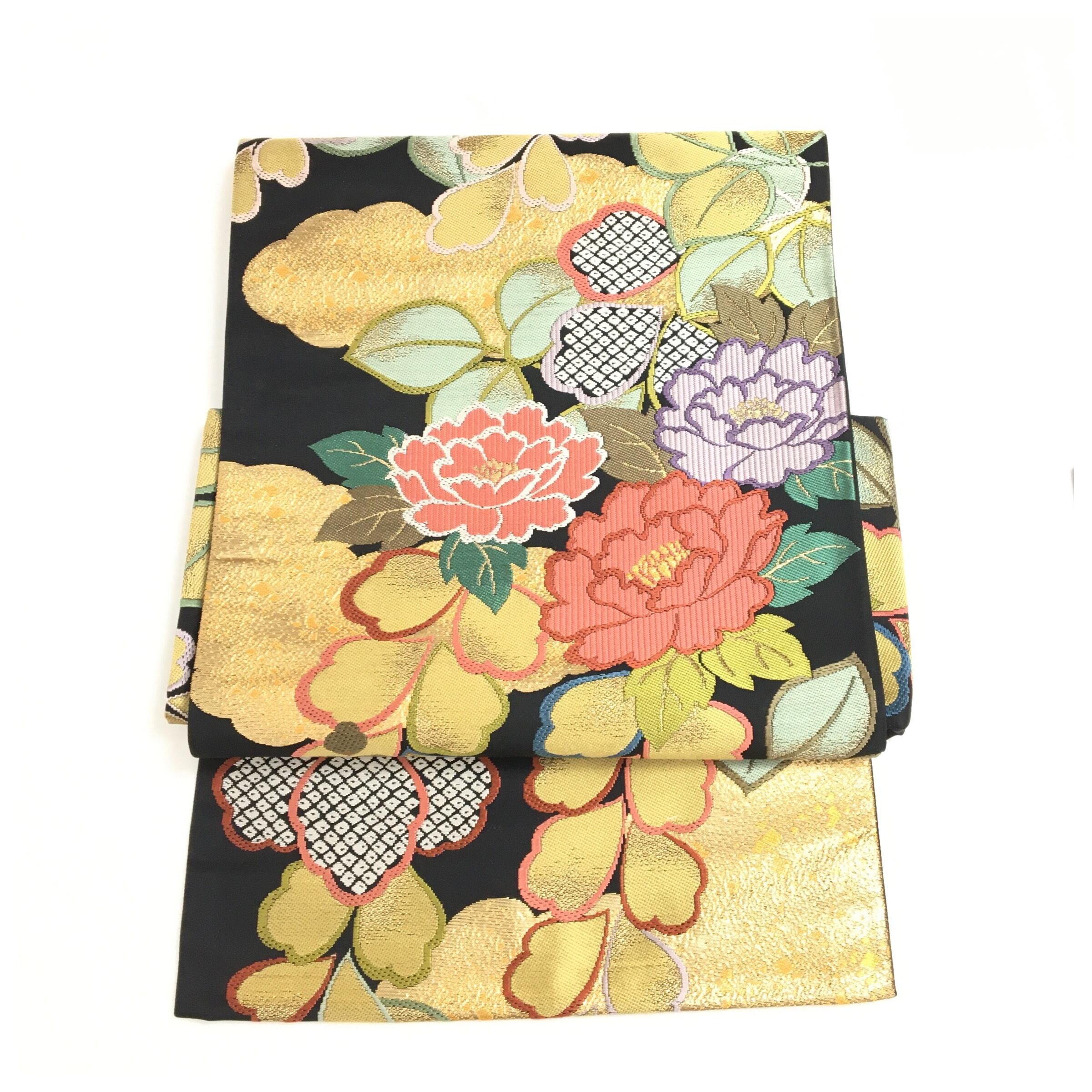 美品 正絹 楽帯 袋帯 黒 華柄 二部式 二重太鼓 作り帯 です。