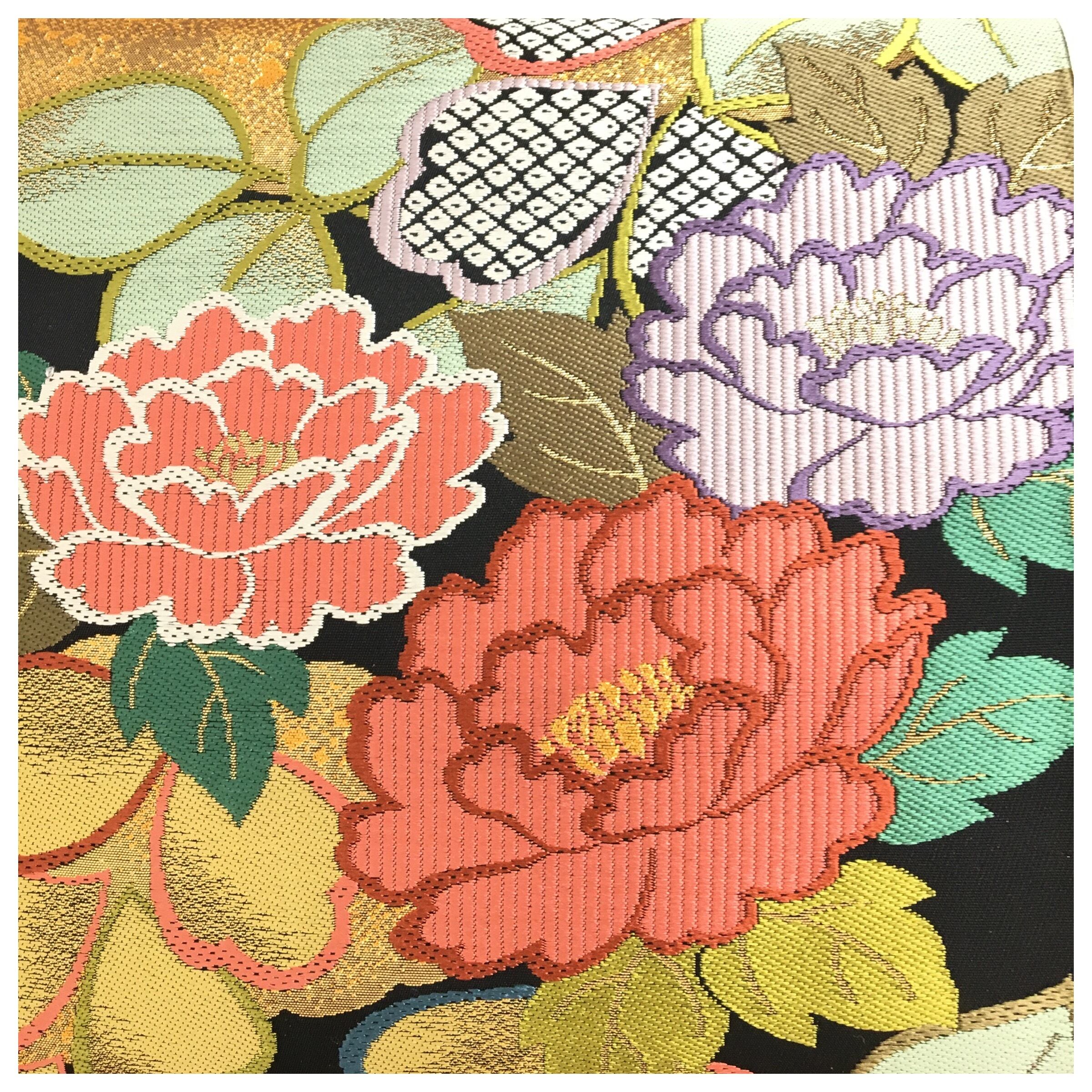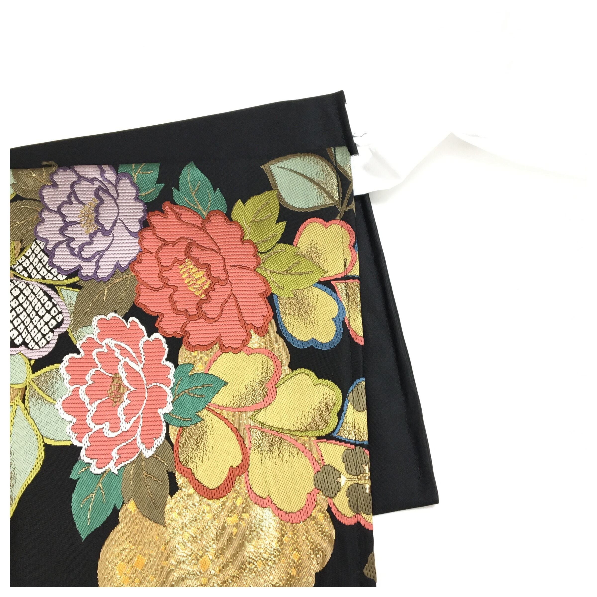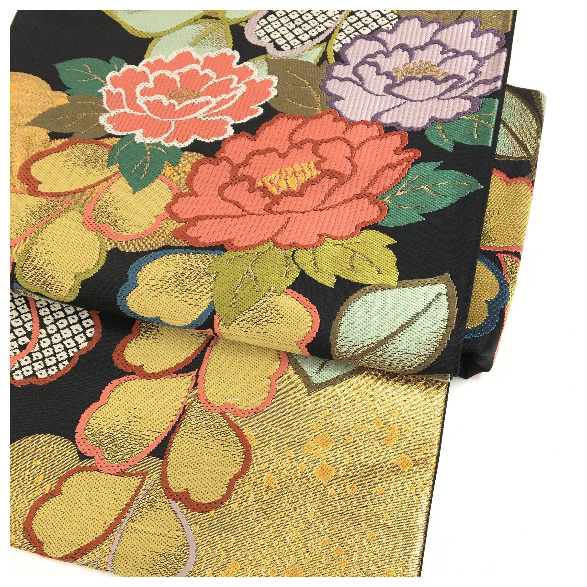 美品 正絹 楽帯 袋帯 黒 華柄 二部式 二重太鼓 作り帯 です。