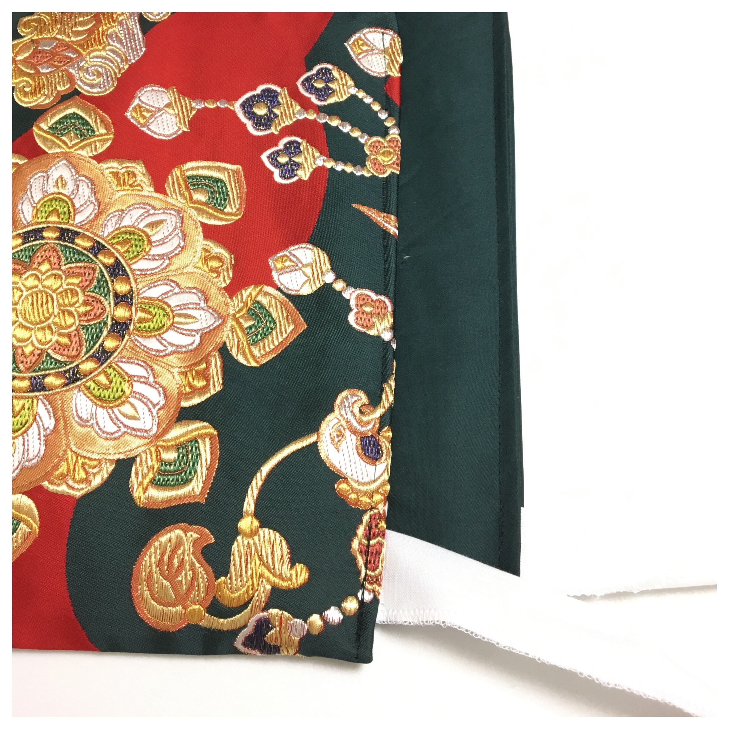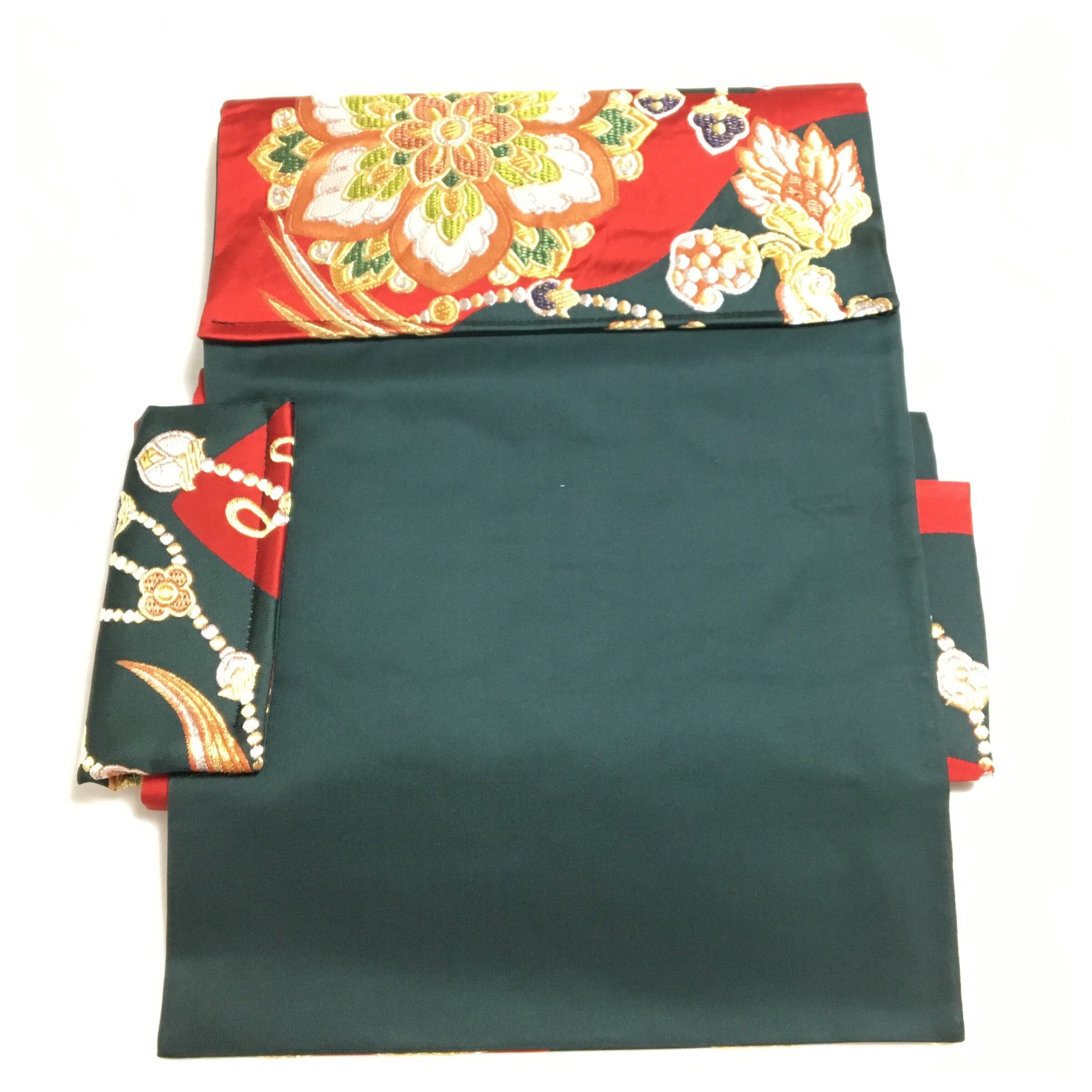 正絹 楽帯 袋帯 華喰い鳥 緑x赤 二部式 二重太鼓 作り帯 です。