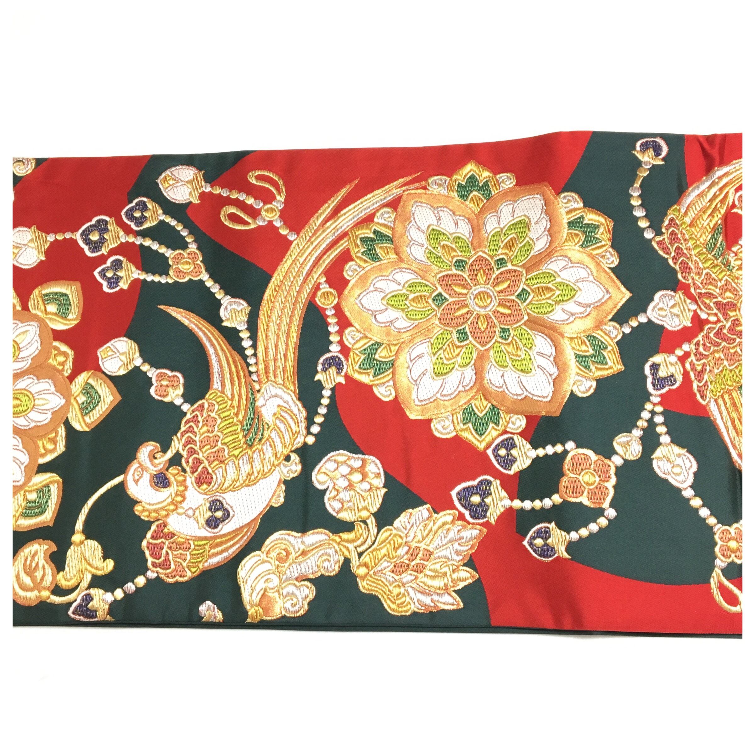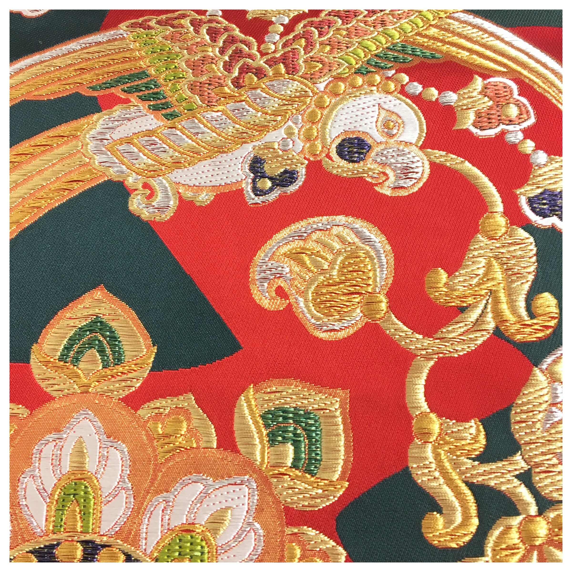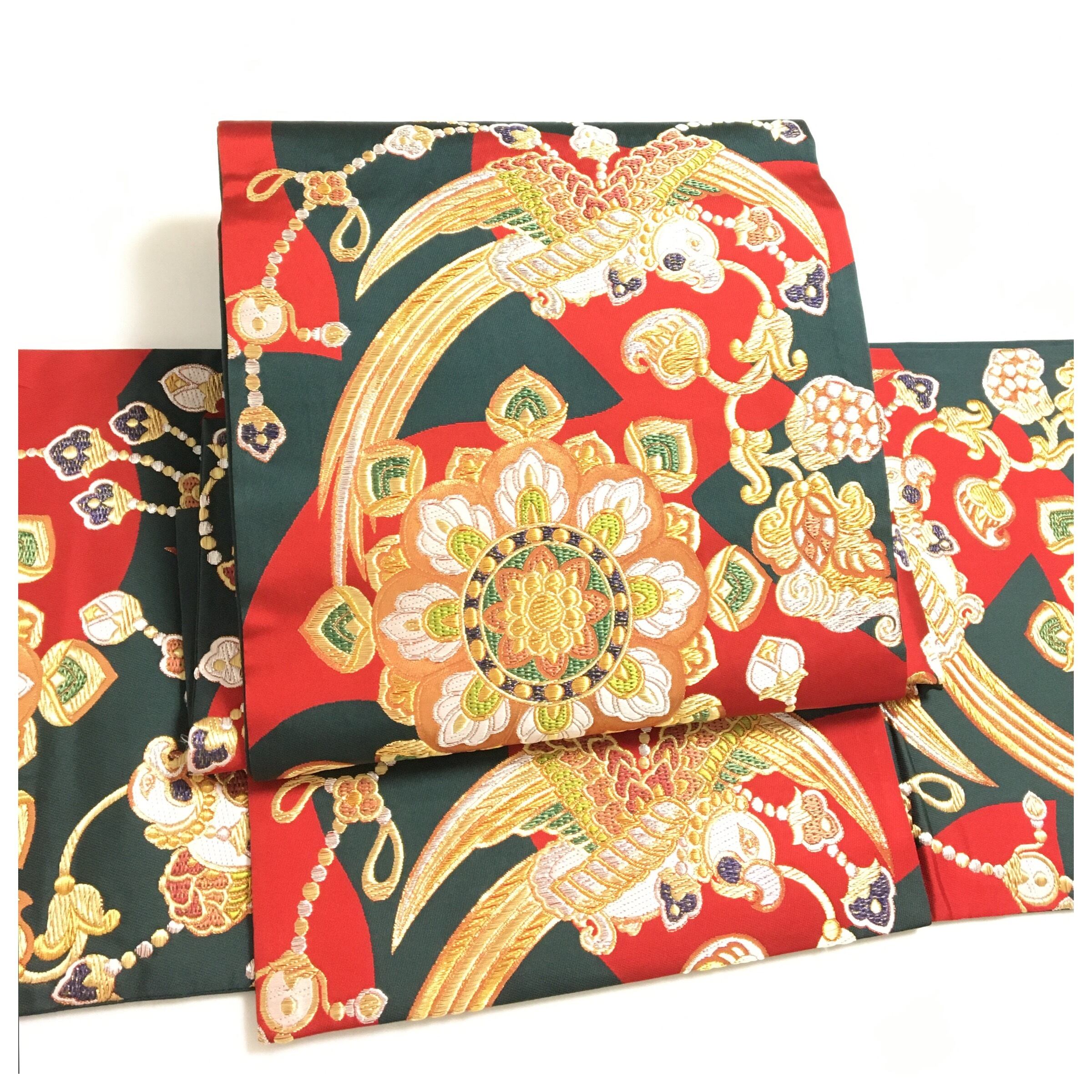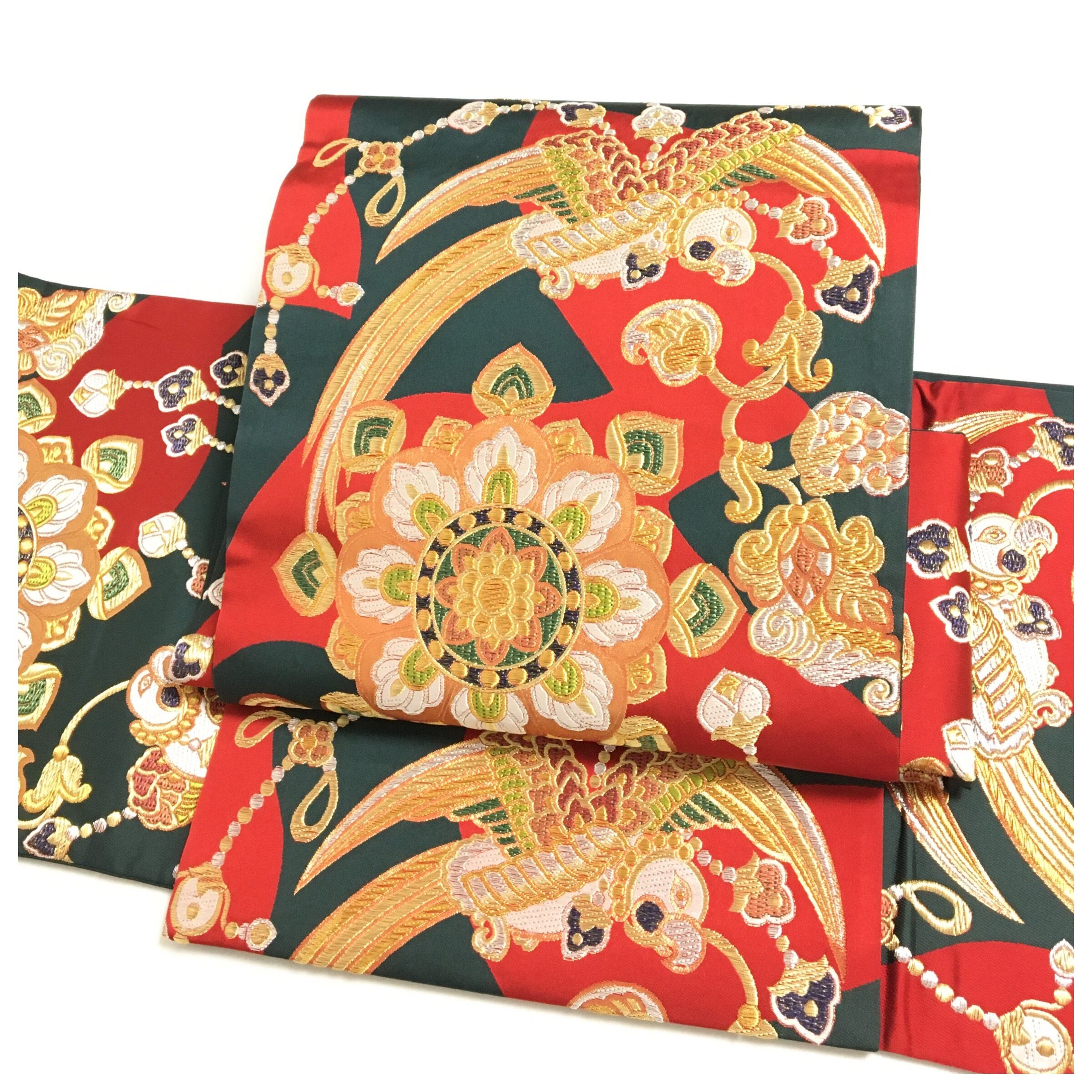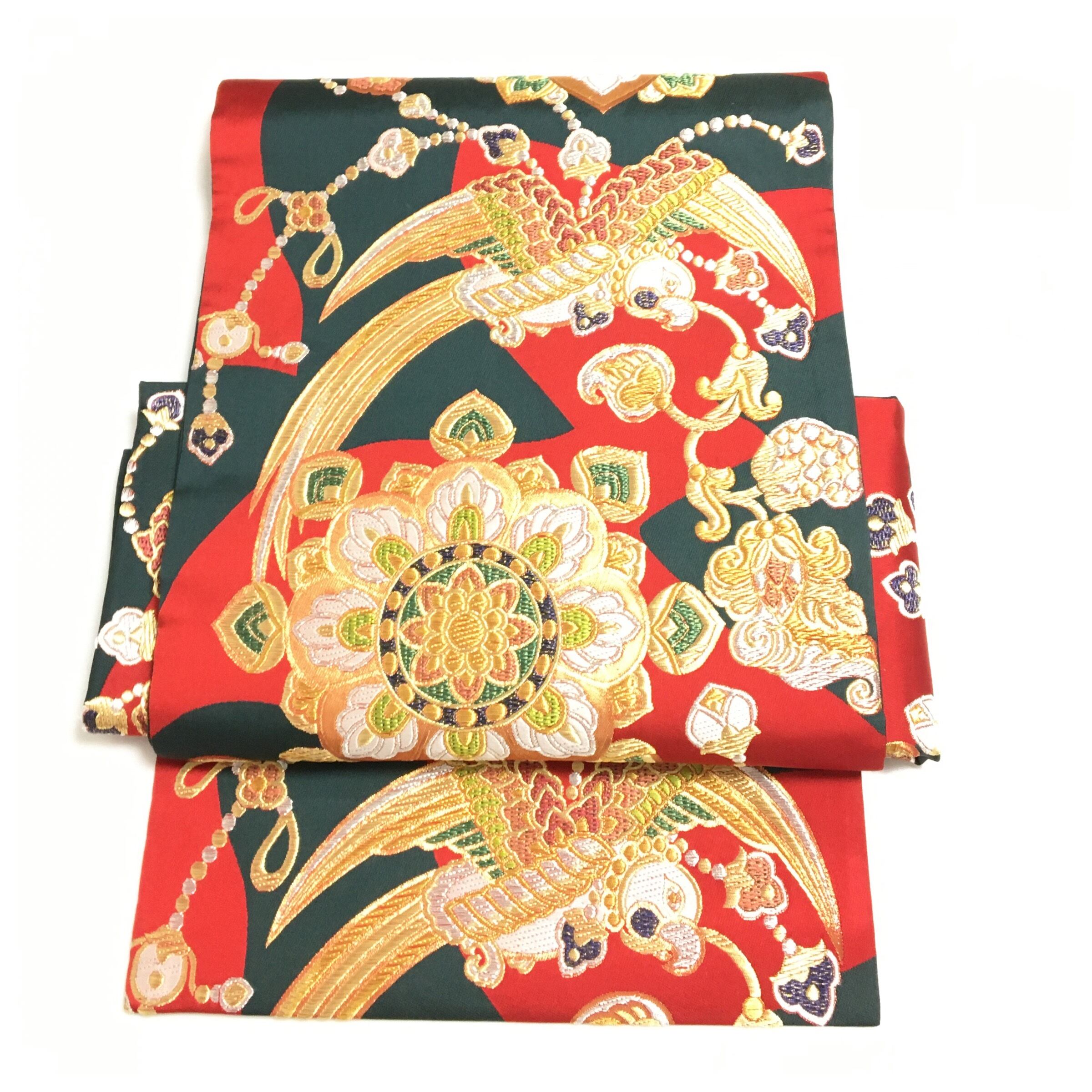 赤と緑の帯地に金彩の華喰い鳥が目を惹きます。