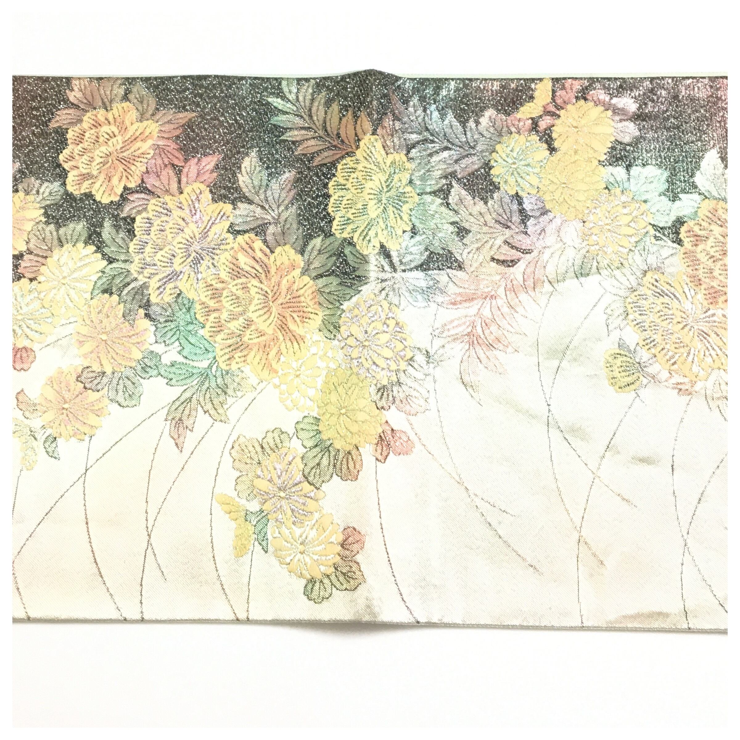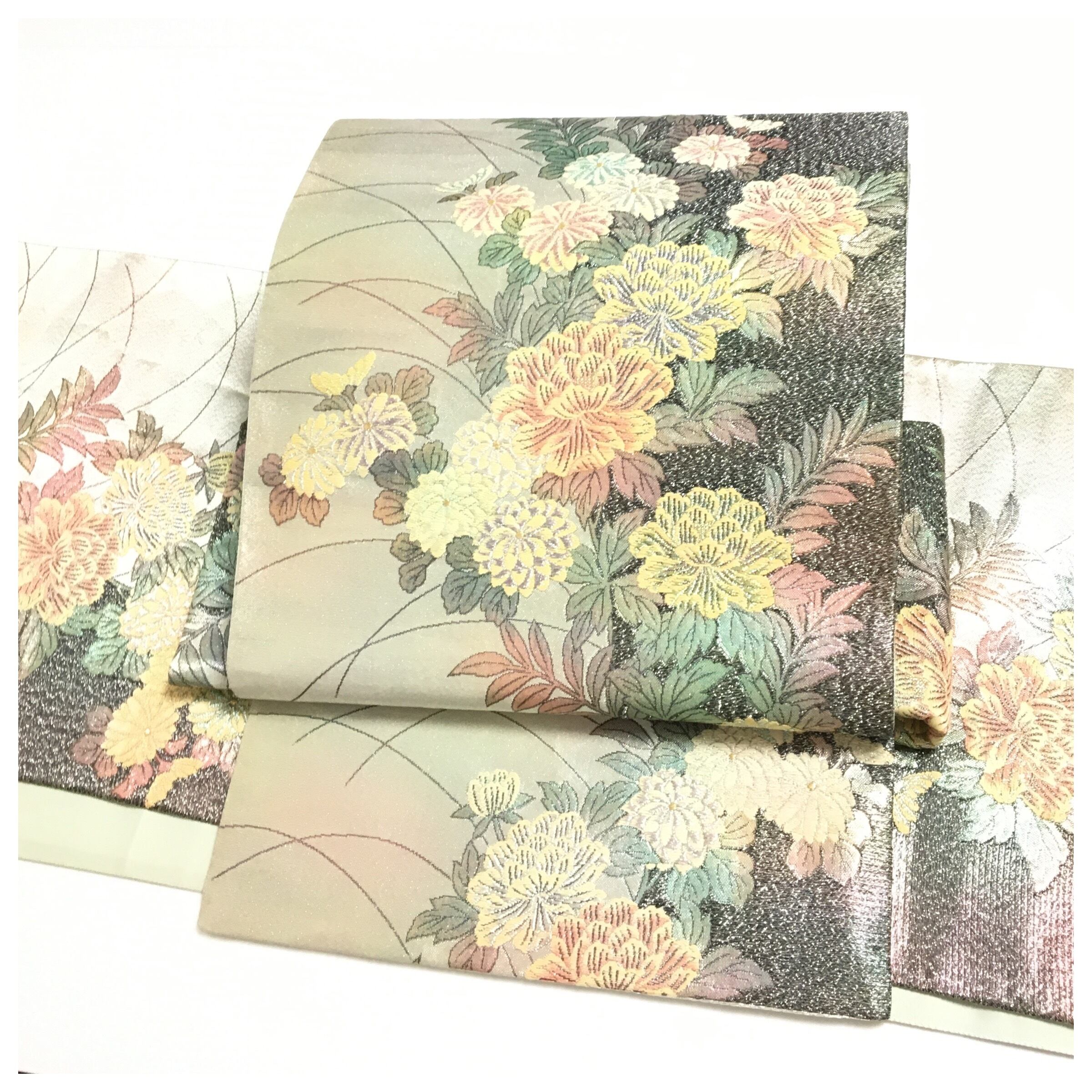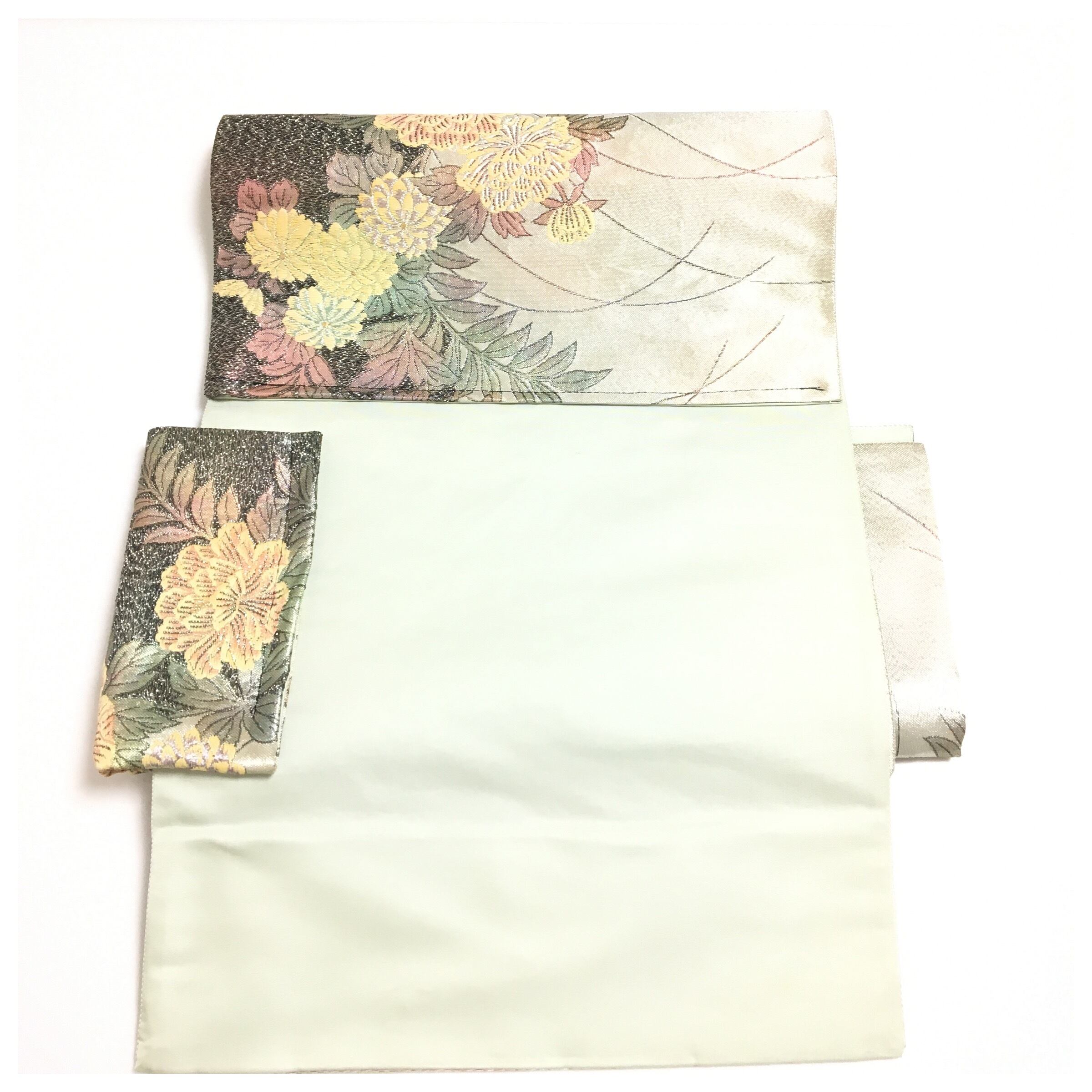 正絹 付け帯 薄いグリーン 華模様 薄手 二部式 二重太鼓 作り帯 です。