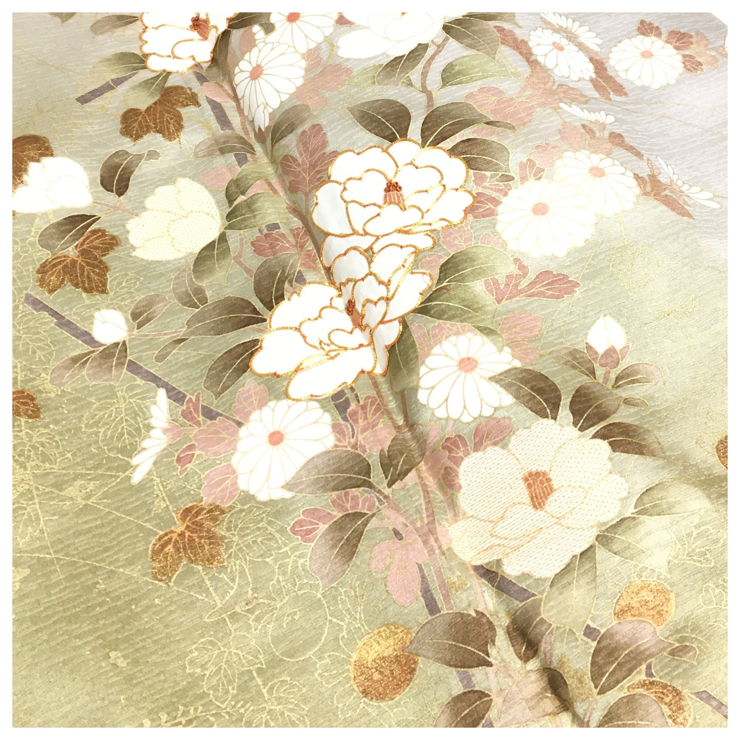 優雅な椿や菊が咲き誇る、気品に満ちた訪問着です。