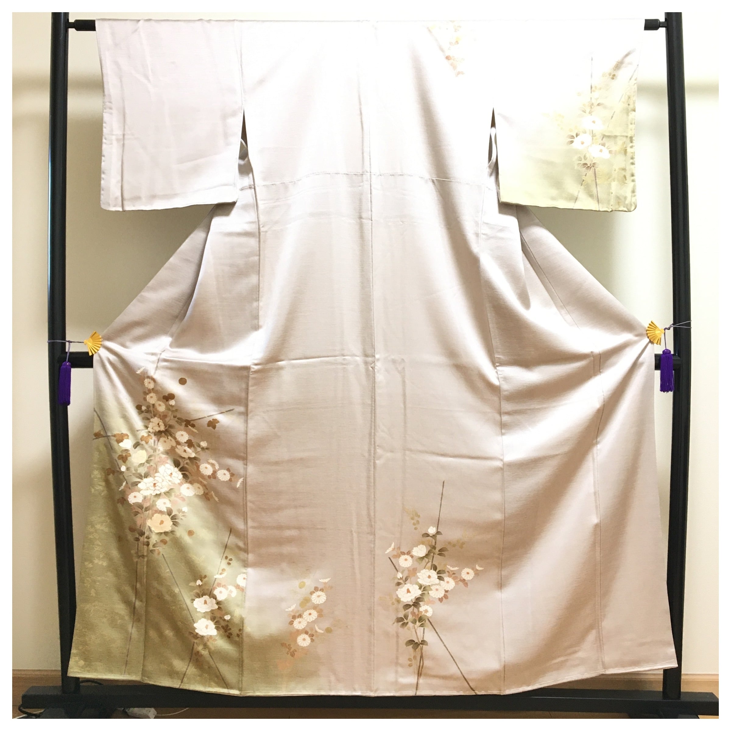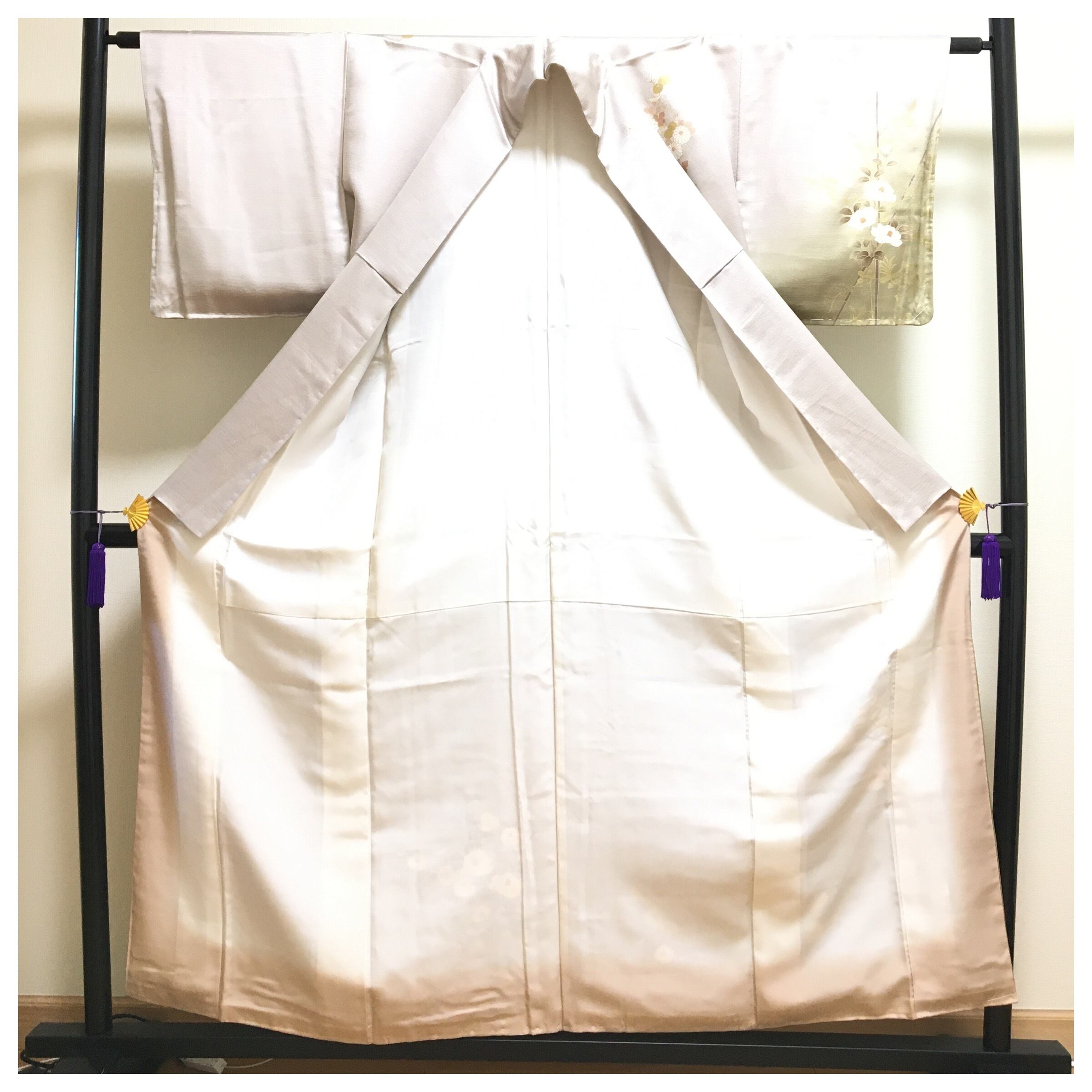 【美品・仕付け付き】正絹 訪問着 一つ紋 グレージュ 椿 菊 袷