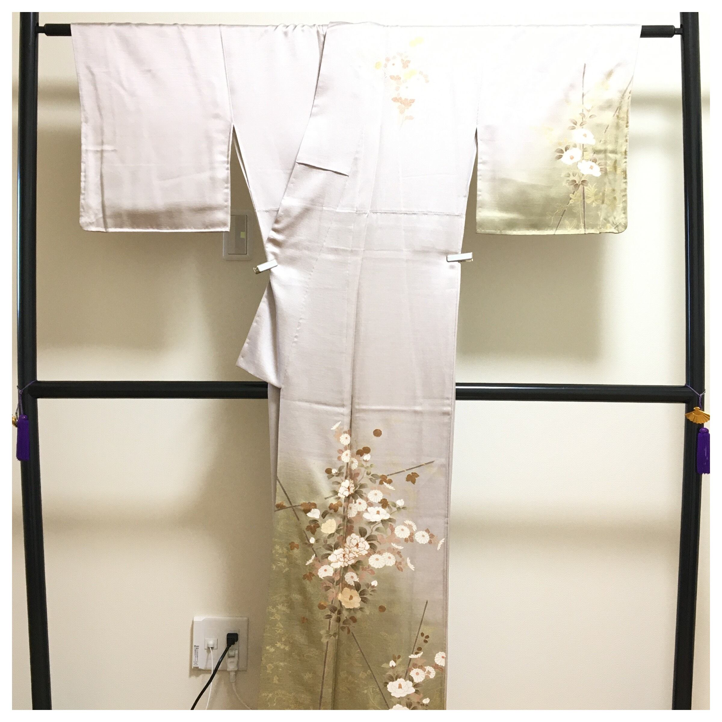 裾にかけて淡い緑や茶へと移ろう贅沢なボカシ染めが施されており、