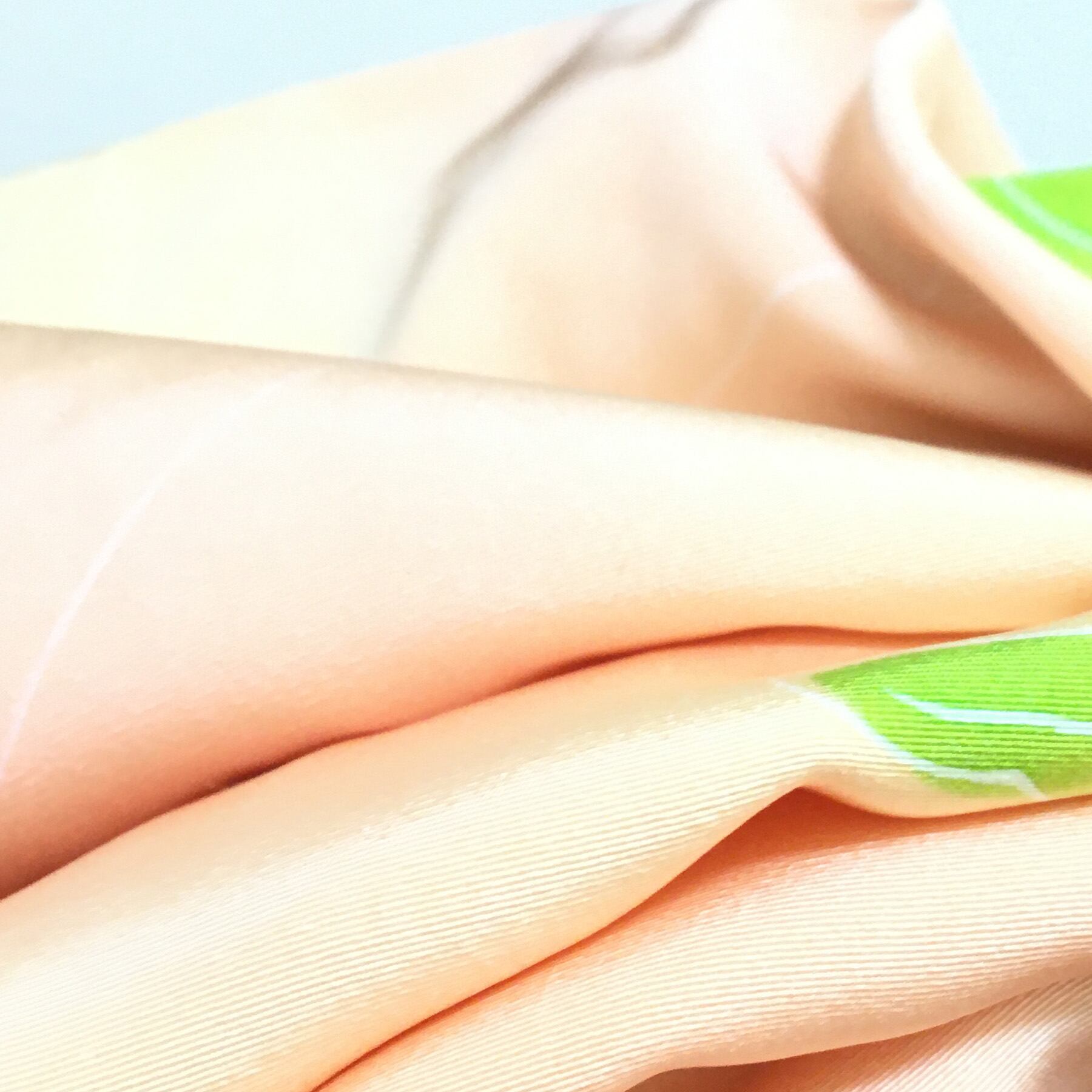 流れるような筆致で描かれたお花は、どこか北欧デザインのようなモダンさも感じさせ、伝統的な着物姿にフレッシュな可愛らしさをプラスしてくれます。正絹ならではのしっとりとした艶と、軽やかな着心地を存分に楽しめる一着です。