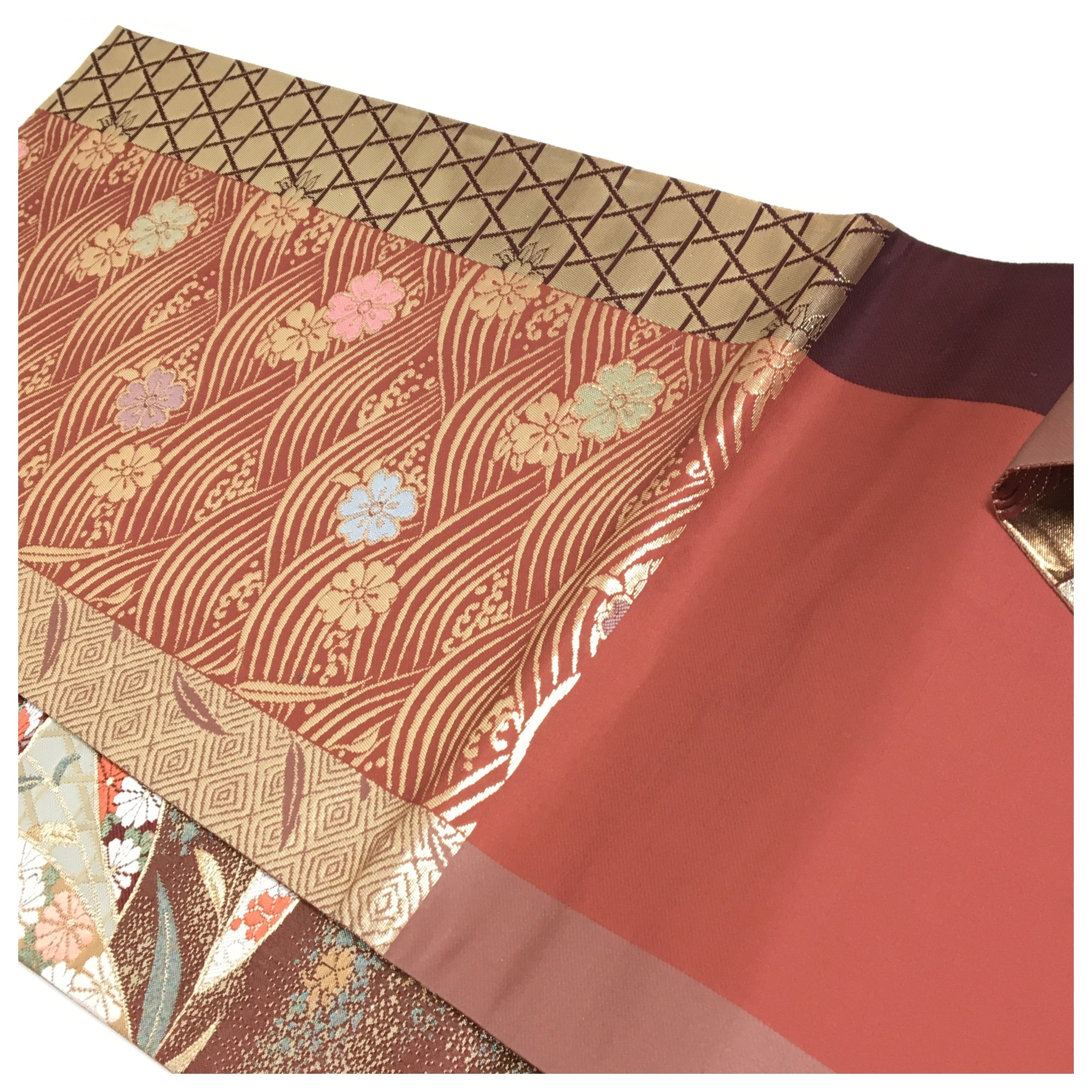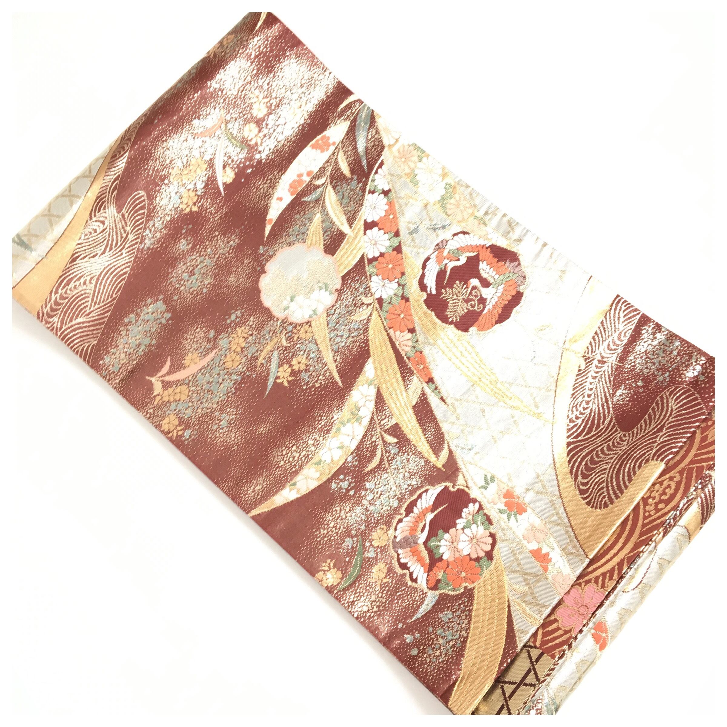 しっとりと気品あふれるボルドー(赤茶・エンジ系)の地に、金糸の煌めきが映える、正統派の袋帯です。
