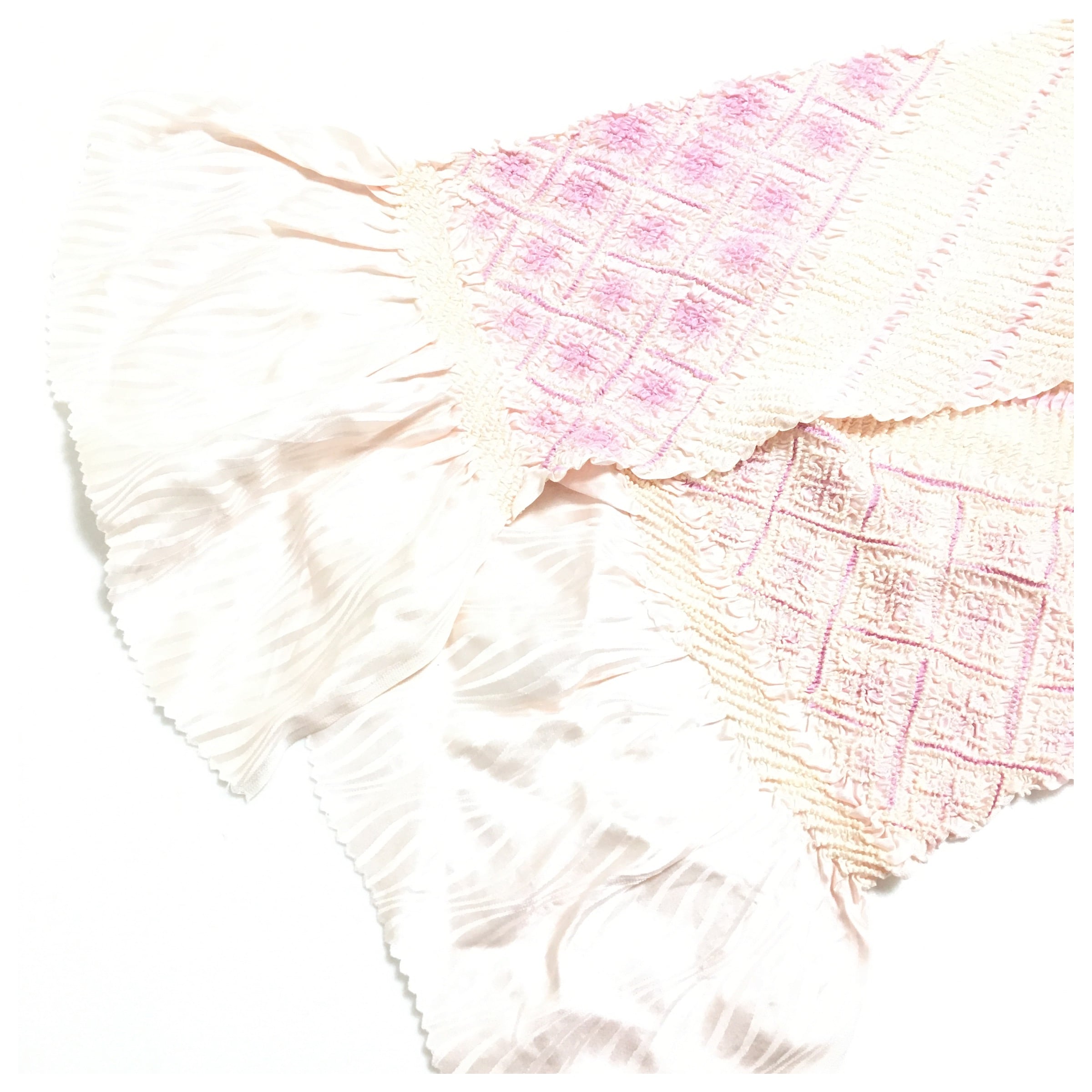 もう1枚は、ピンクの総絞り。ふっくらとした凹凸が美しく、規則正しい文様がコーディネートのアクセントになります。