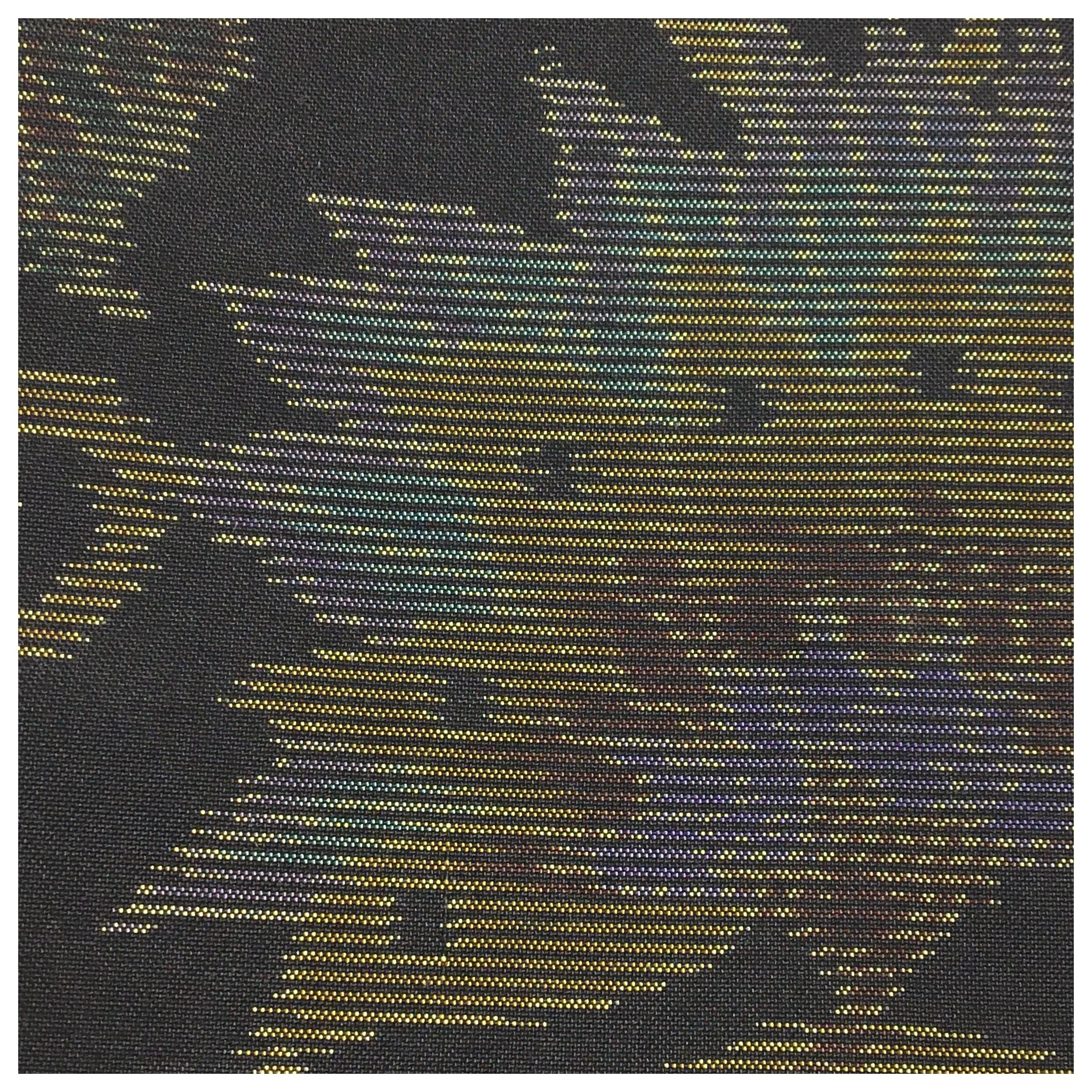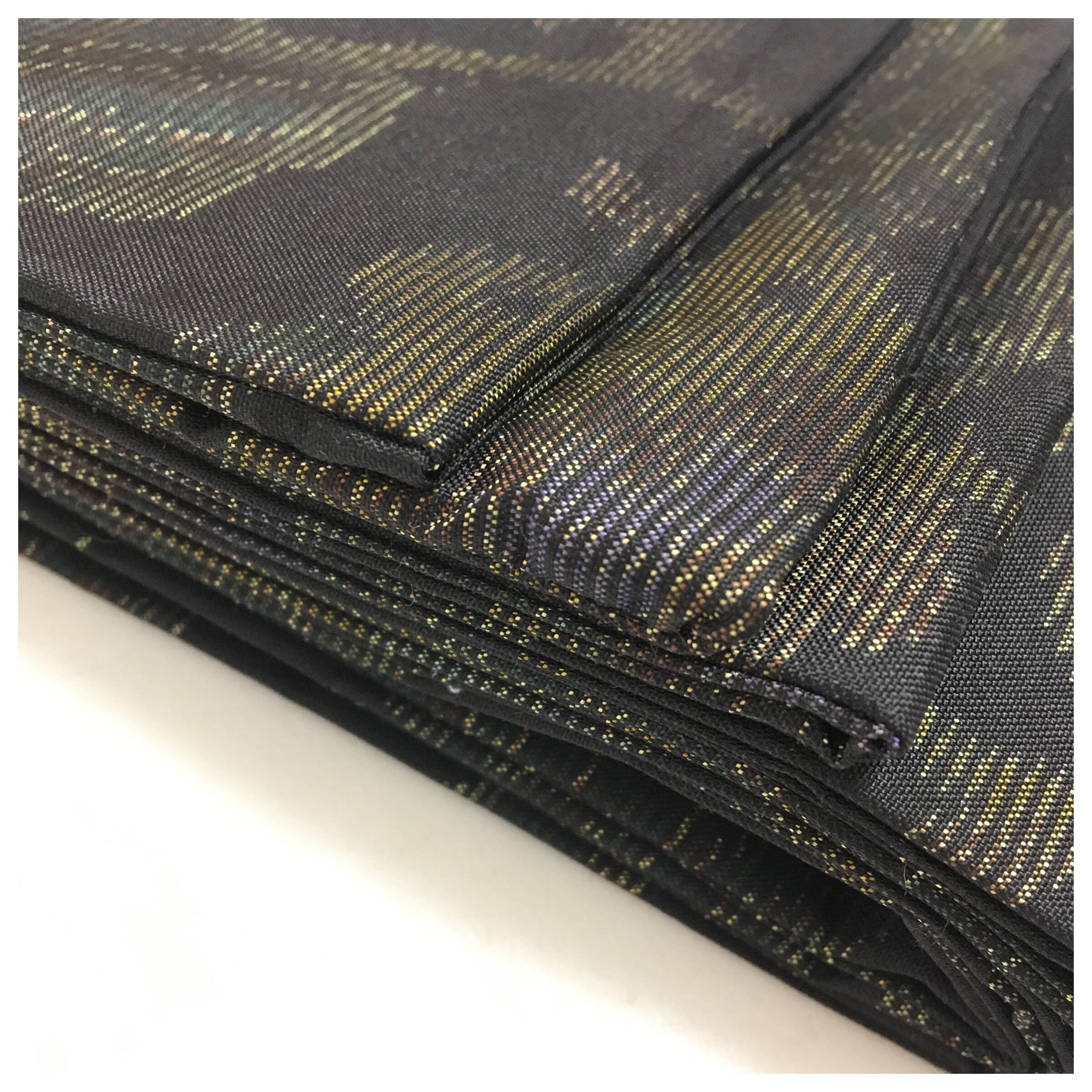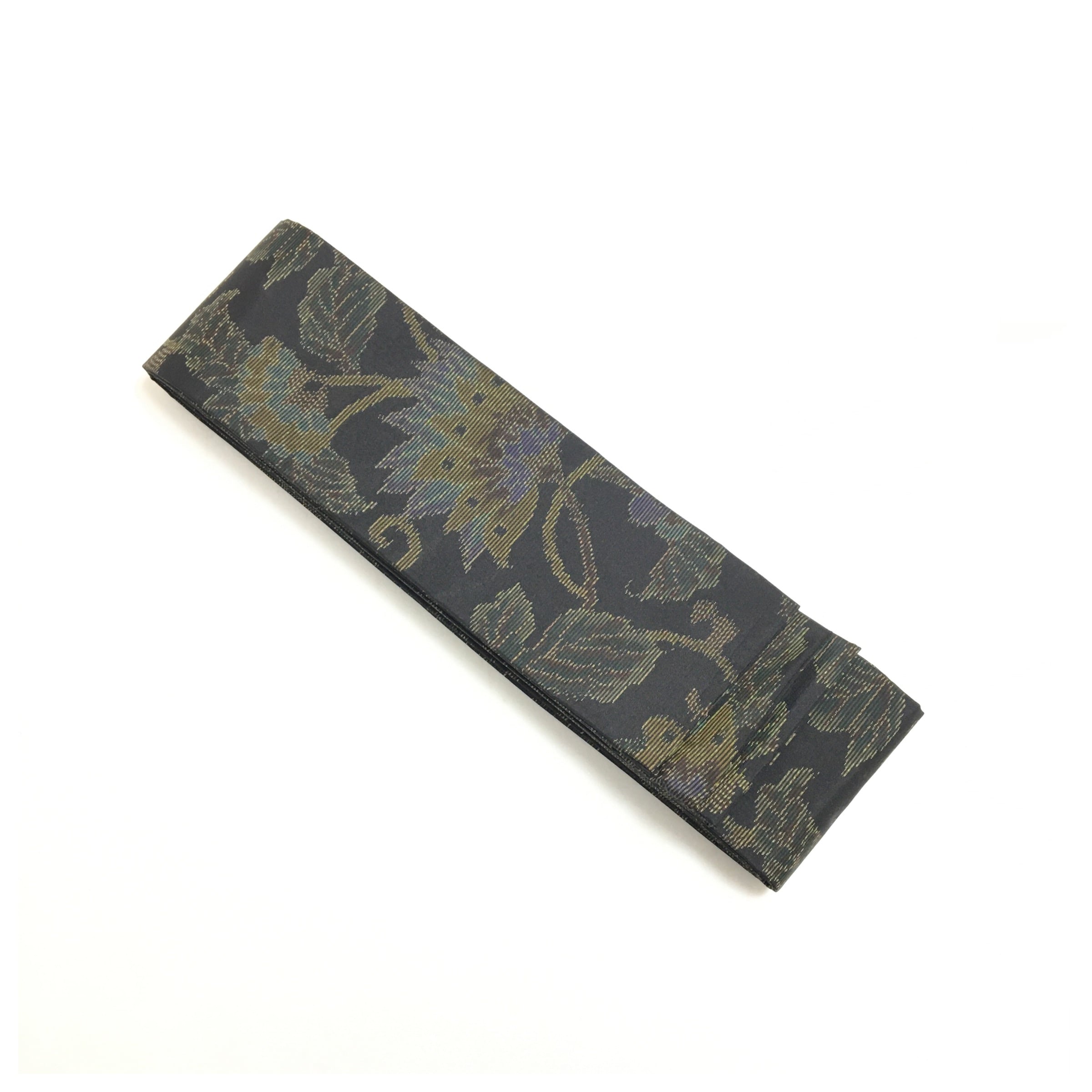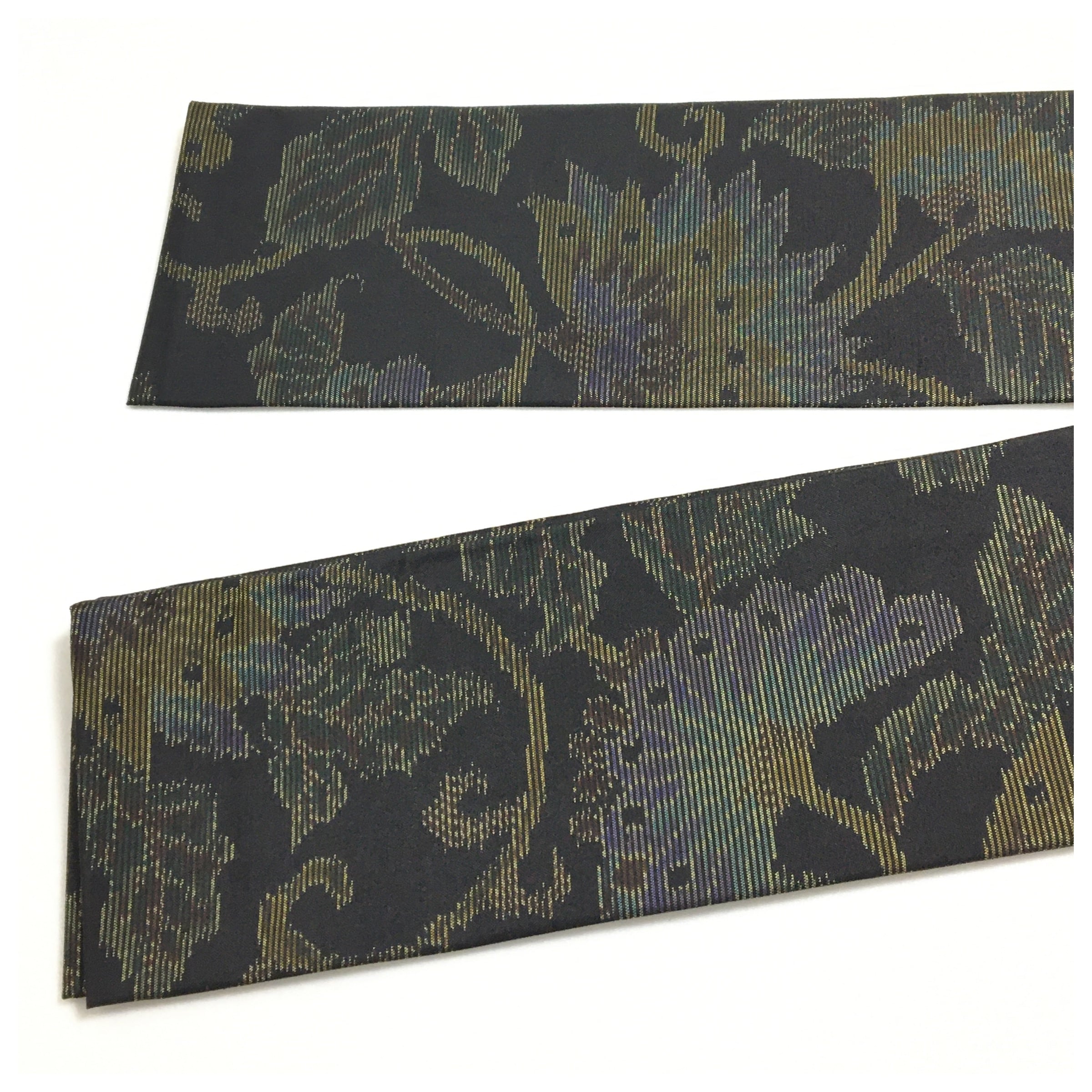 黒地に緑や青の玉虫色に輝く糸で、唐草文様とダイナミックな葉が織り出された、非常に粋で洗練された雰囲気の正絹角帯です。こちらは、お召をリメイクした作品となっております。