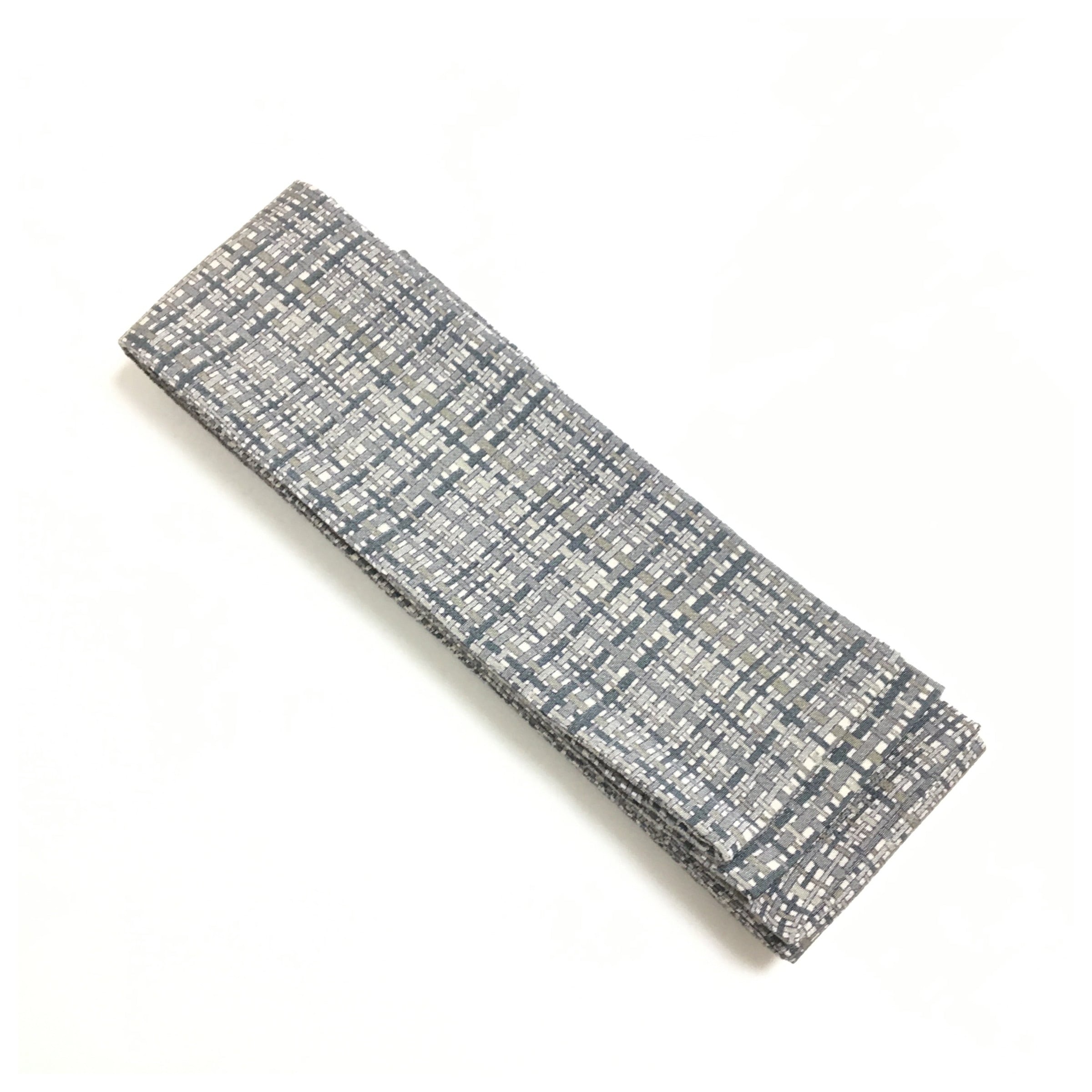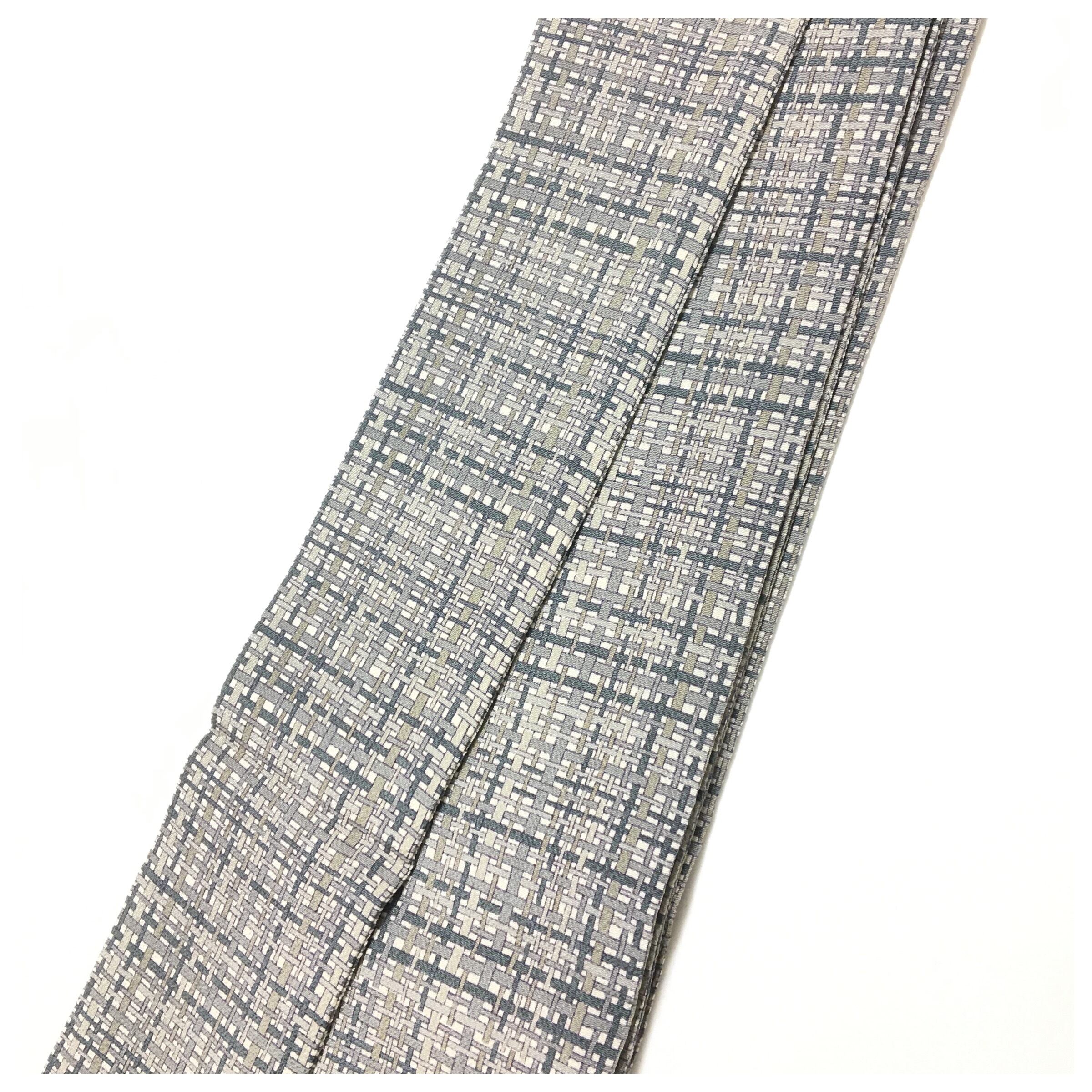 美品 正絹 角帯 縮緬 グレー 格子 網代文様 洒落もの カジュアル 長さ392cm