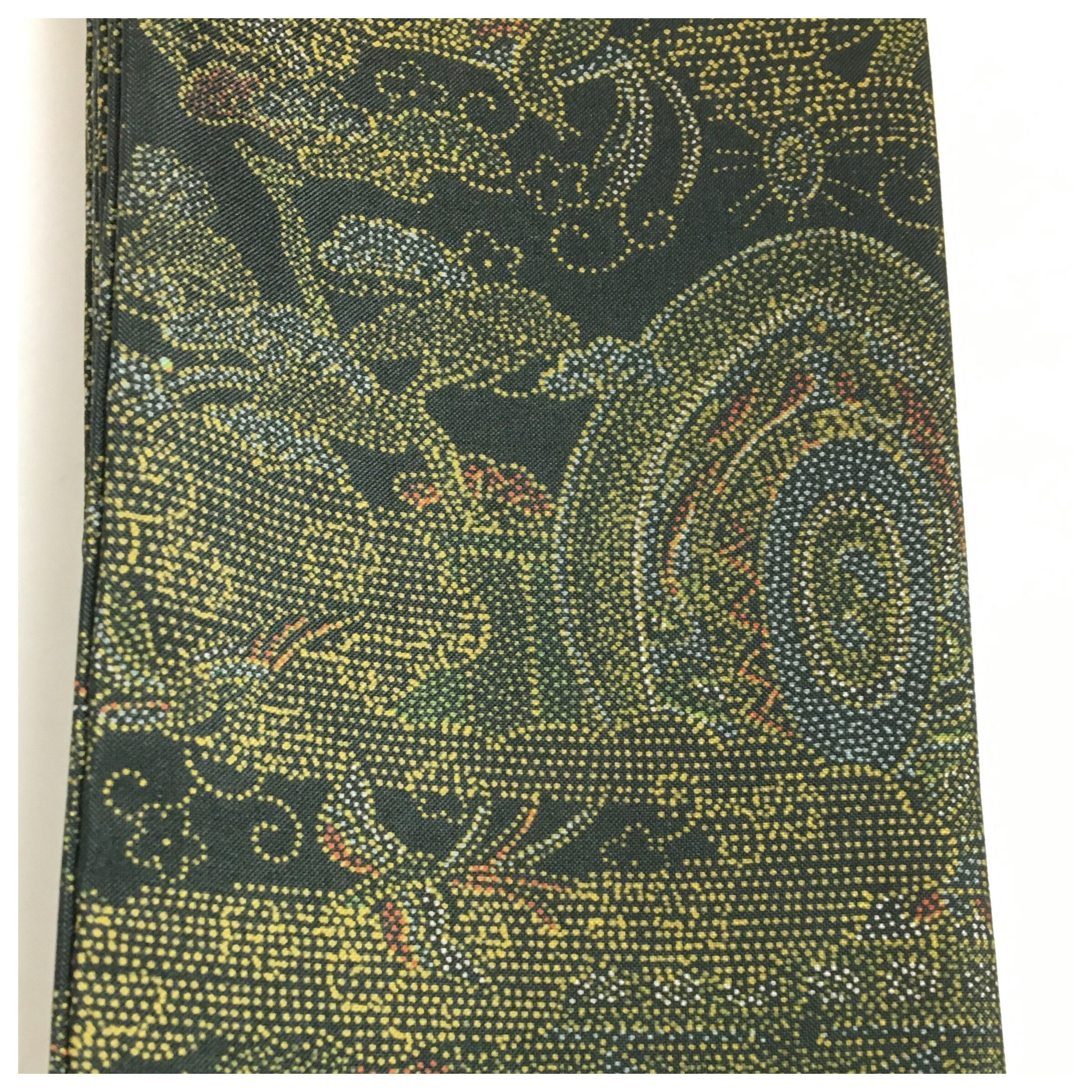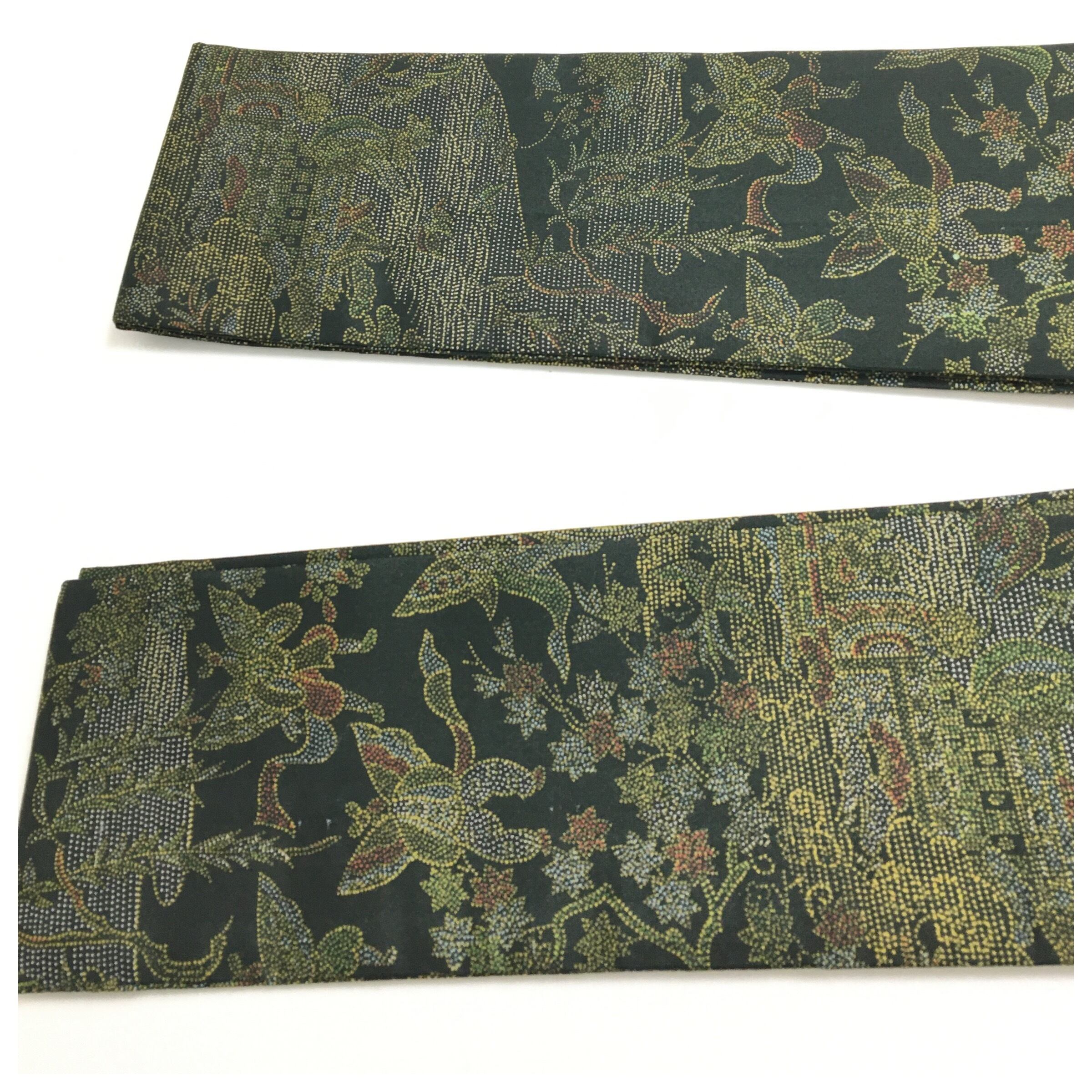 意匠には、伝統的な風景や文様が緻密な点描(ドット)のように表現された、奥行きのある古典柄が施されています。深みのある緑を含んだような黒の地に、豊かな色彩が浮かび上がる、非常に凝ったデザインです。