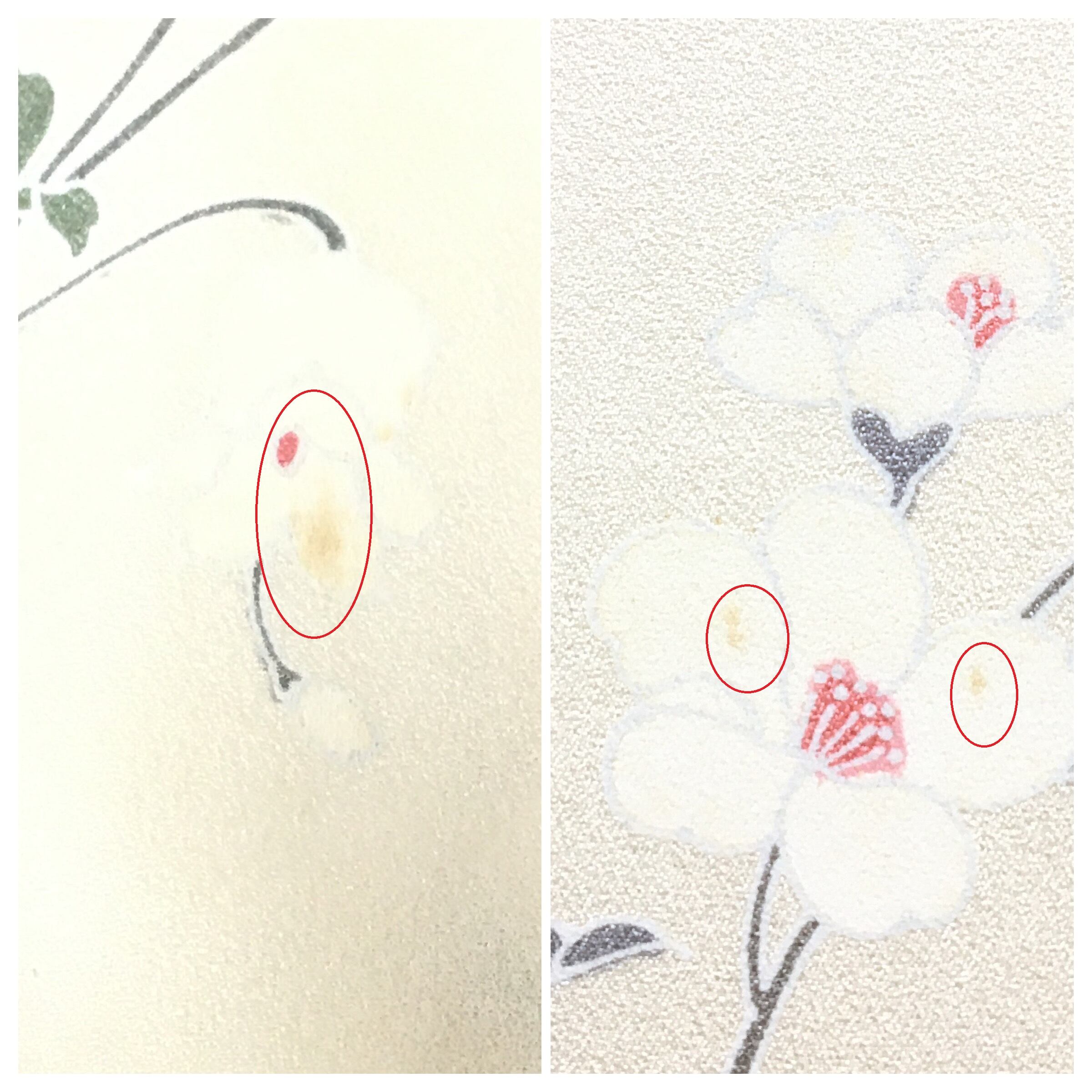 しつけ糸が残る未使用の美品です。保管によるものと思われる小さなシミが柄の中に数カ所紛れていますが、意匠が華やかなため着用時に目立つものではなく、全体としては非常に清潔感のある状態を保っております。完璧をお求めの方はご遠慮ください。