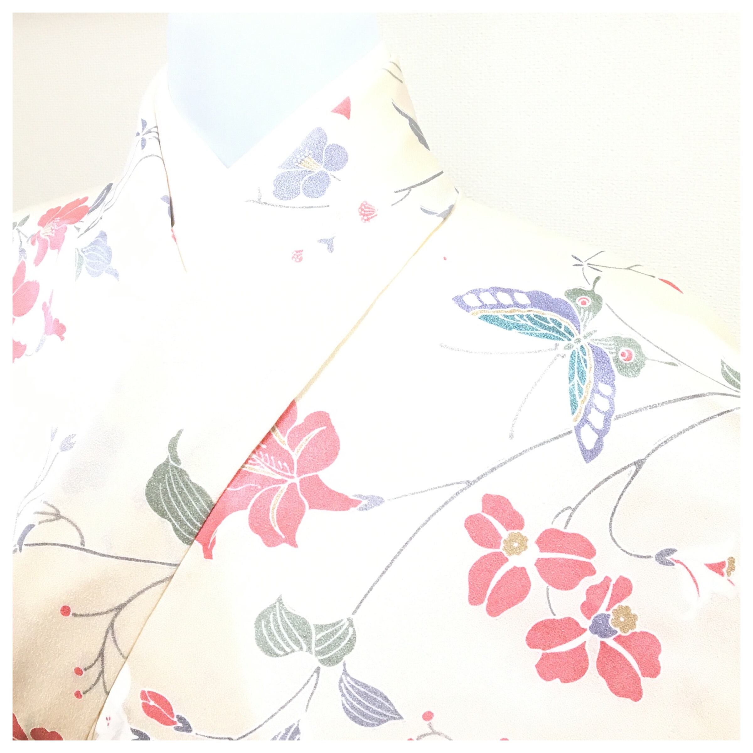柔らかなホワイトの地色に、軽やかに舞う蝶と四季折々の草花が散りばめられた、正絹の小紋です。蝶は「再生」や「健やかな成長」を意味する吉祥文様。彩り豊かな花々とともに描かれた意匠は、着る人の心を弾ませるような明るい雰囲気を醸し出します。