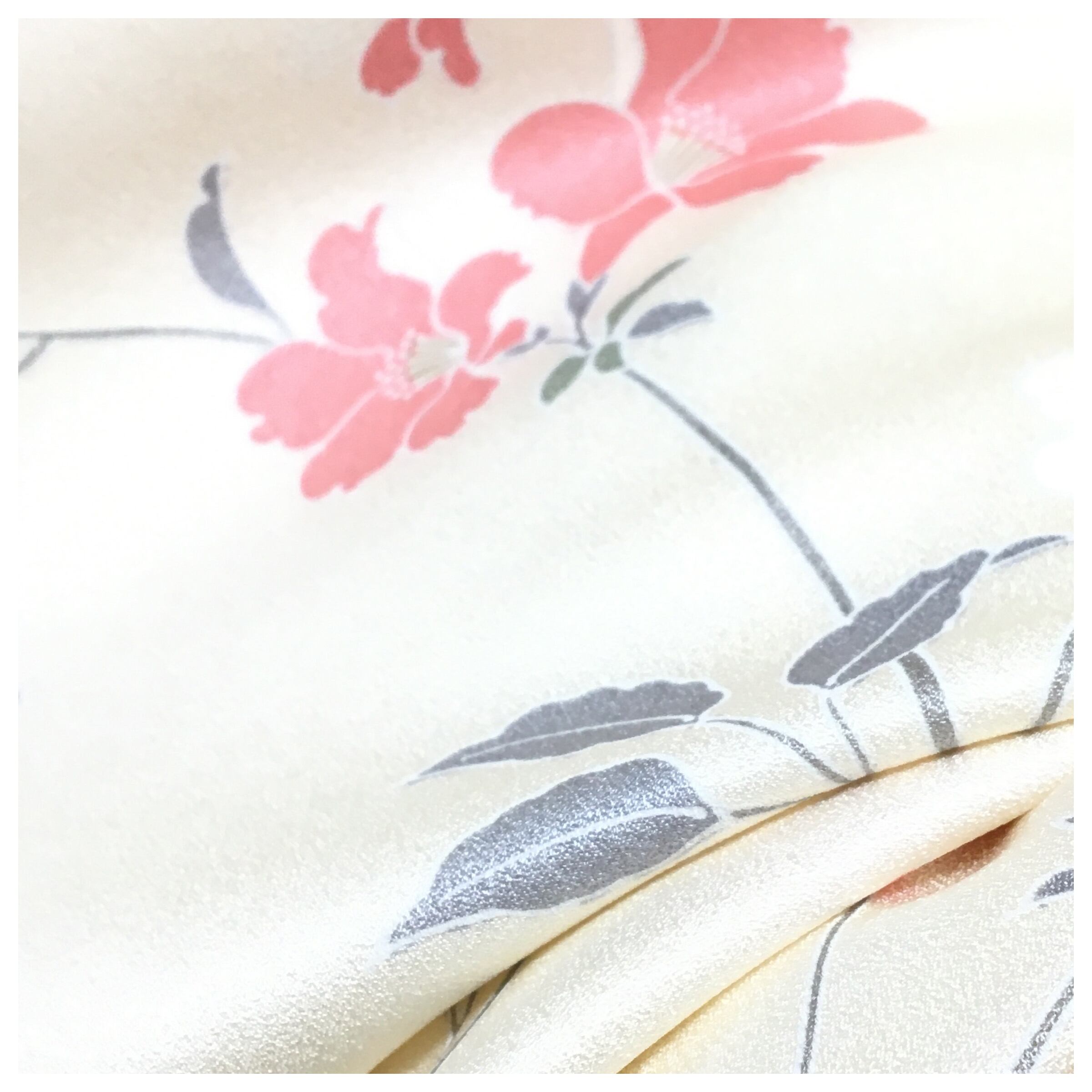 季節を問わない四季草花の柄ゆきですので、帯揚げや帯締めなどの小物使いを季節に合わせて変えることで、年間通して長くお召しいただけます。