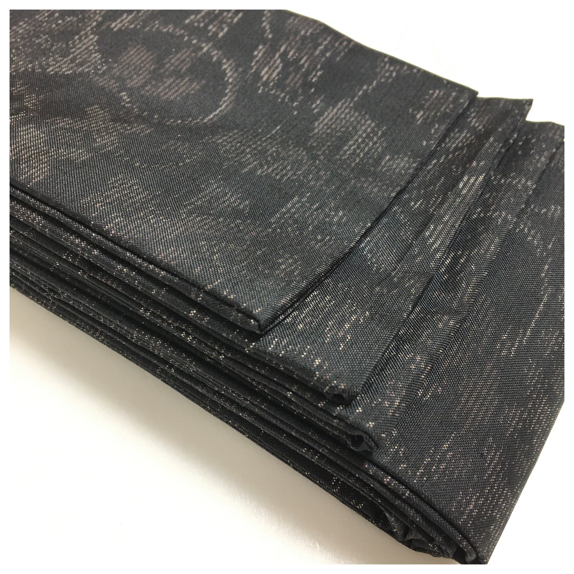御召ならではの艶やかな質感と、えめな光沢が特徴。黒地に同系色の濃淡で幾何学的な文様が織り出されており、光の加減で文様が浮き立つ、非常にシックで個性ある仕上がりとなっています。