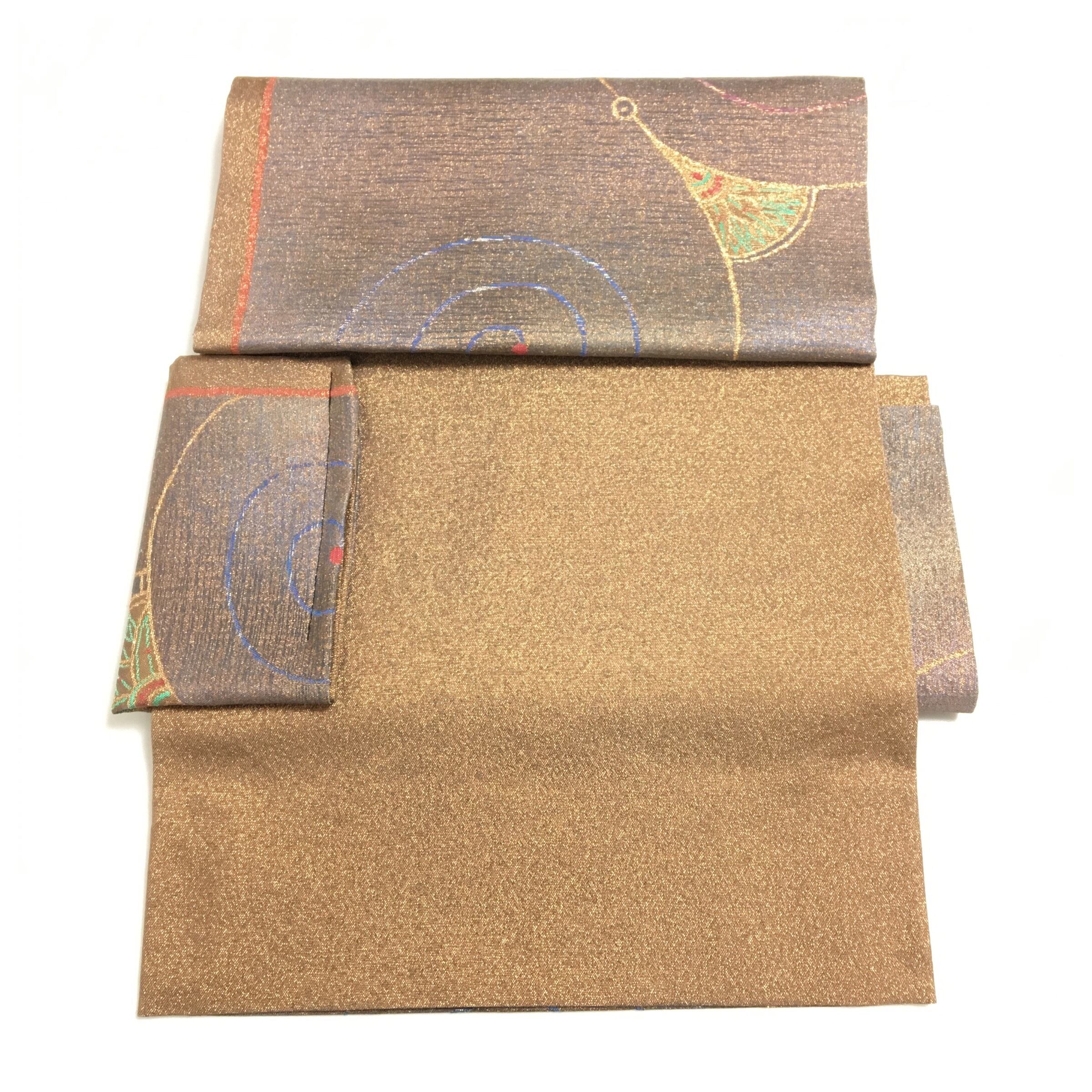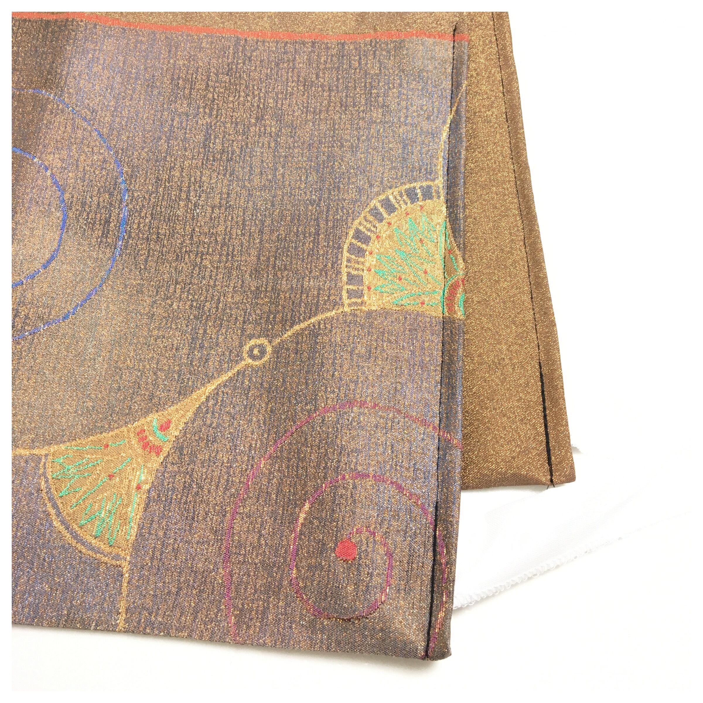 美品 正絹 作り帯 袋帯 ブロンズ 金糸の煌めきが映える二重太鼓 付け帯 螺旋模様