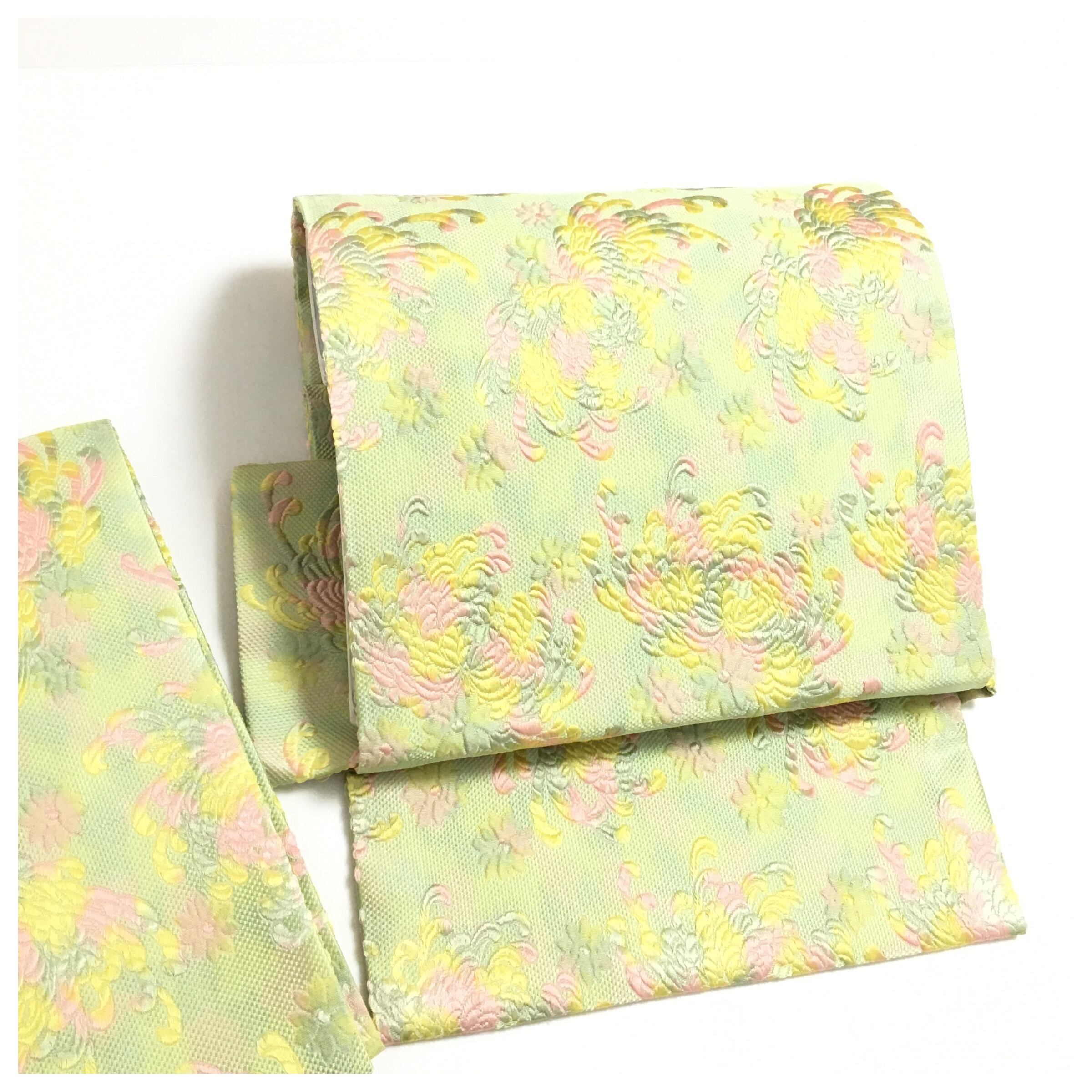 明るく柔らかな黄緑色の地に、ピンクやイエローの糸でふっくらと織り出された華文様が美しい二部式名古屋帯です。
