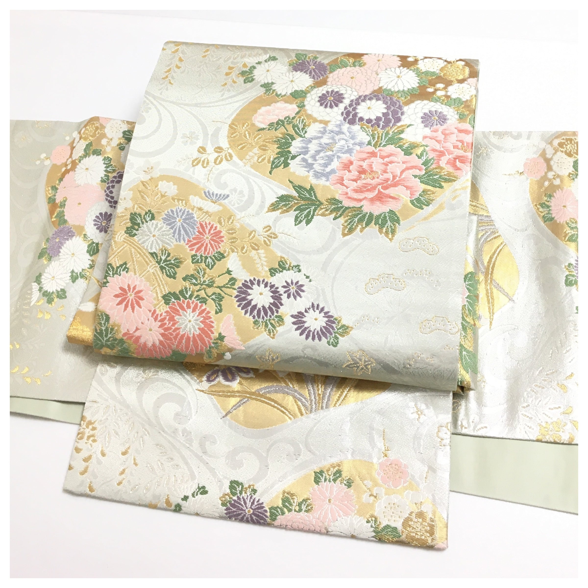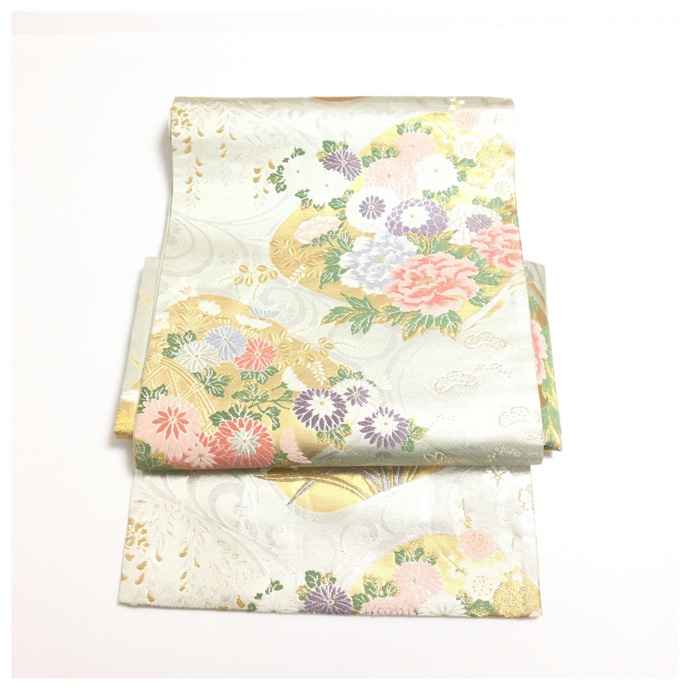 素材にこだわり、正絹を使用した作り帯です。薄く淡いグリーンがかった上品な地色に、金糸や色糸で精緻に織り出された華紋と四季折々の花々が、帯全体を華やかに彩ります。