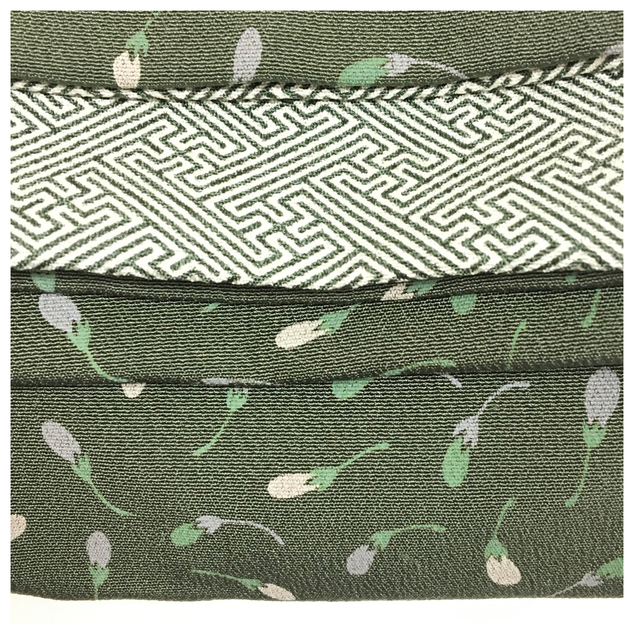 深緑の茄子柄は、ベージュや茶系、グレー系のお着物と合わせると、渋さの中に個性が光るコーディネートになります。裏面の紗綾形はモノトーンや紺系のお着物と相性が良く、キリッとした端正な印象を与えます。