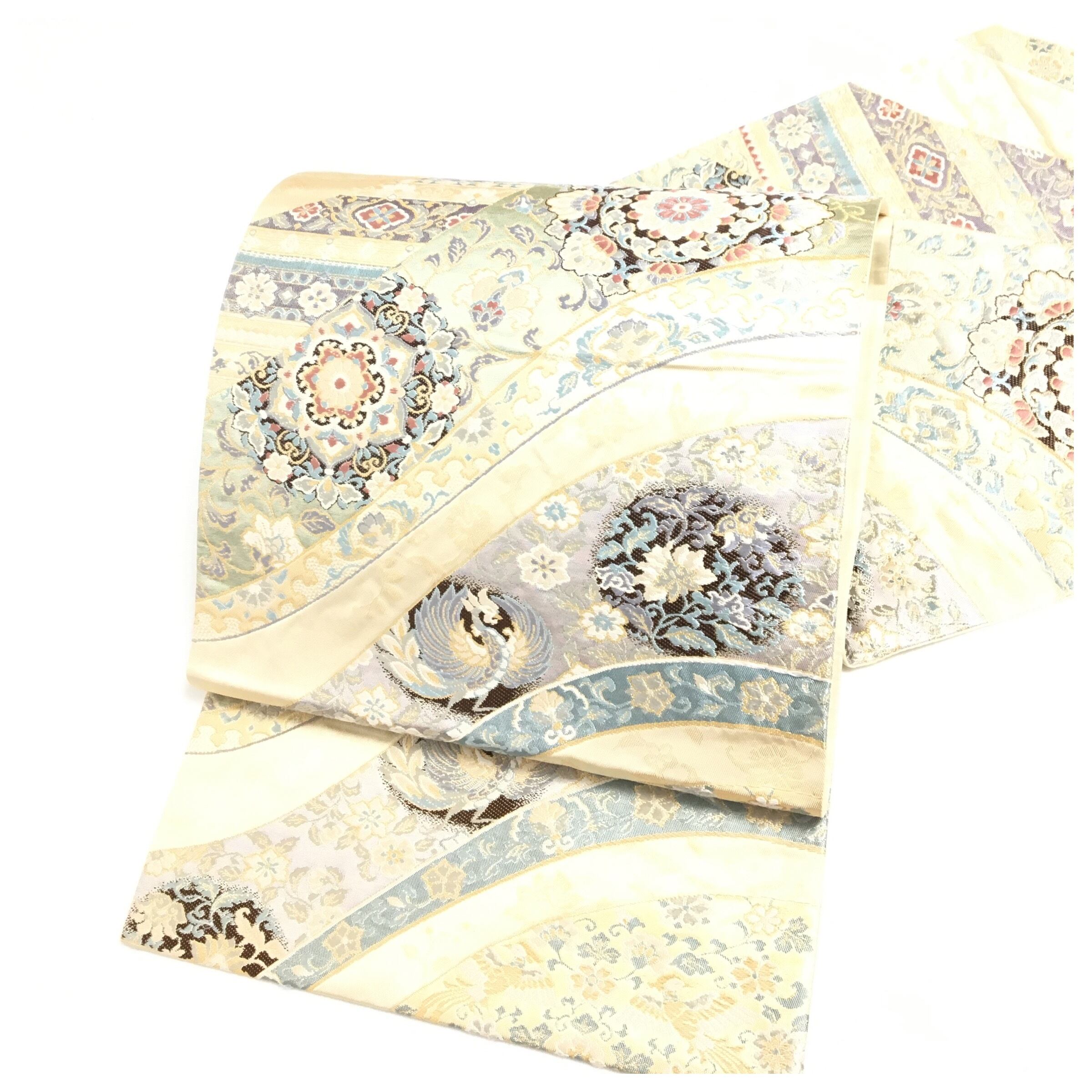 上質な正絹を使用した、格調高い袋帯です。優しいクリーム地に、優美に舞う「鳳凰」と「華紋」が金銀糸を交えて豪華に織り出されています。西陣織に代表されるような、緻密な紋織技術による立体感と奥行きが感じられる一本です。