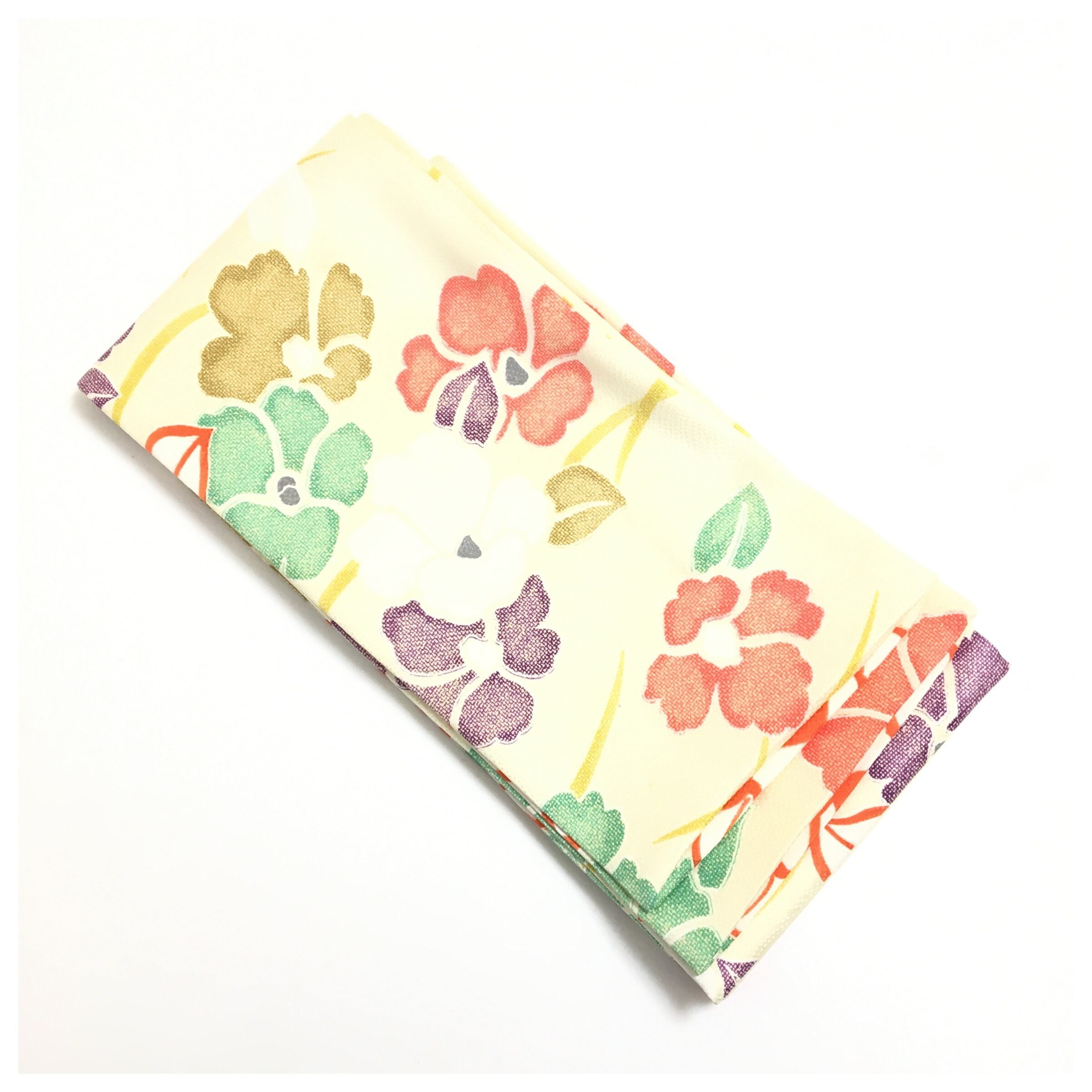 優しいクリーム色の正絹地に、赤、紫、緑など多色使いの花々が可憐に咲き誇る創作半幅帯です。季節を問わず通年お使いいただけます。柔らかな色彩で描かれた花々が、帯全体に明るく華やかな印象を与えています。