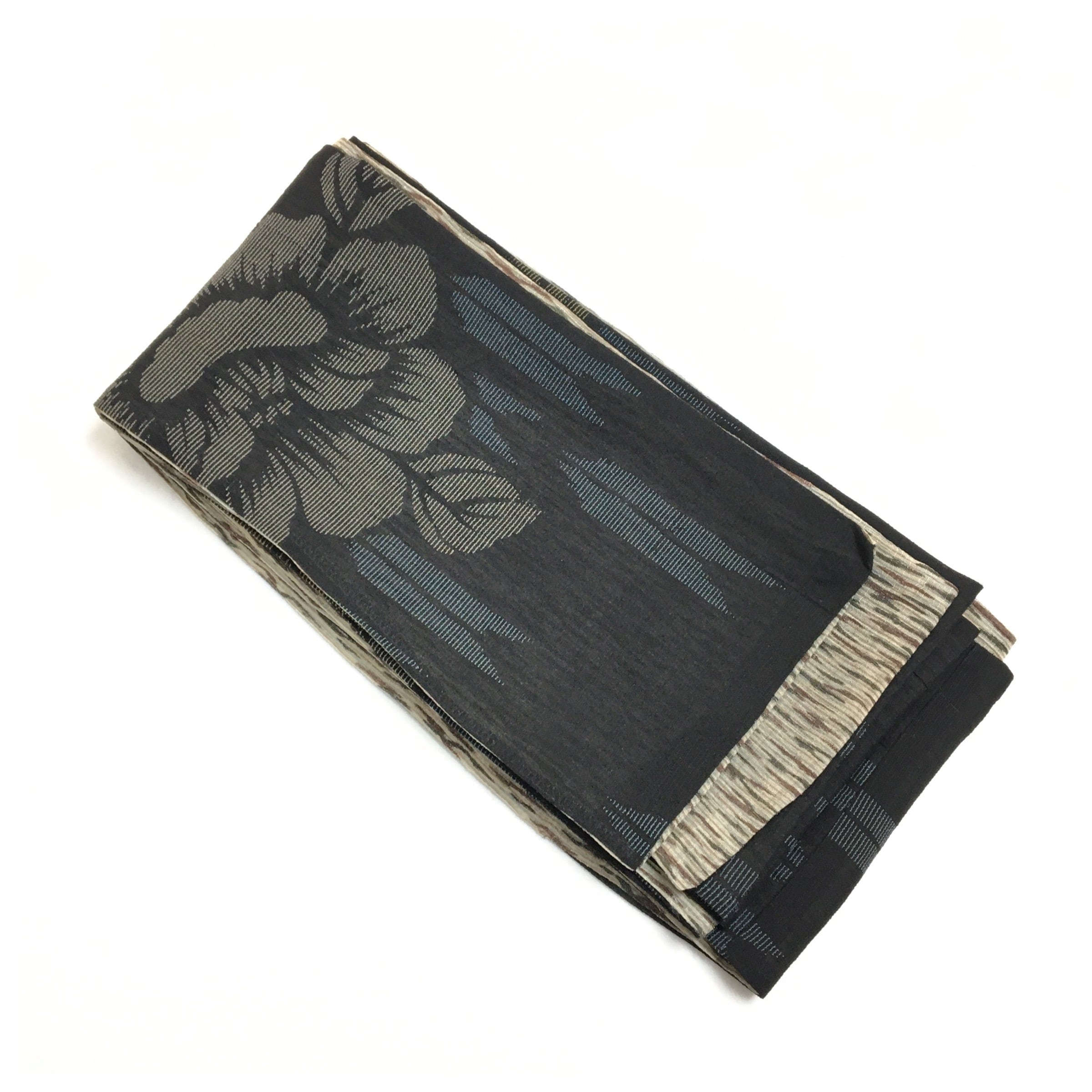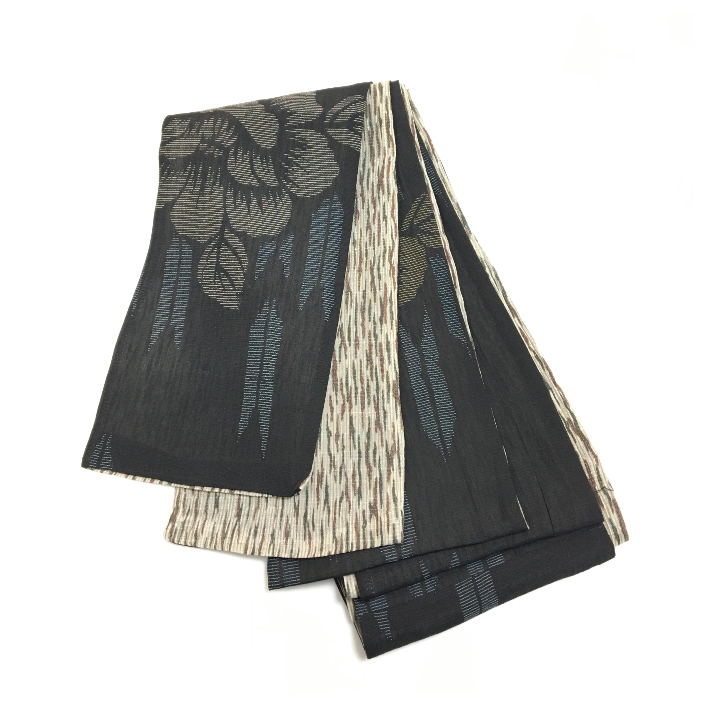 夏の御召(おめし)着物を解き、現代の装いに合わせて再構築した創作兵児帯です。黒地にモダンな大輪の花模様と、涼やかな絣(かすり)模様がリバーシブルに組み合わさった、存在感のある一品。アンティークならではの、深みのある色彩と織りの表情が魅力です。