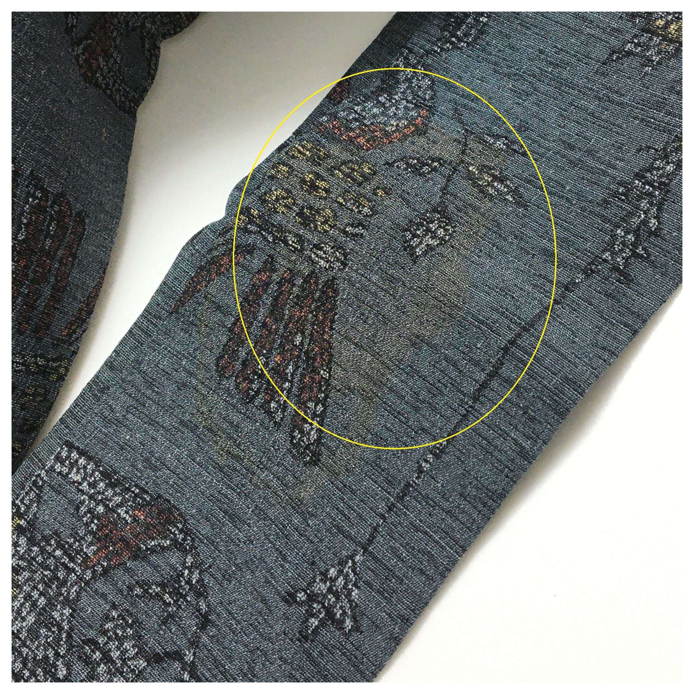 一部に汚れが見受けられます。画像にて詳細をご確認ください。着用時に巻く位置や結び方によって隠れる場合もございますが、体格や感じ方には個人差がございます。アンティーク生地を用いたリメイク品としての風合いをご理解いただける方におすすめいたします。